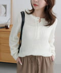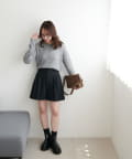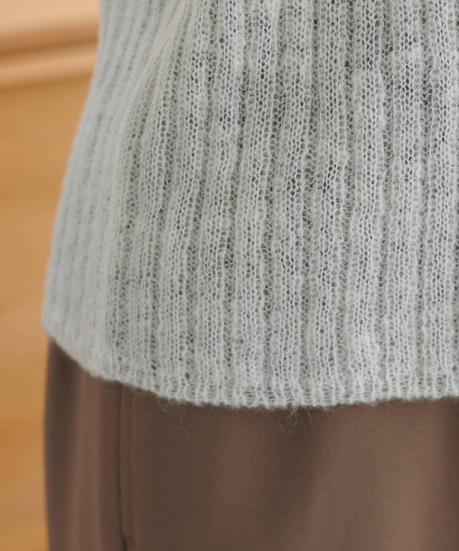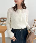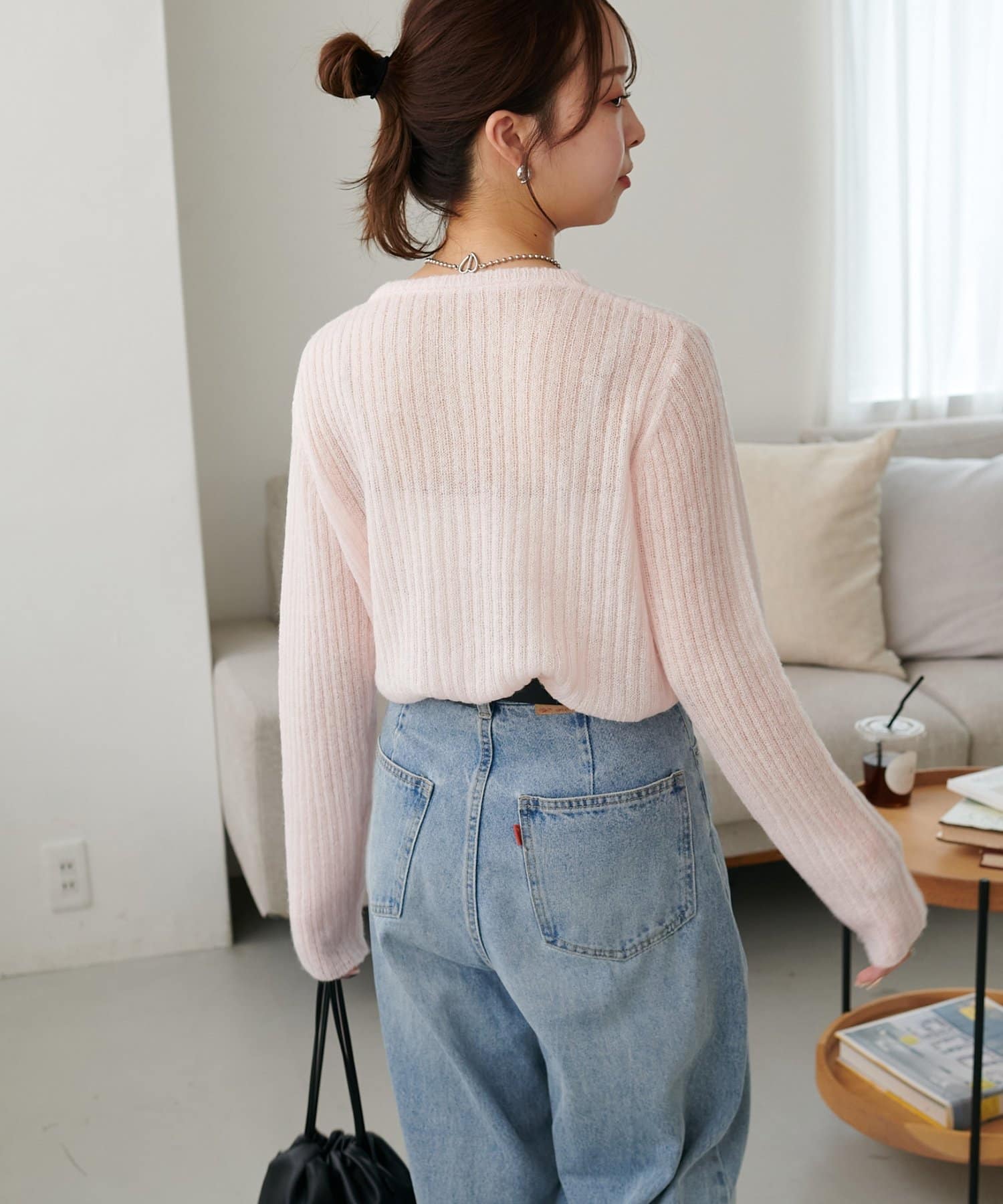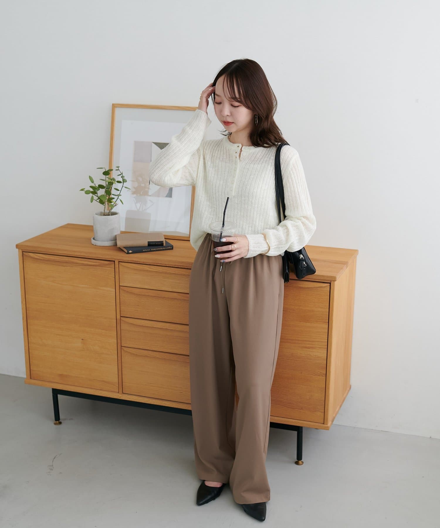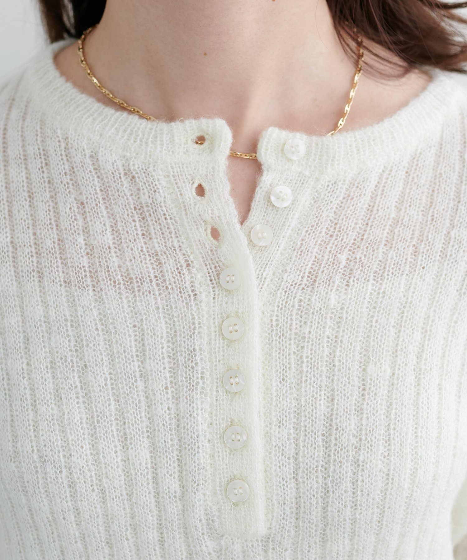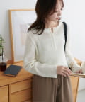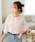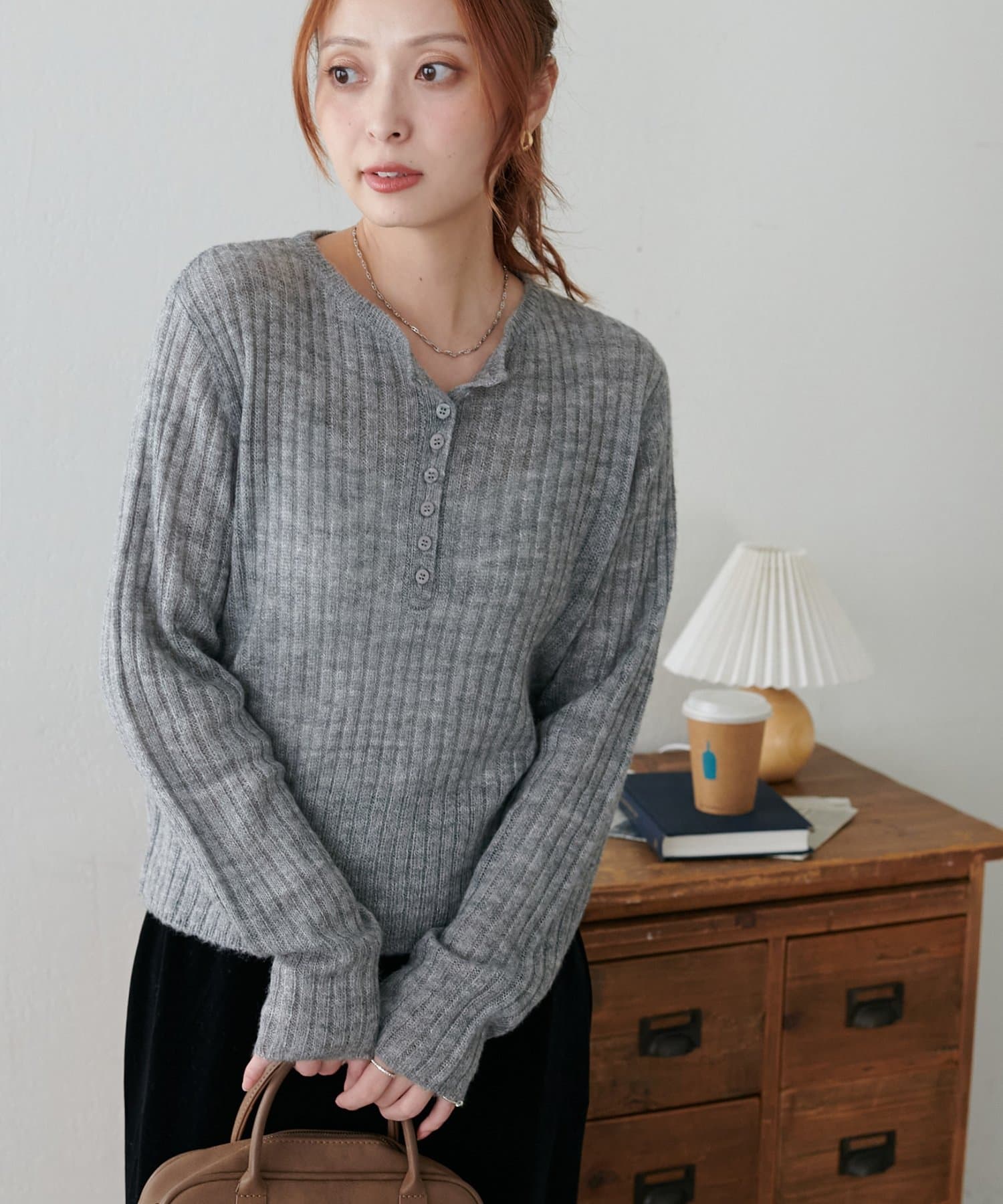 153cmスタッフ:首元のボタンを少し開けて抜け感を出すと、顔まわりがすっきりするのでおすすめ◎ モヘアタッチのふわっとした肌触りがとても気持ちよく、軽い着心地でストレスなく着られました。