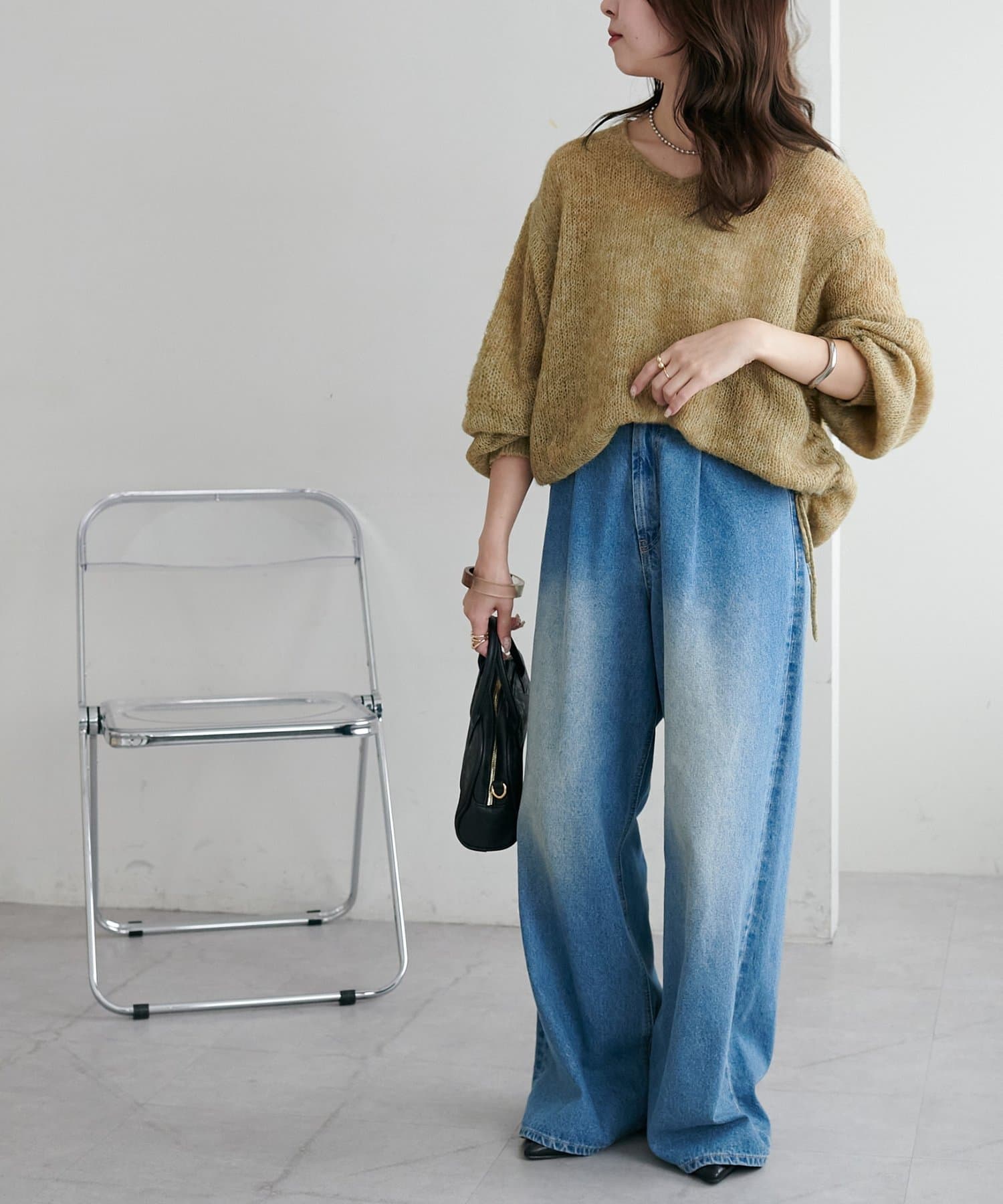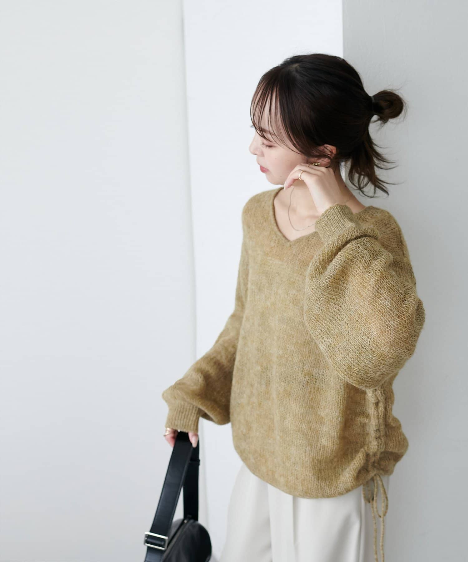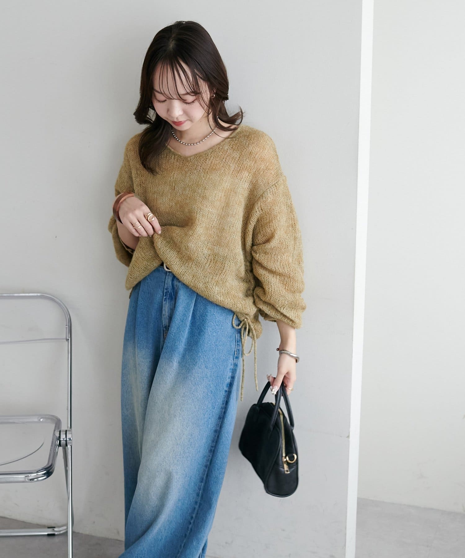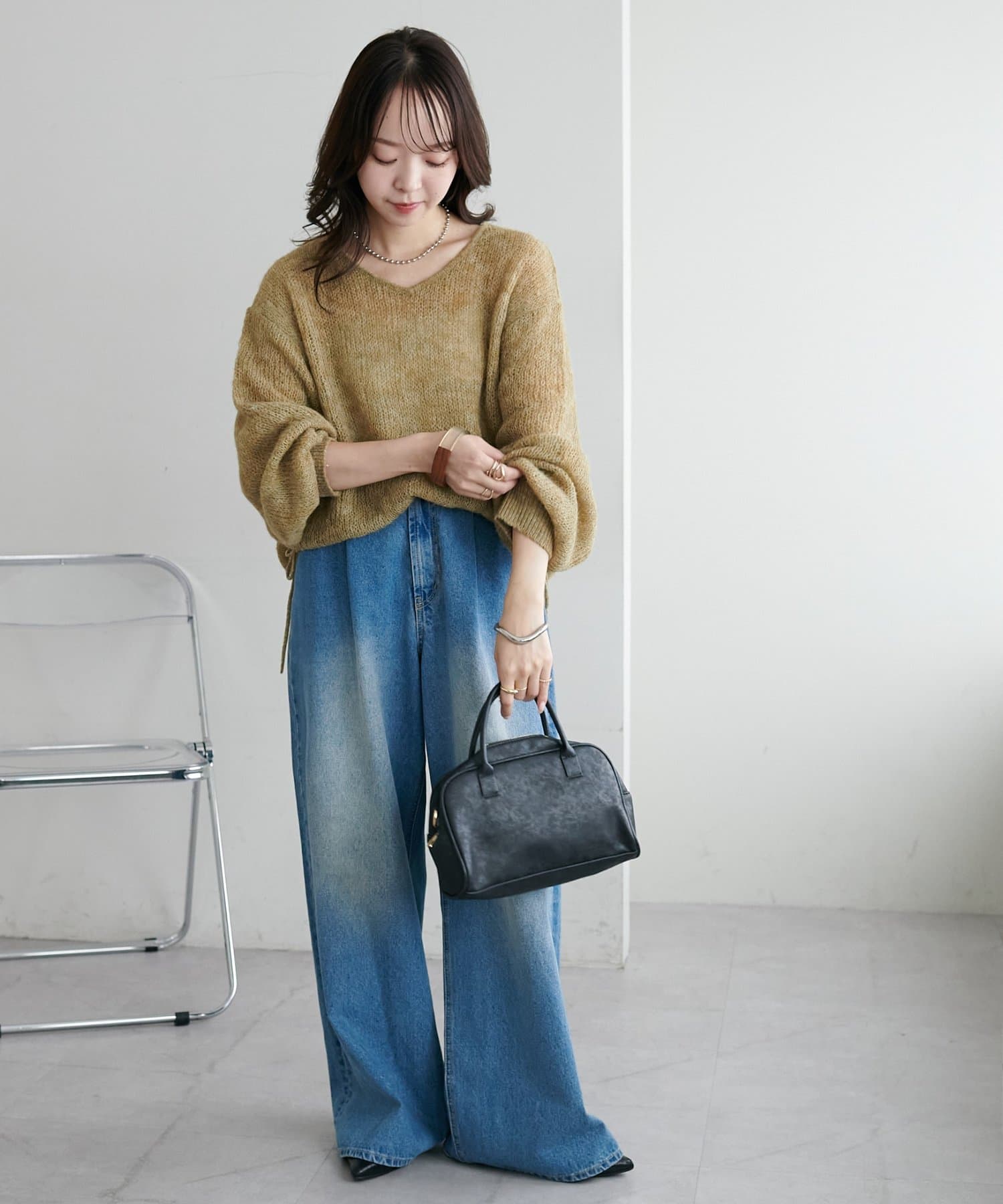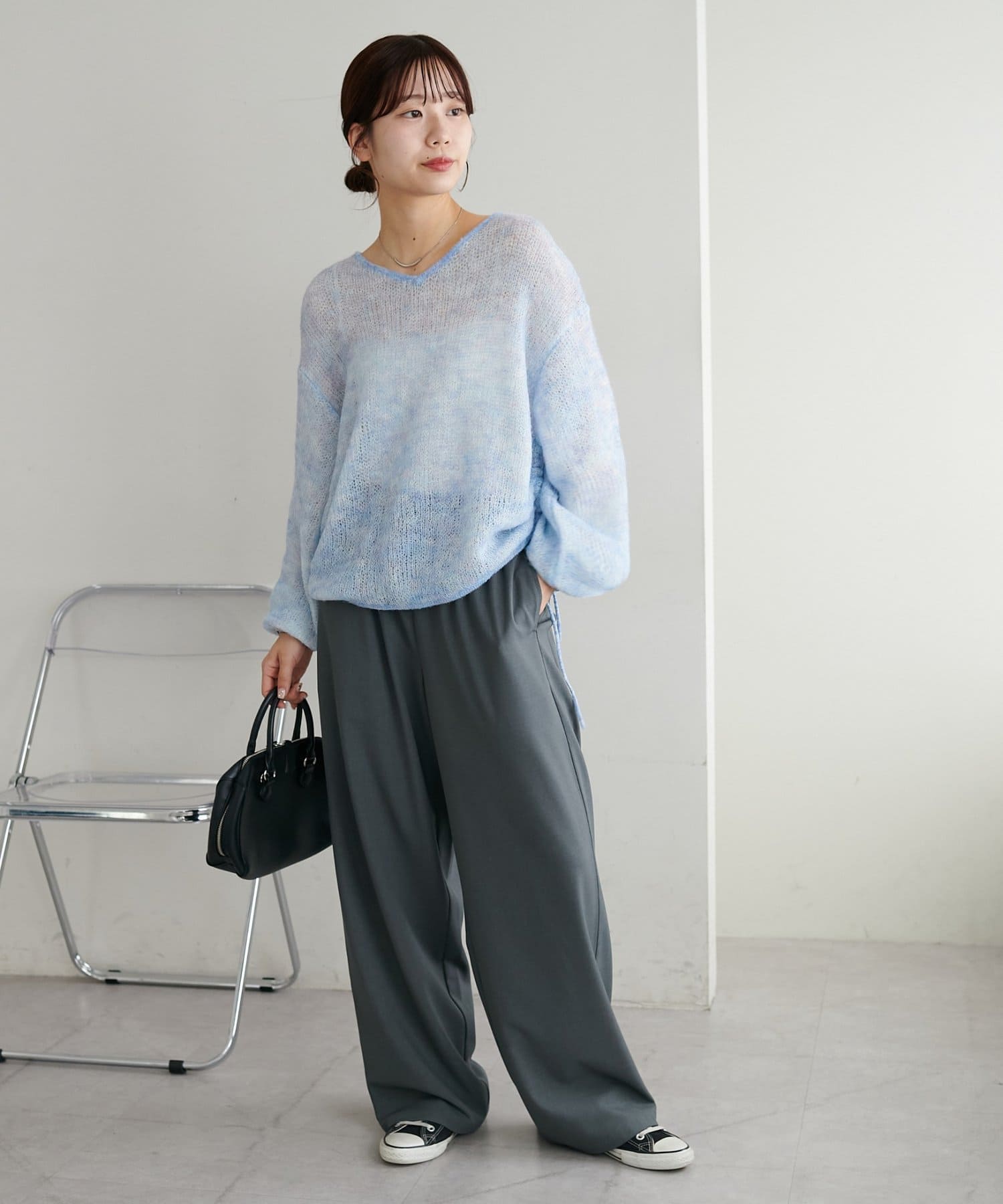 ボリューム感のある袖やゆとりのある身幅ですが、透け感とvネックになっていることで抜け感が出るので秋口からすぐコーデに取り入れられそうです。