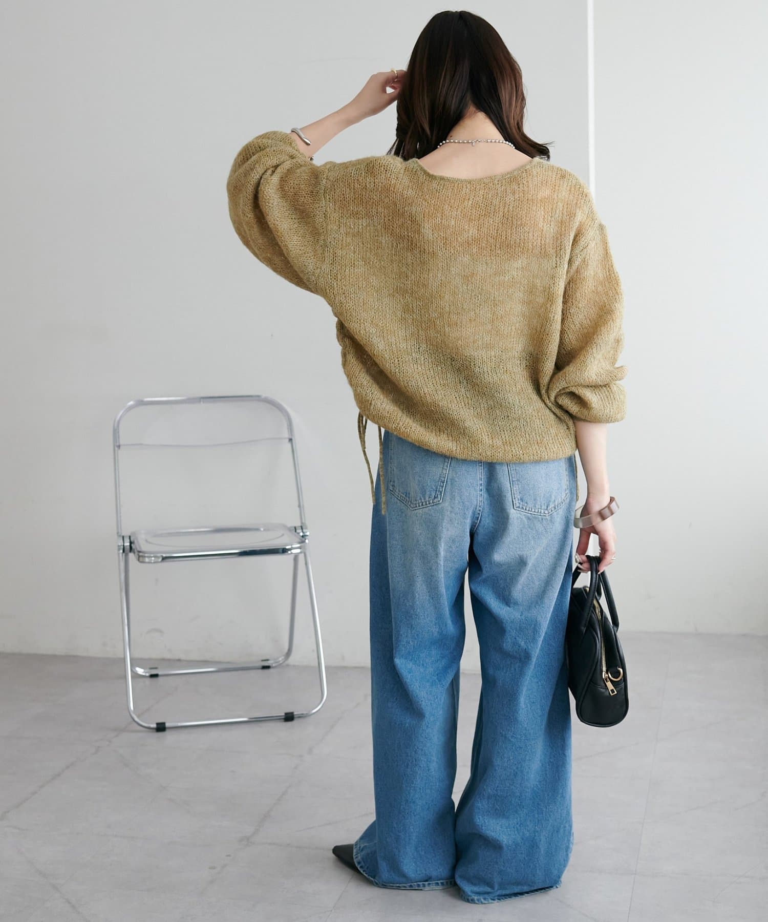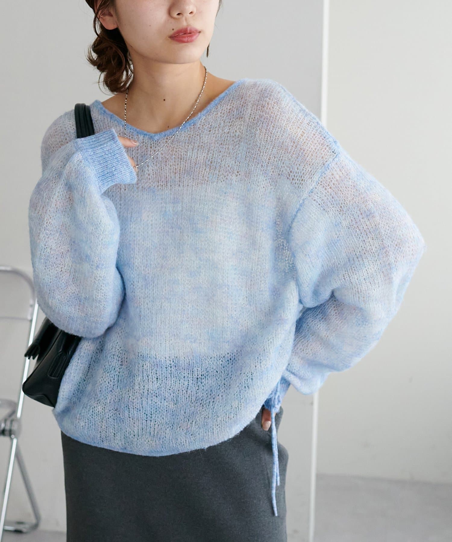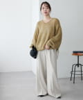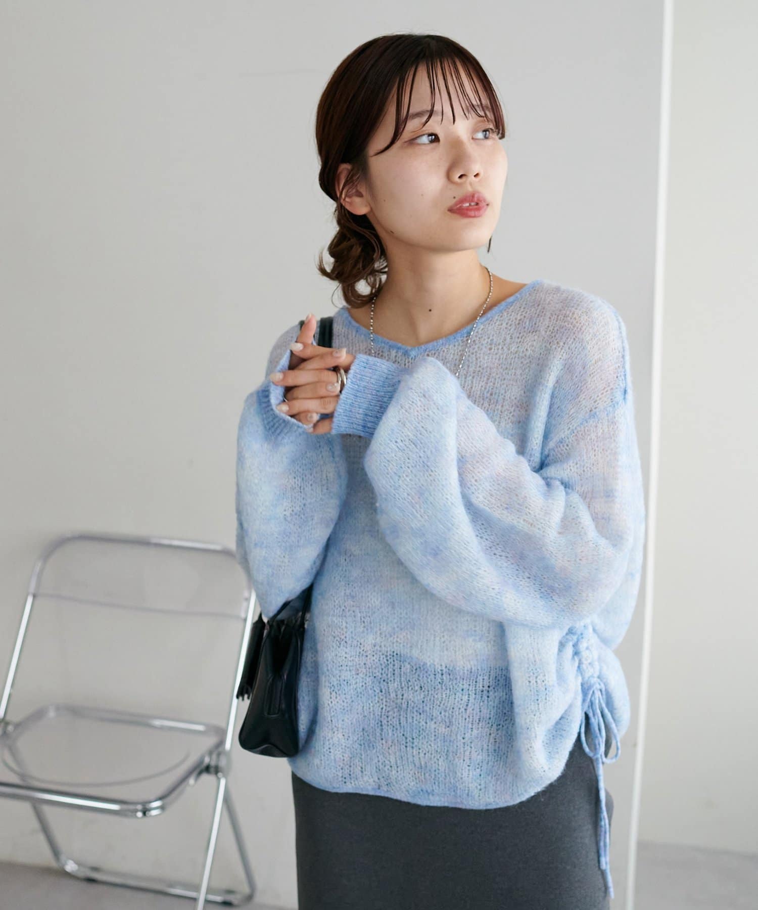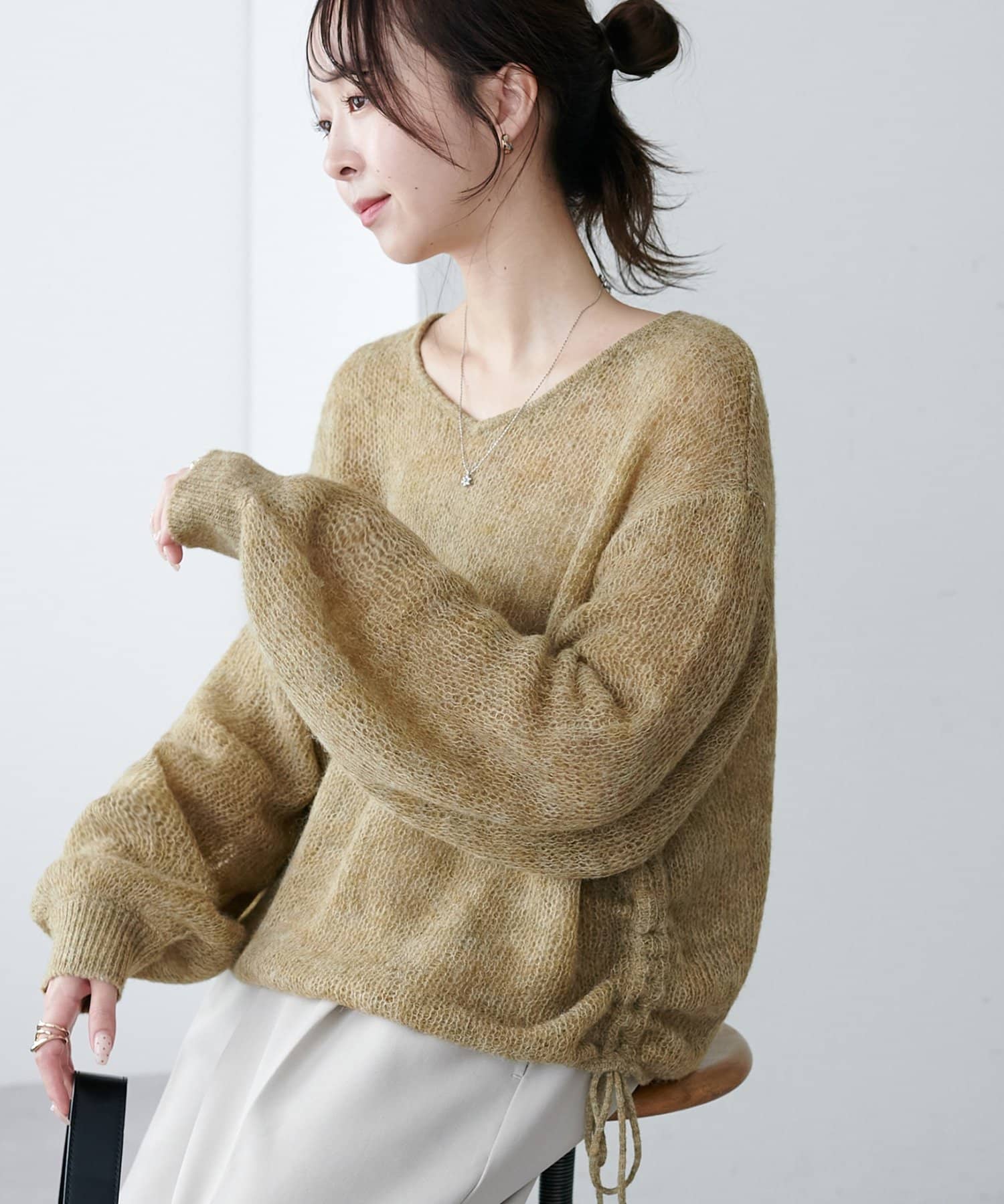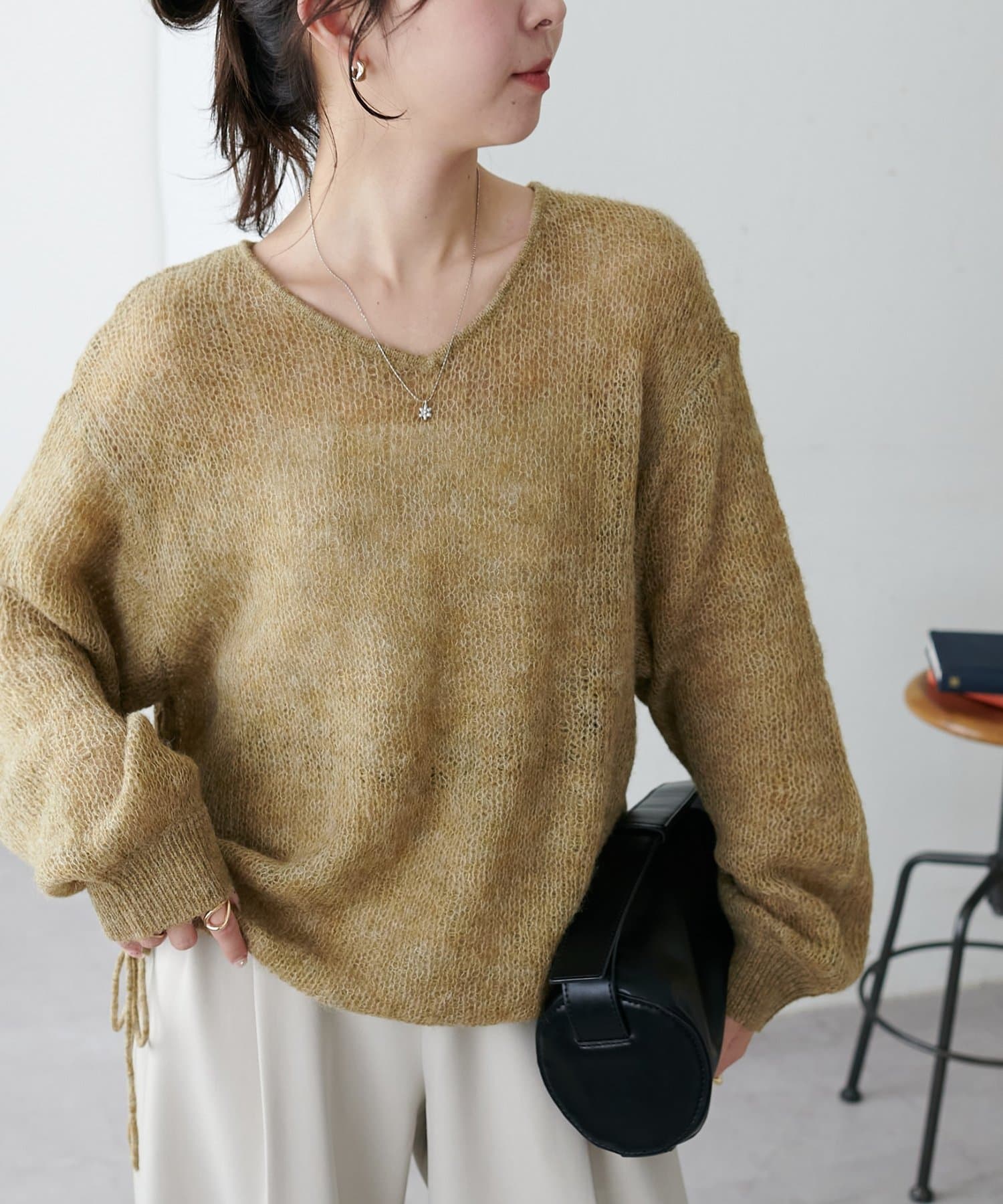 ボリューム感のある袖やゆとりのある身幅ですが、透け感とvネックになっていることで抜け感が出るので秋口からすぐコーデに取り入れられそうです。