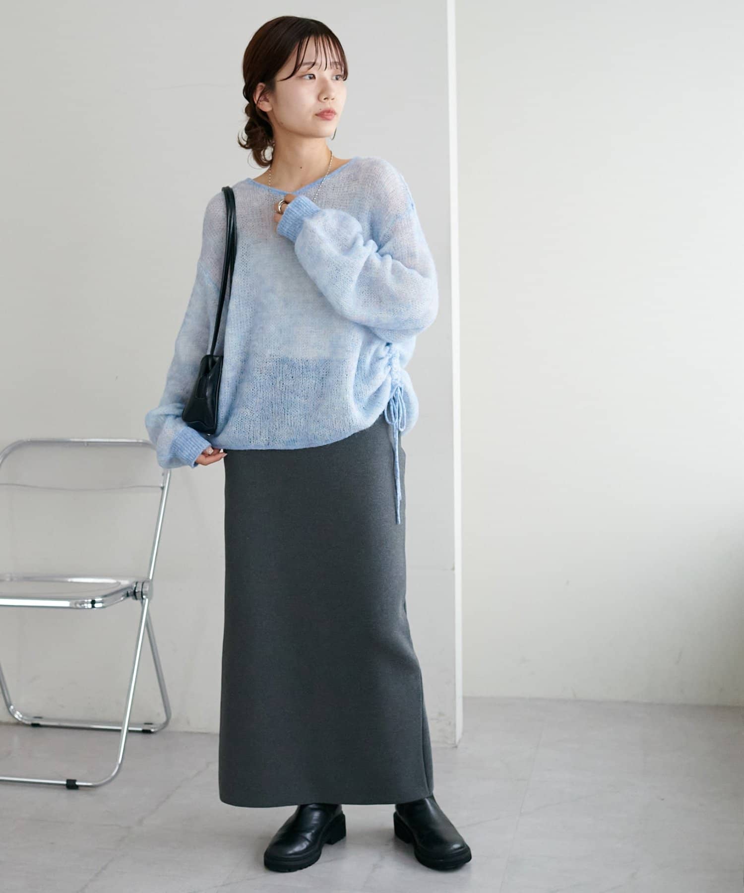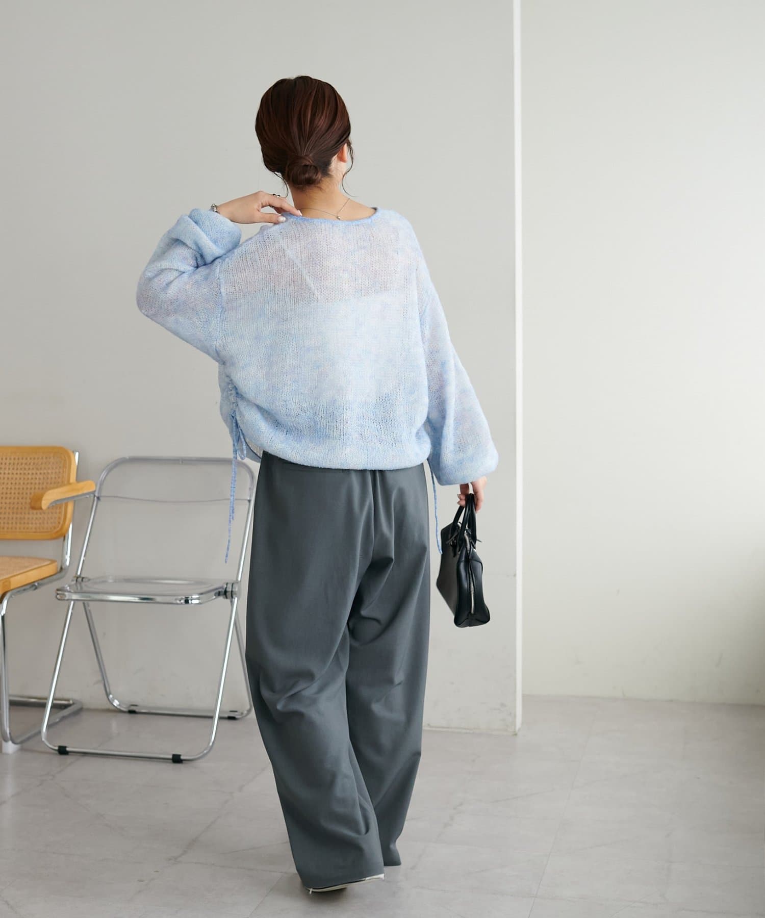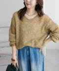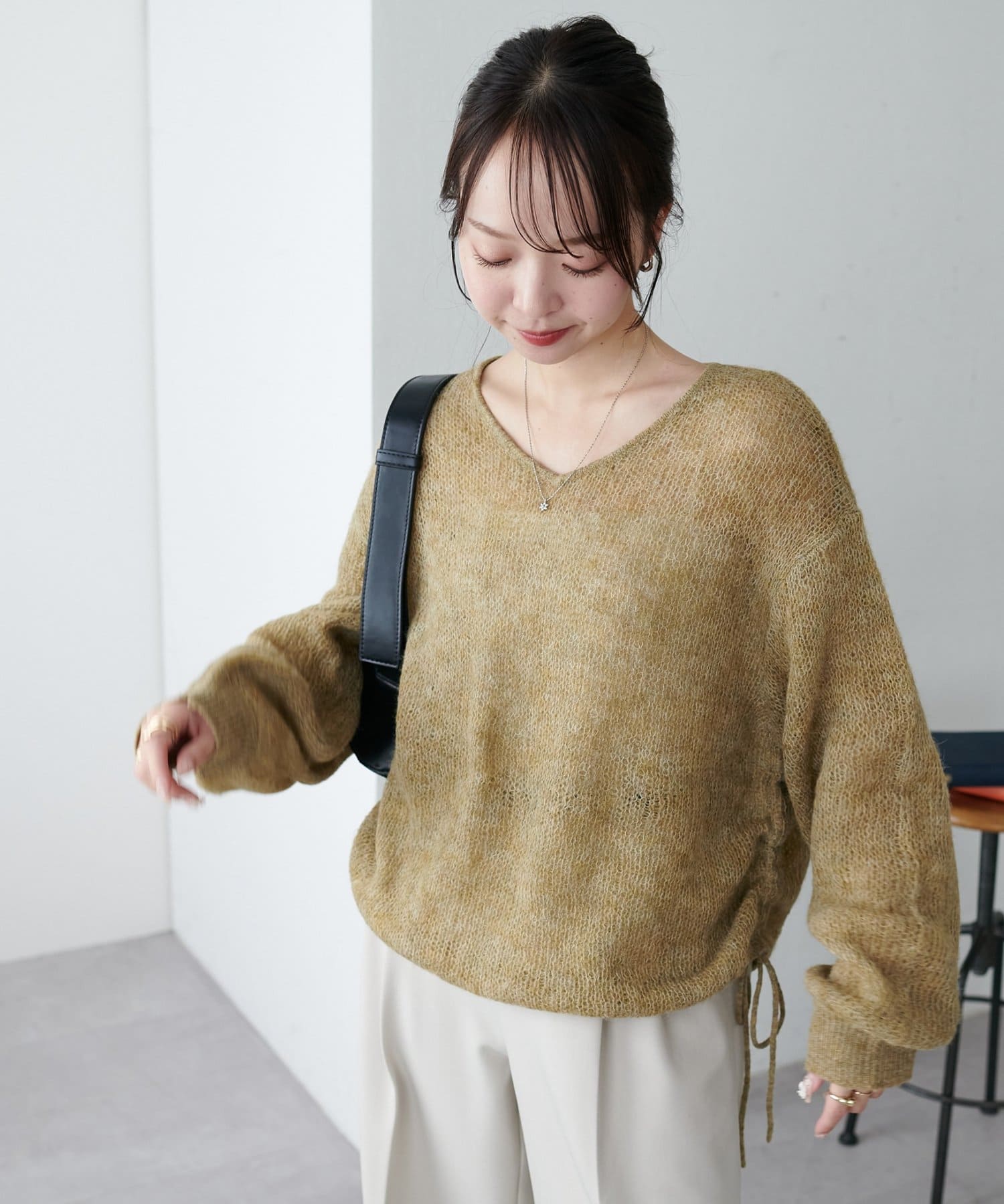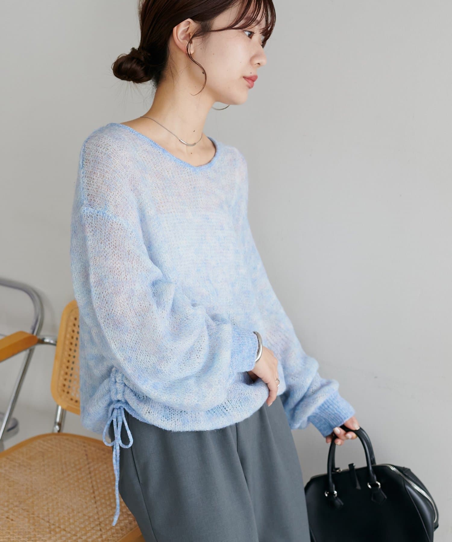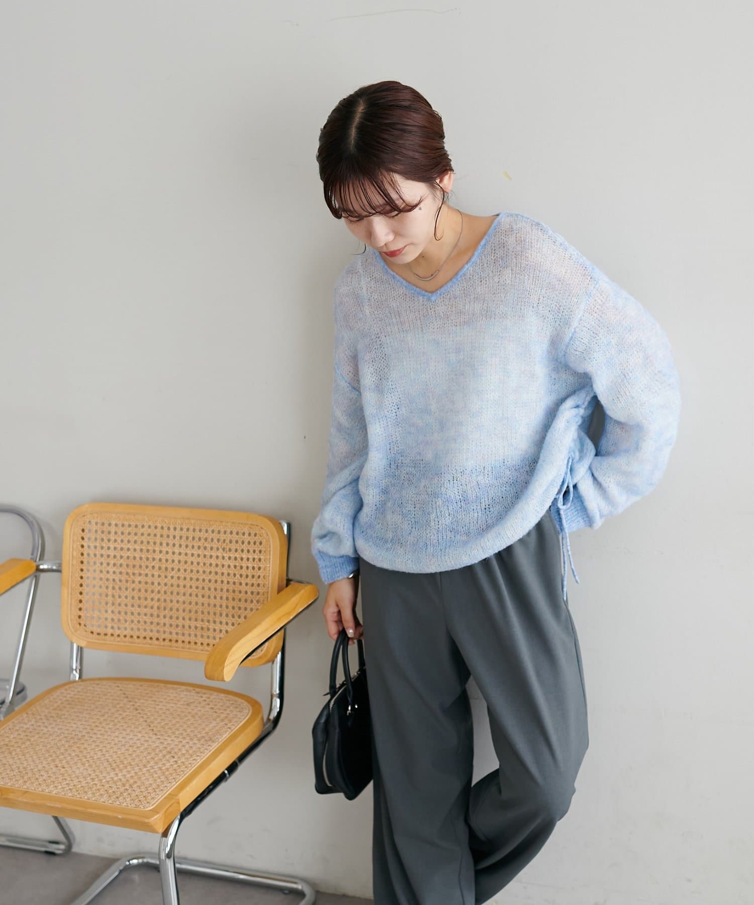 ボリューム感のある袖やゆとりのある身幅ですが、透け感とvネックになっていることで抜け感が出るので秋口からすぐコーデに取り入れられそうです。