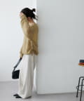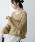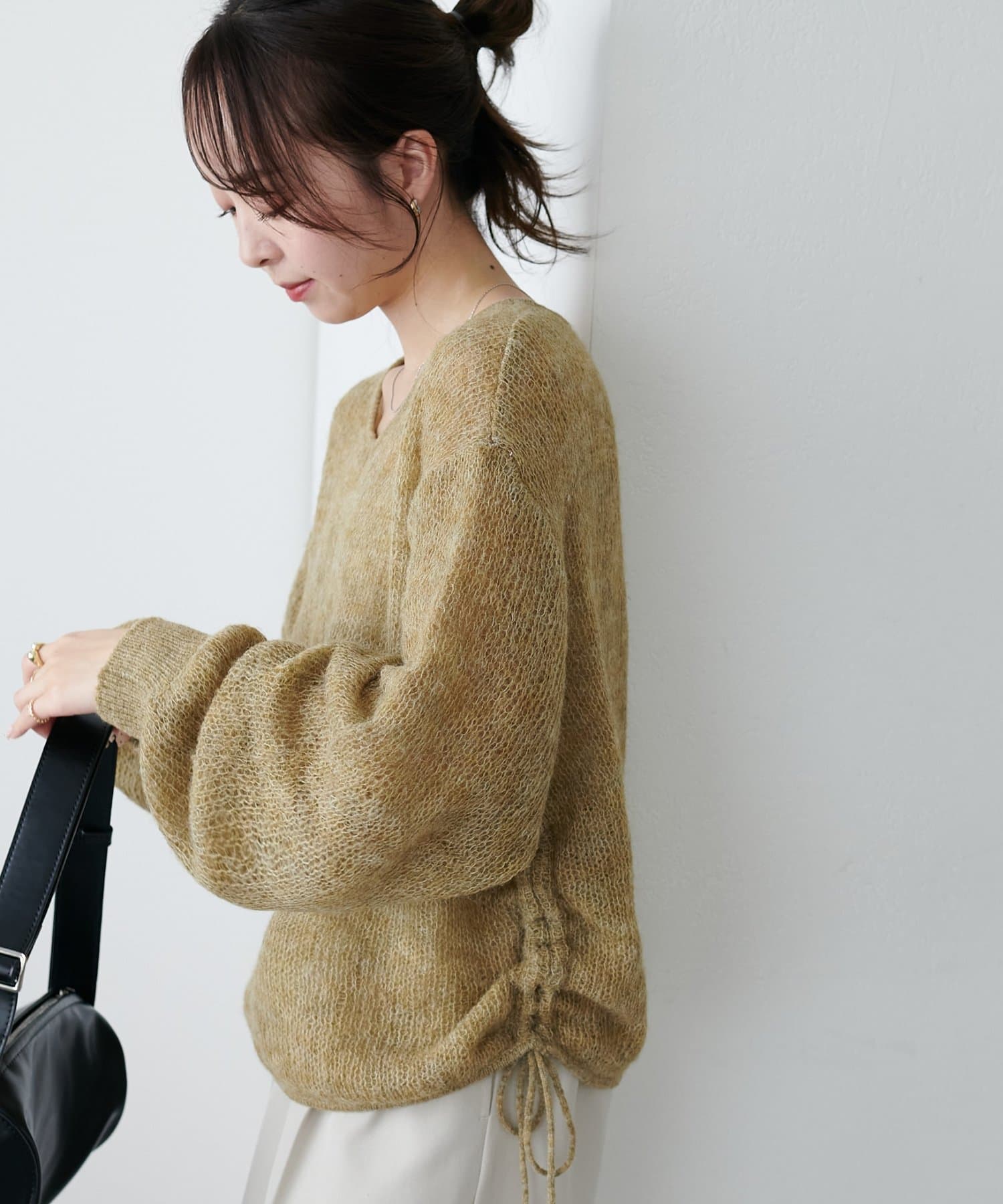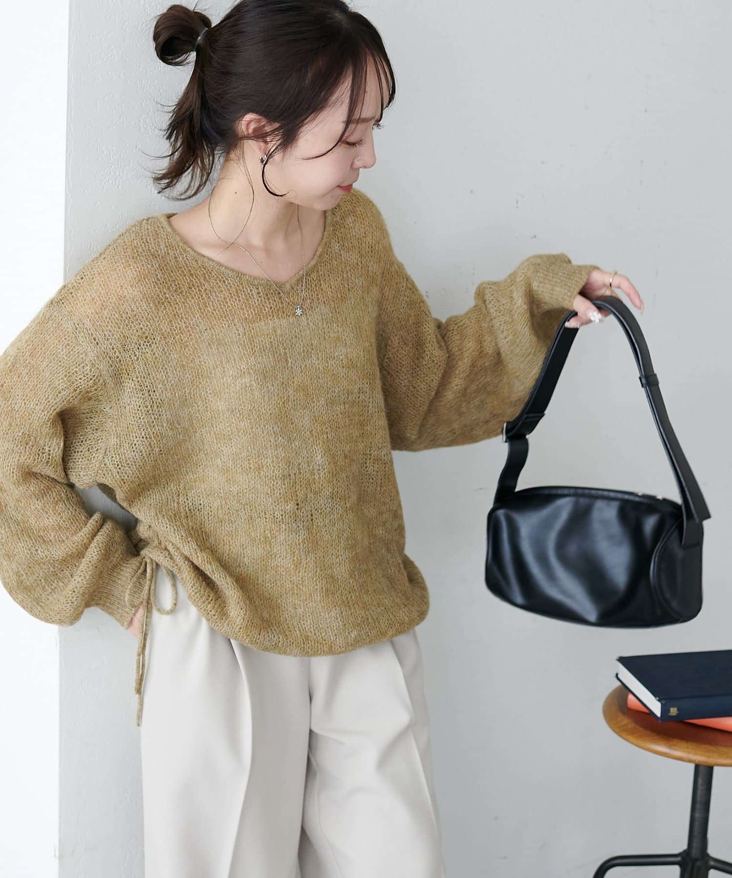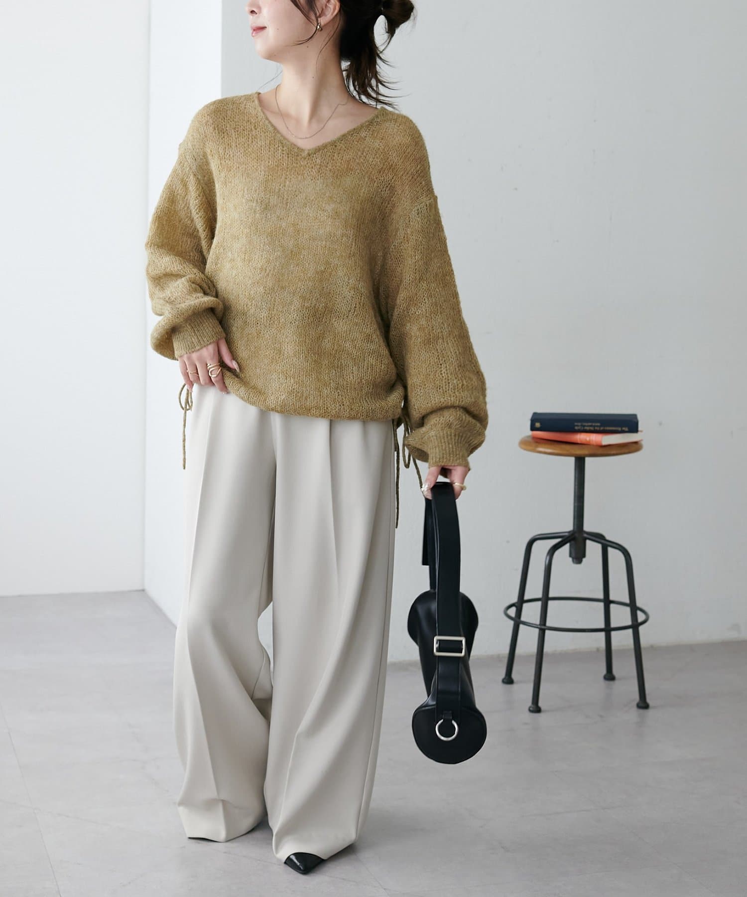 vネックのすっきりとしたデザインとボリューム袖のバランスがメリハリのある印象を高めてくれます〇