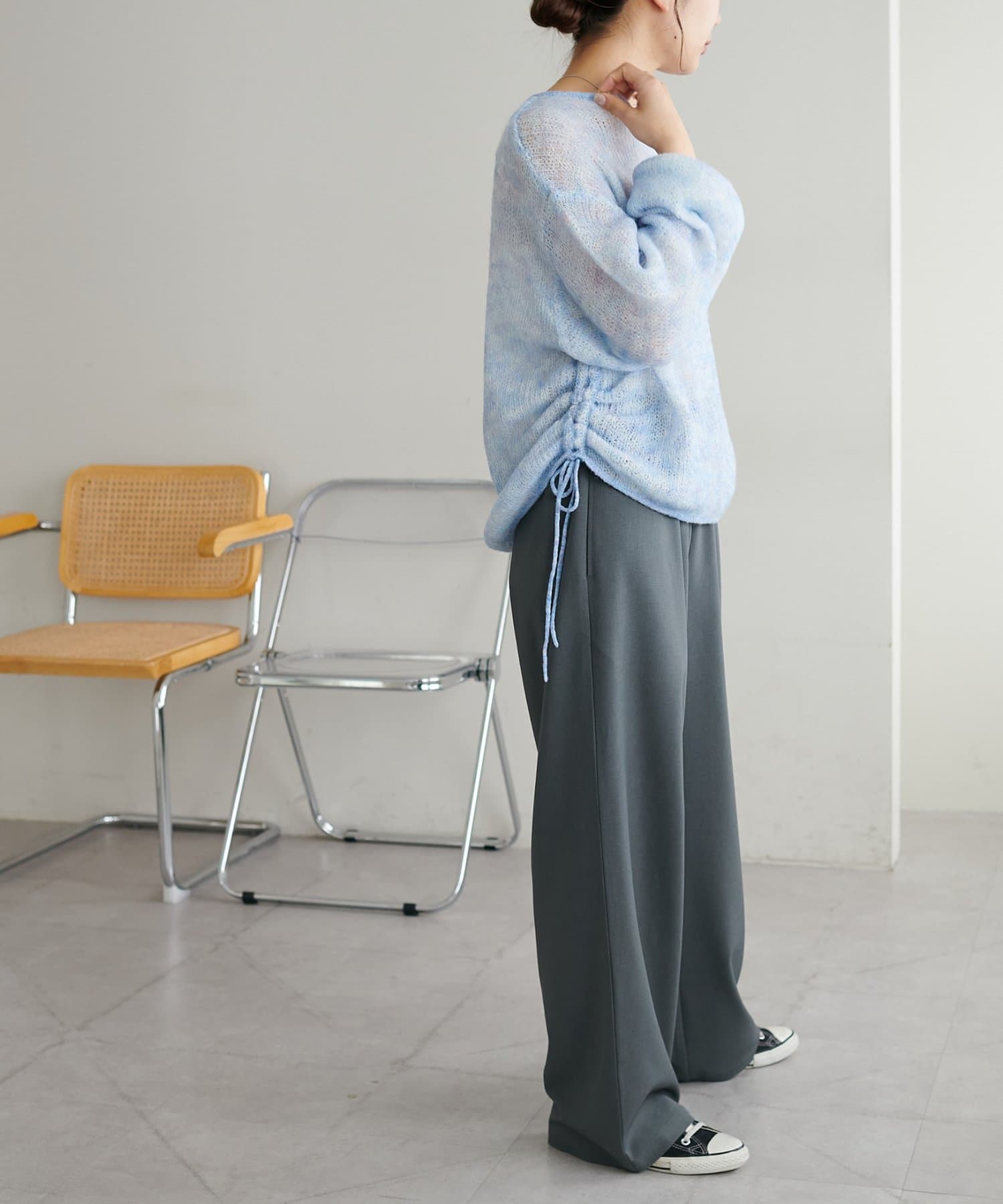 150cmスタッフ:サイドのギャザーを調節することで、着丈が調節できます。抜け感が出るので、低身長の私でもアウトスタイルでも着こなせるのが嬉しいです!