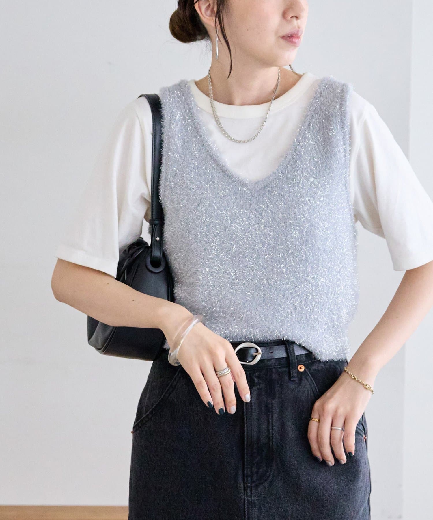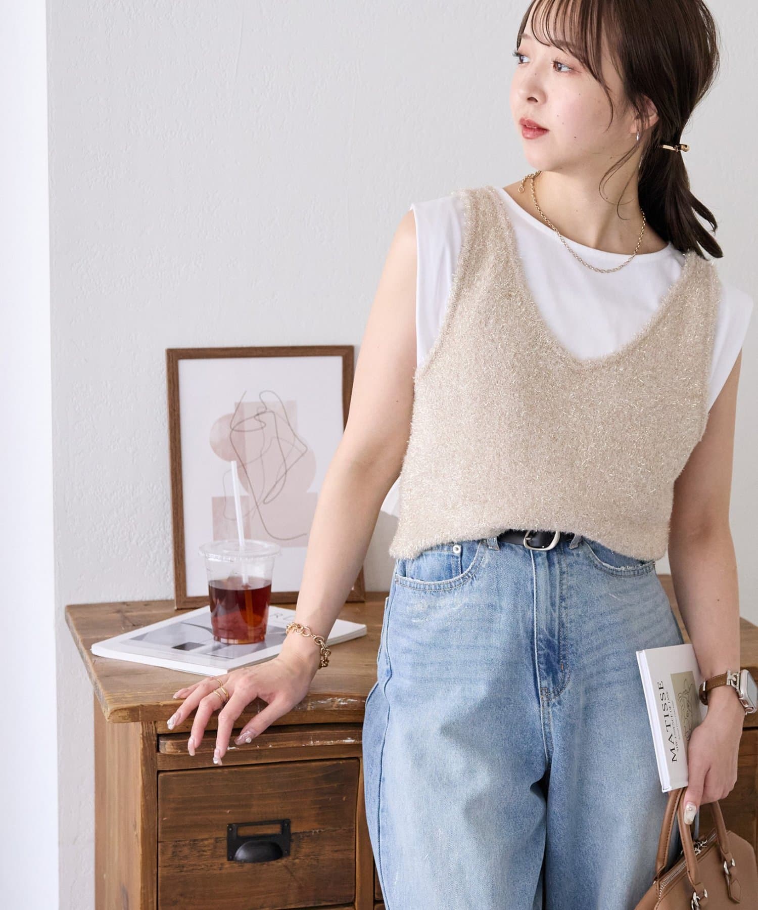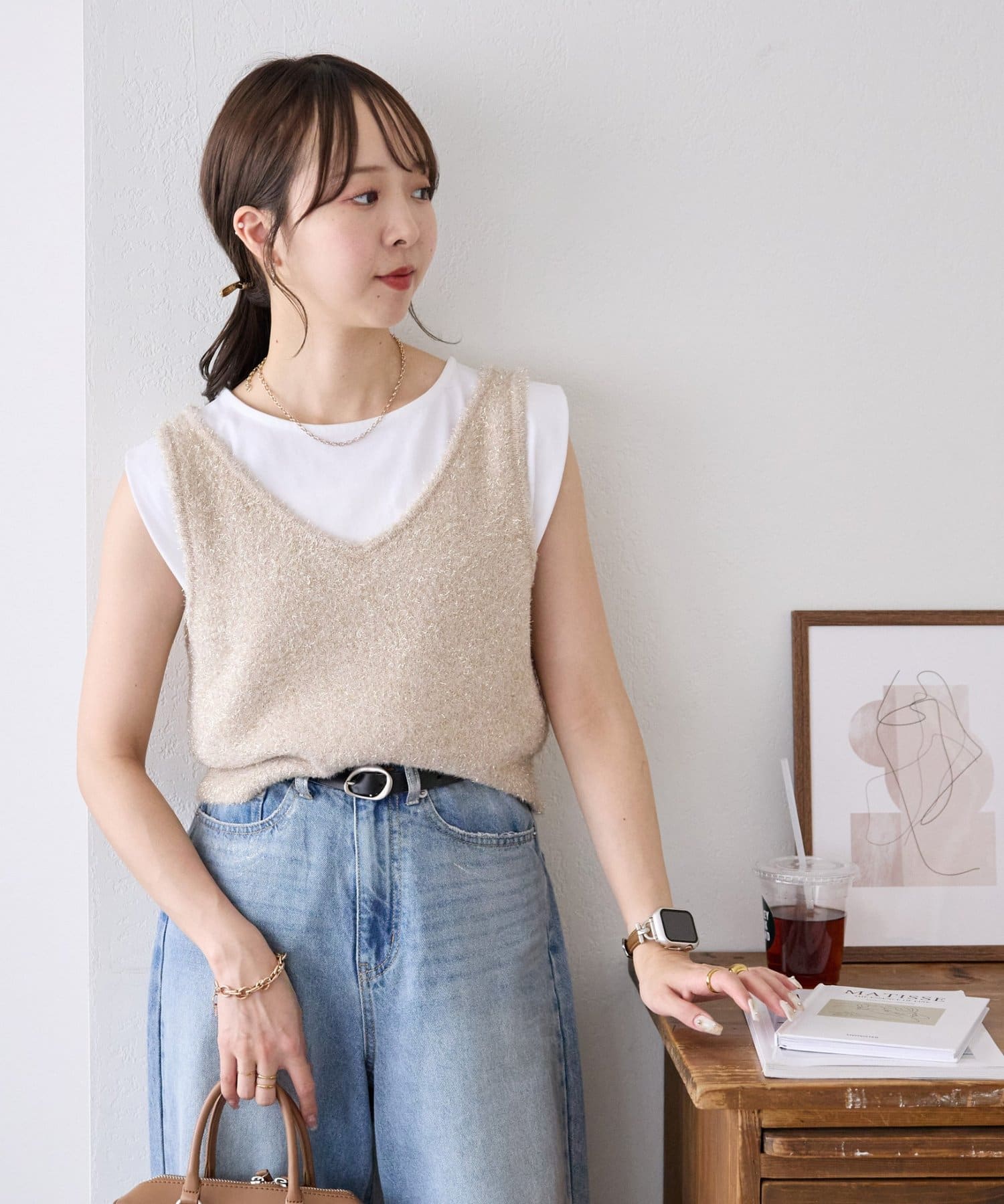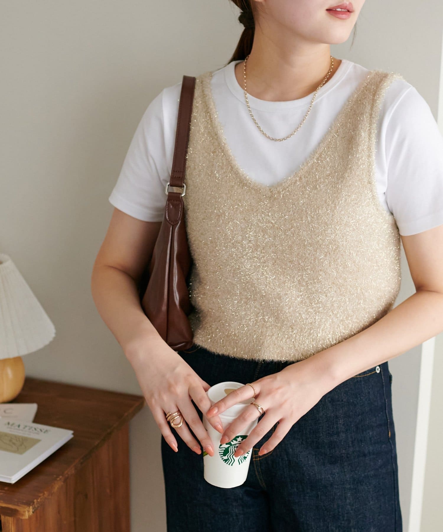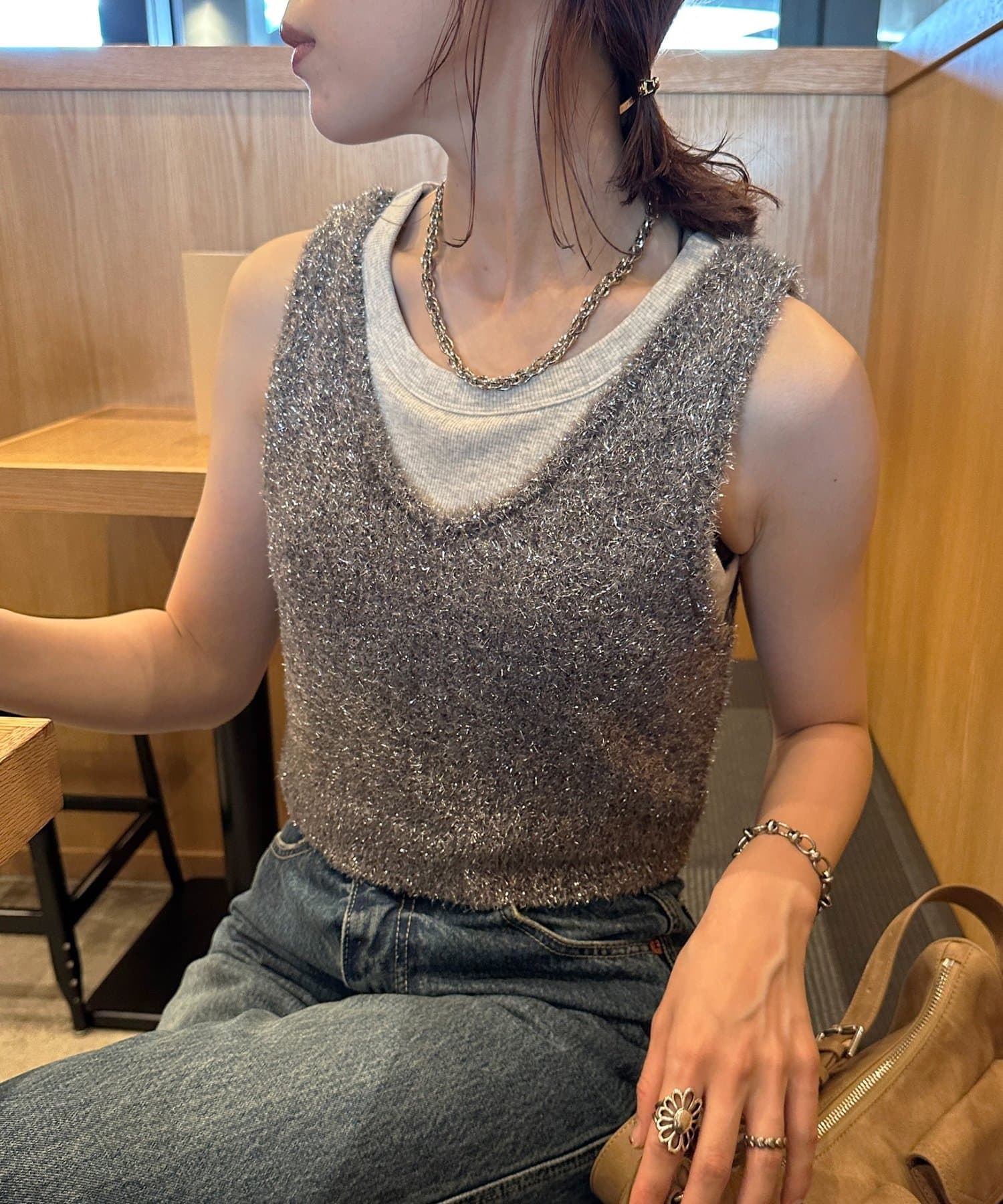 164cmスタッフ:思わず目を惹くラメフェザーンヤーンキャミ。程よいラメ感が、秋冬大活躍の予感!ハイゲージニットやTシャツ合わせもかわいい〇
