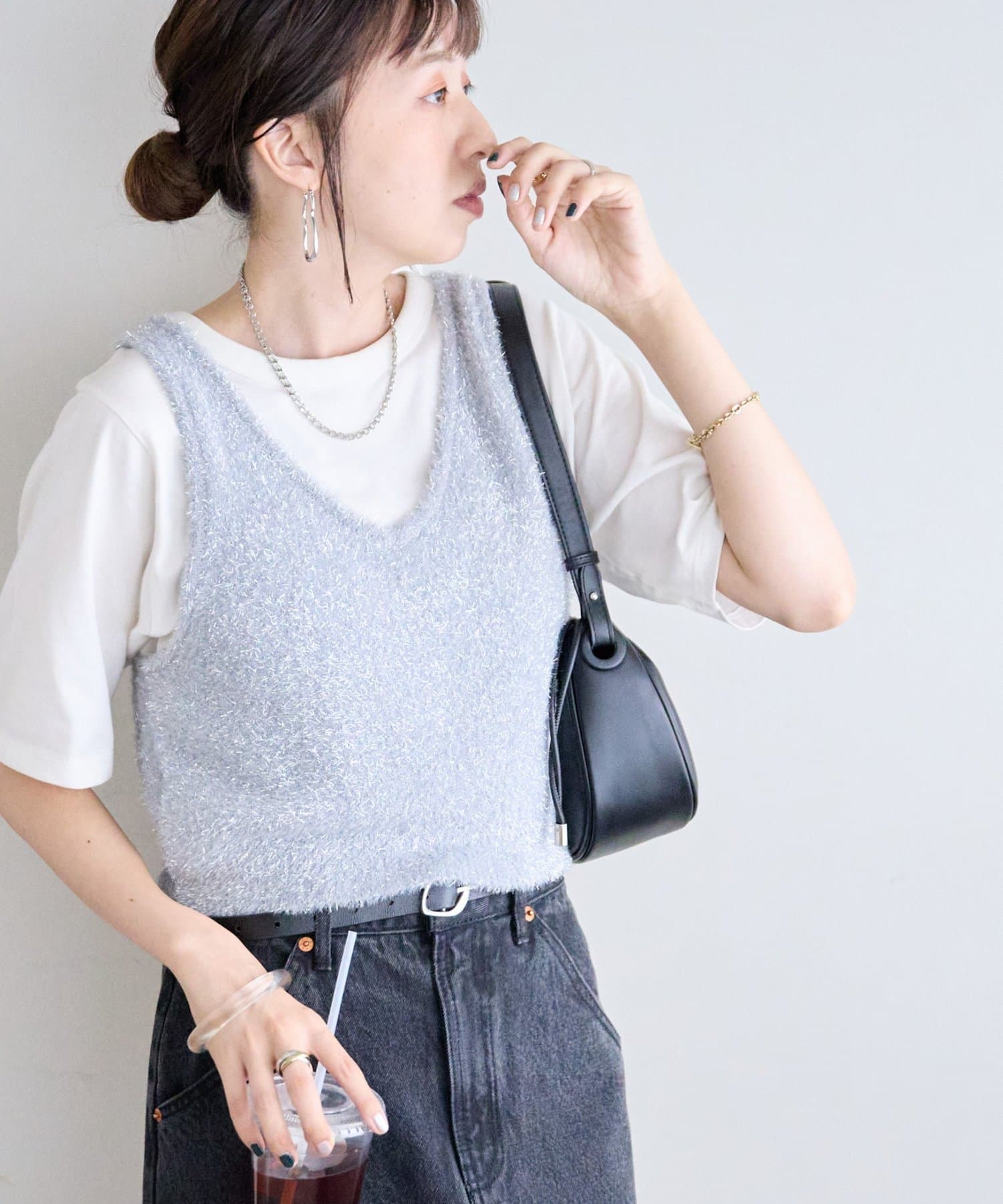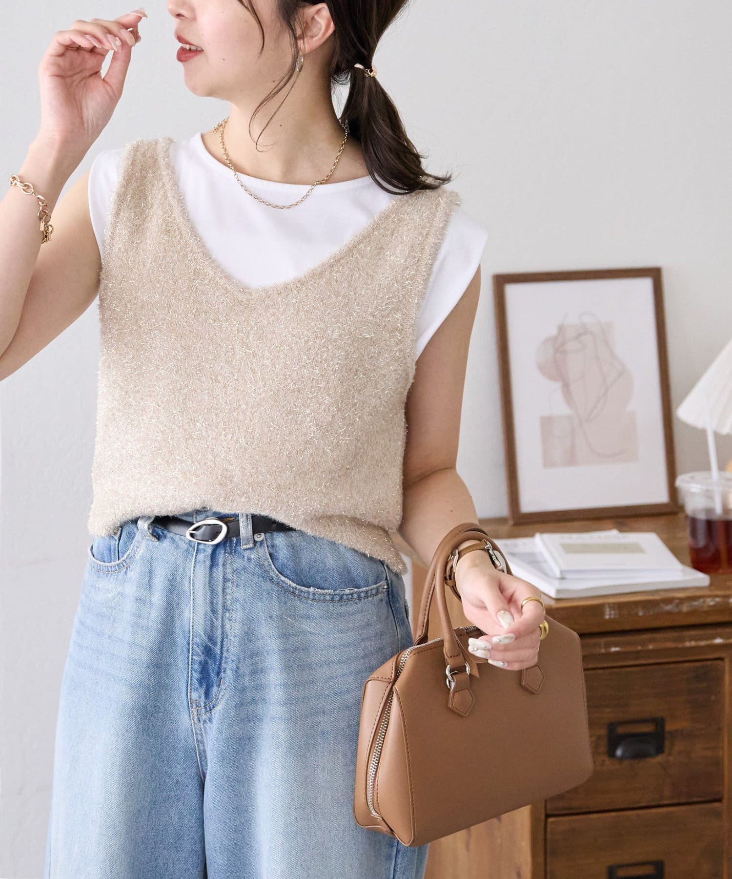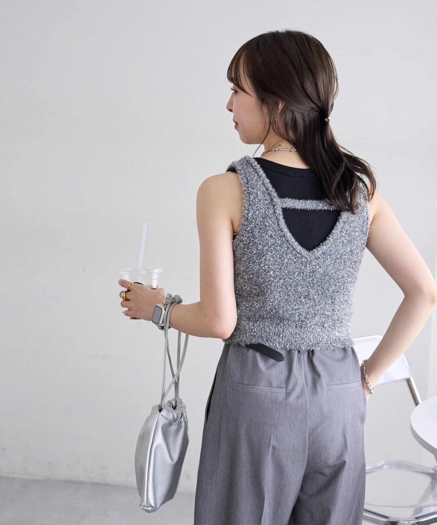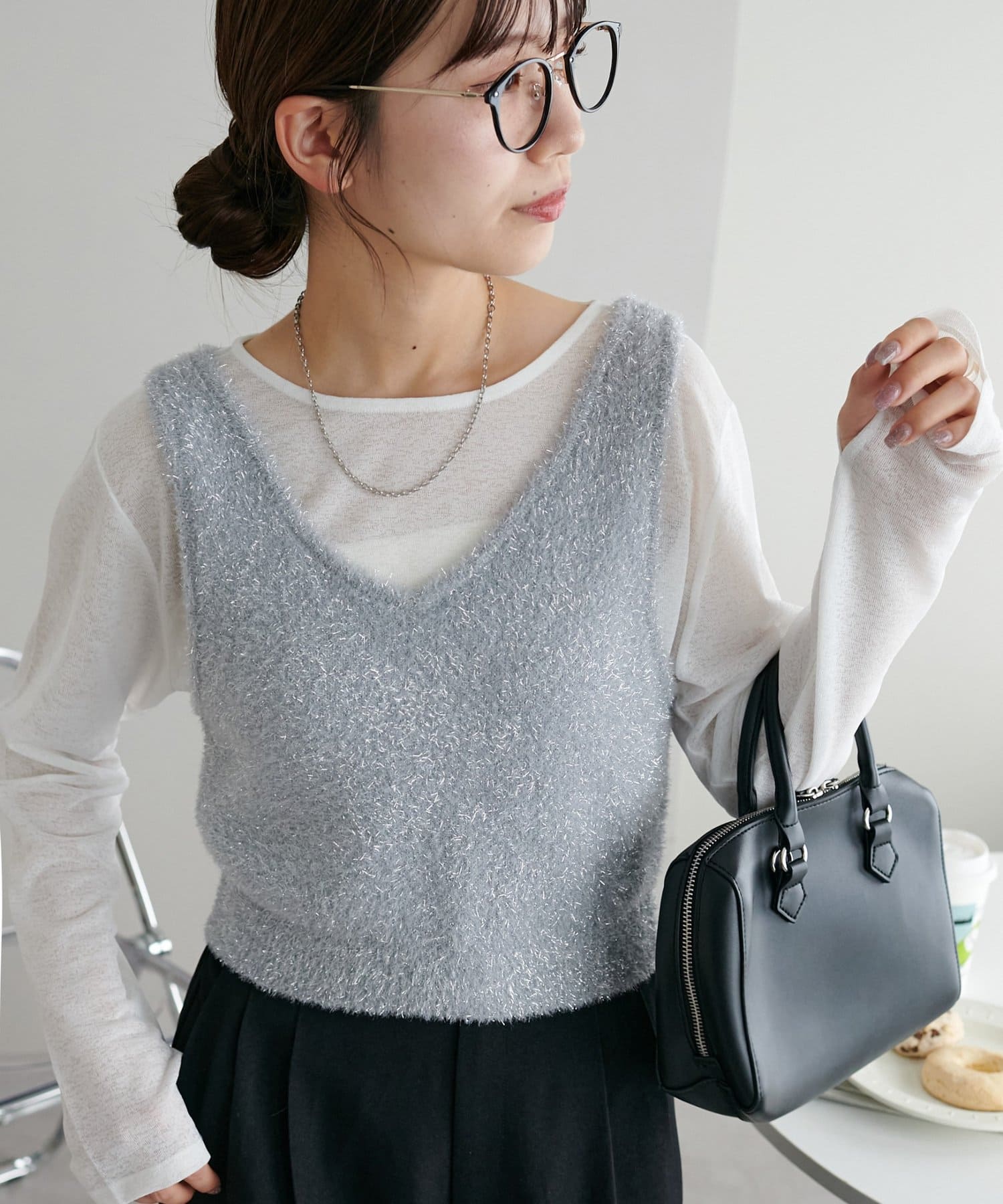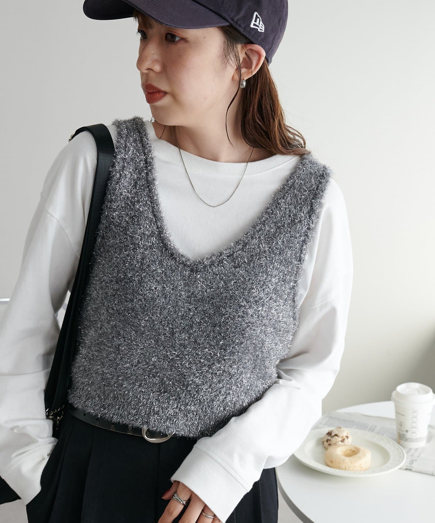 164cmスタッフ:思わず目を惹くラメフェザーンヤーンキャミ。程よいラメ感が、秋冬大活躍の予感!ハイゲージニットやTシャツ合わせもかわいい〇