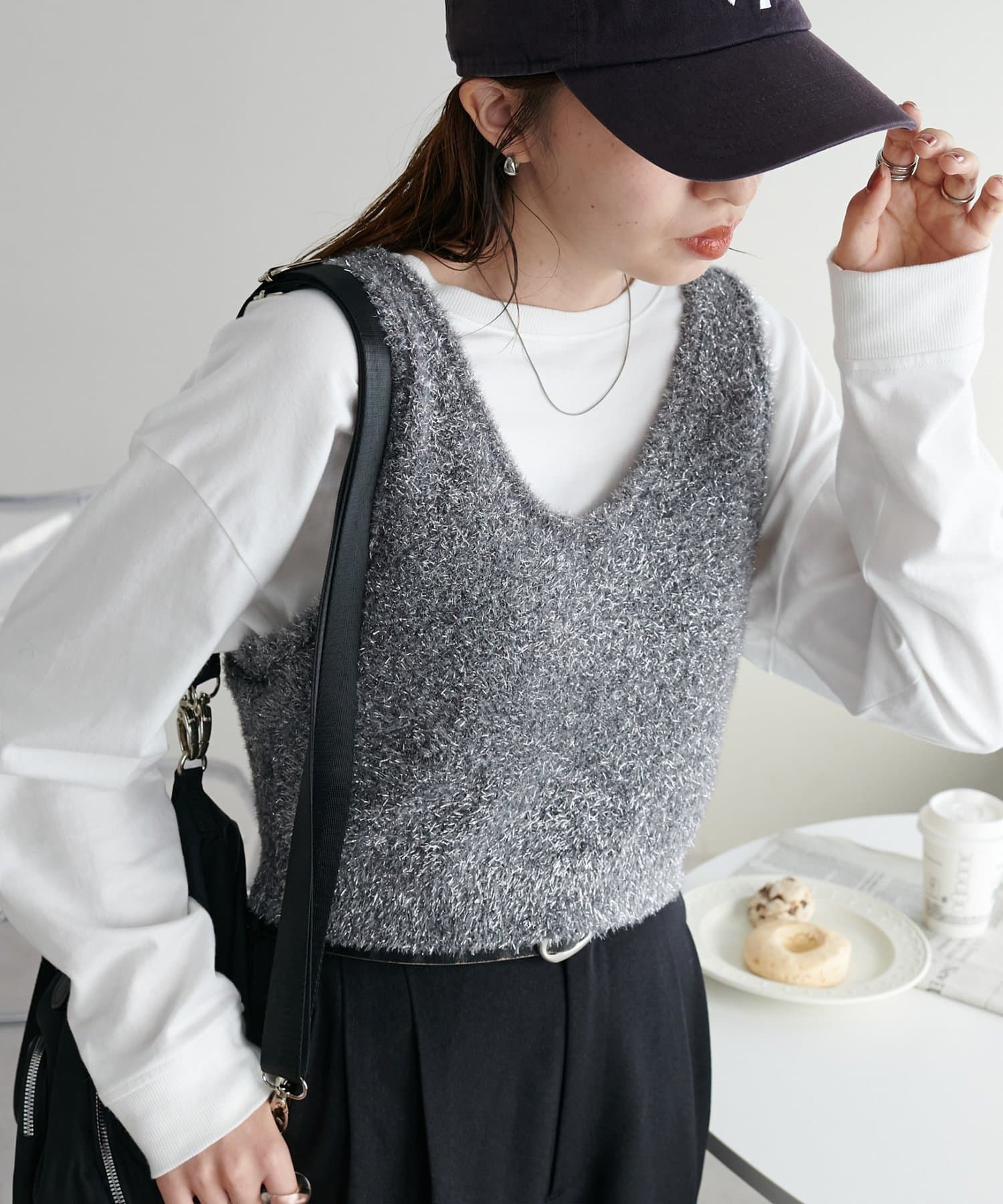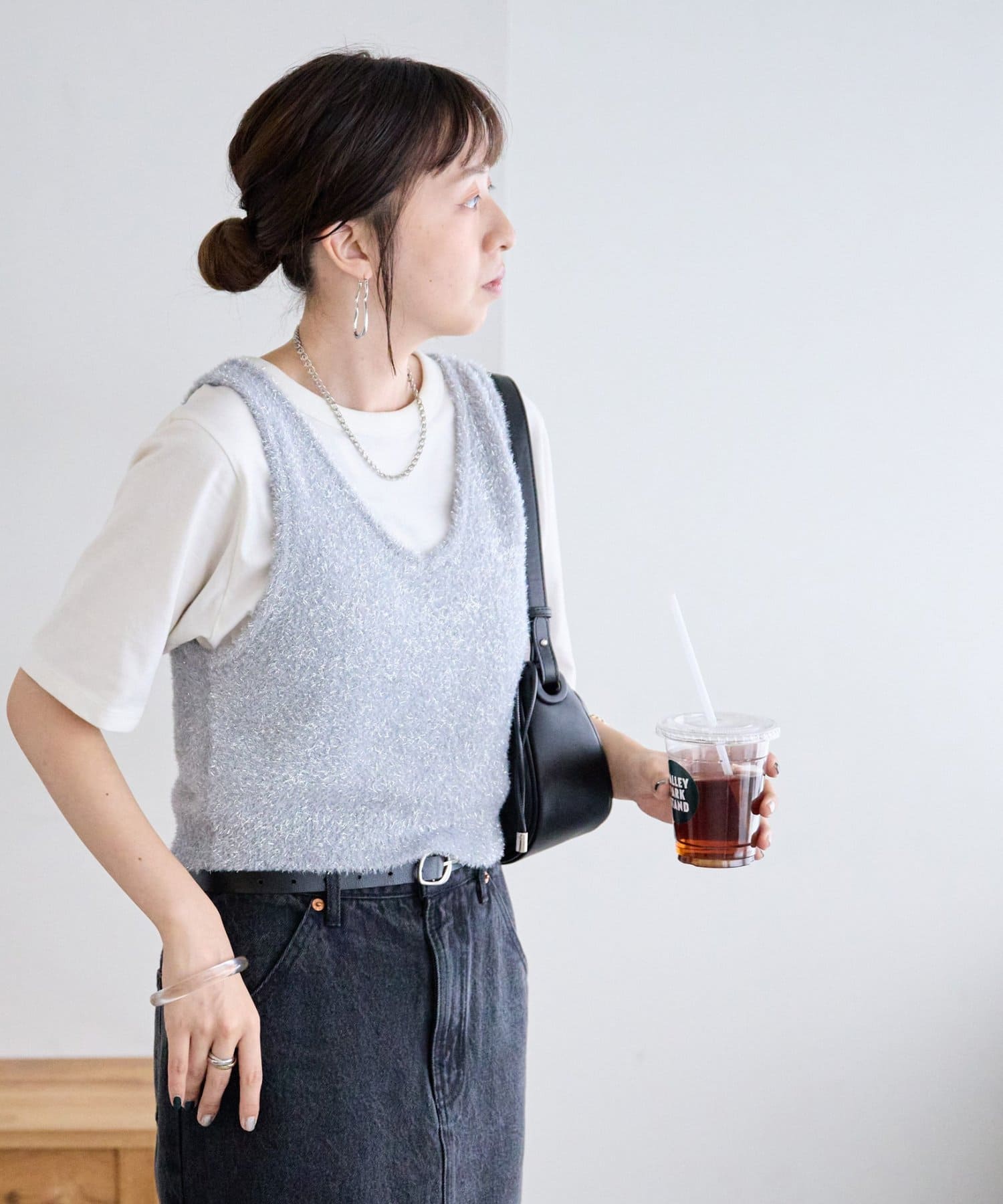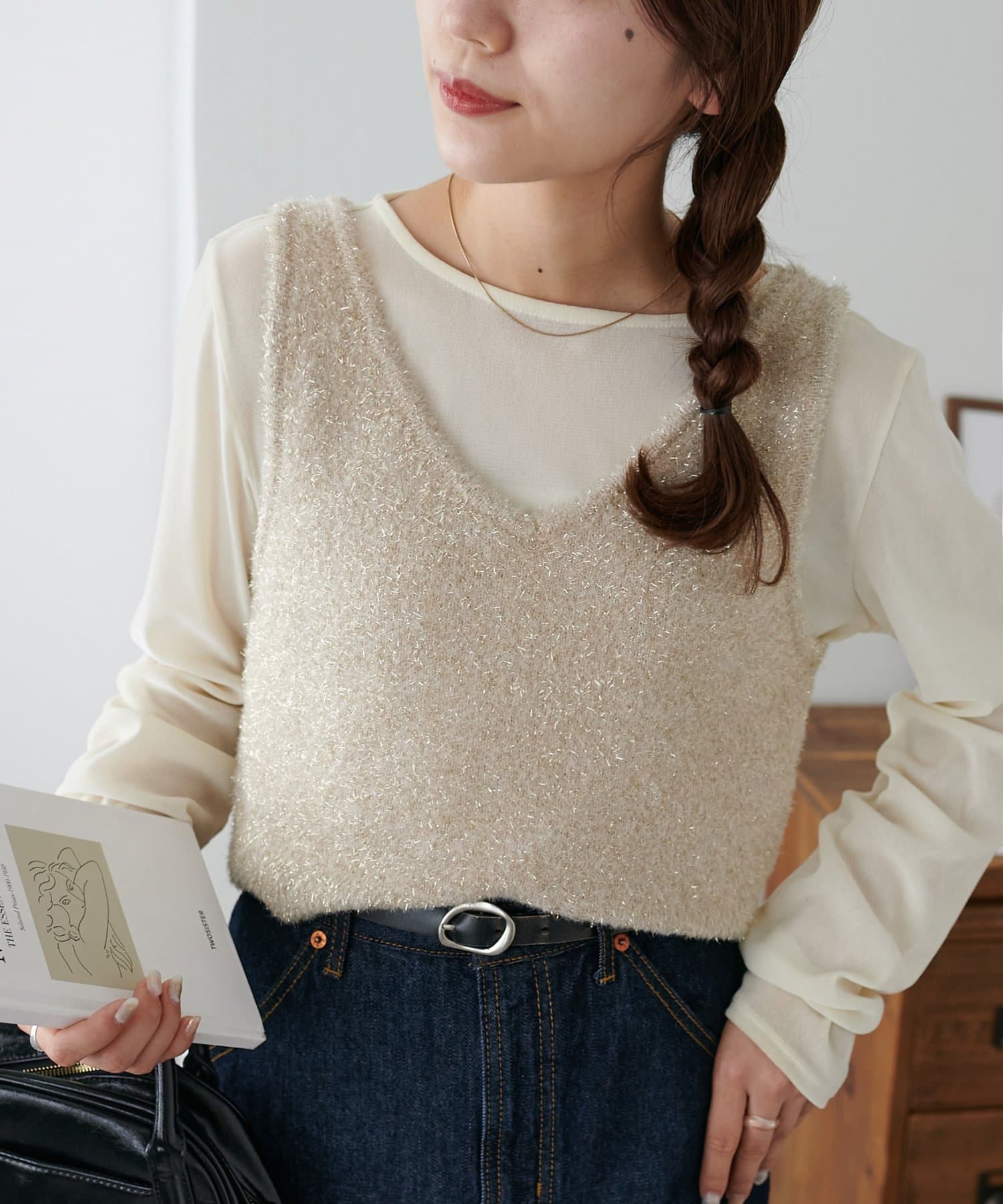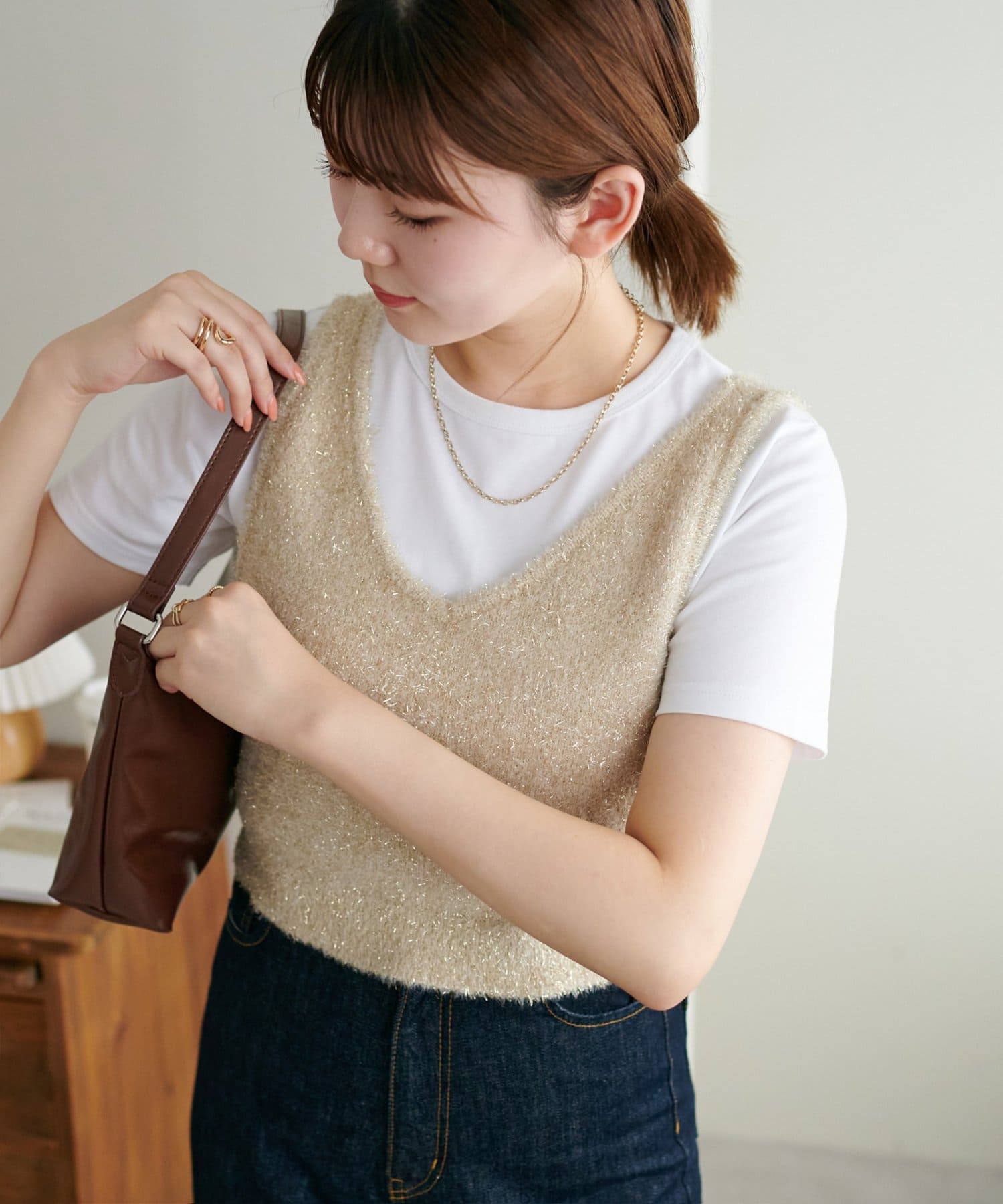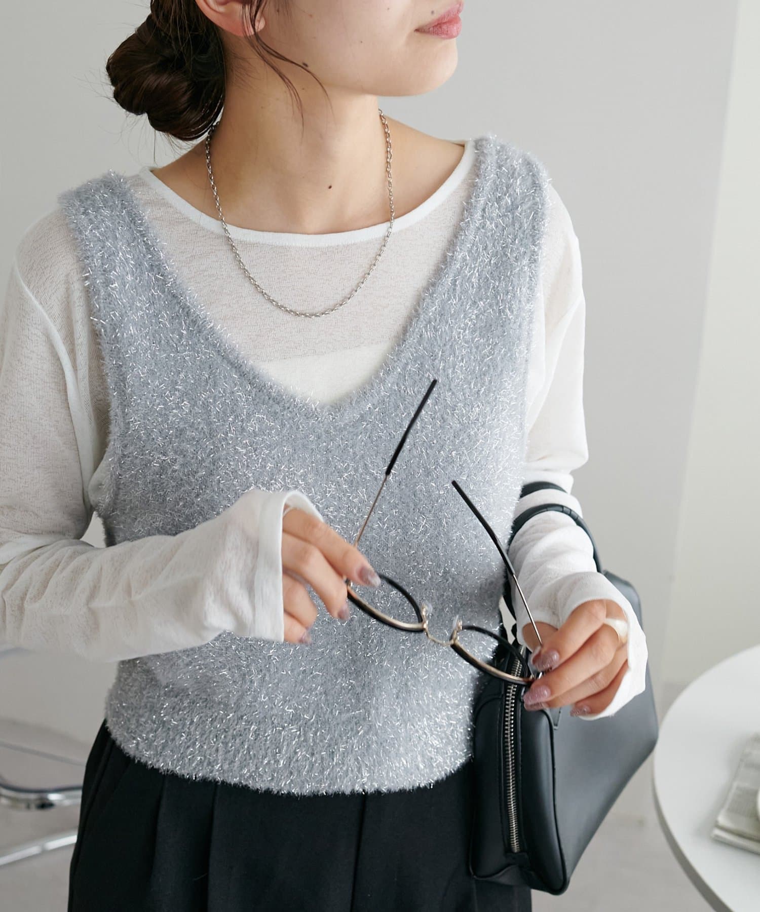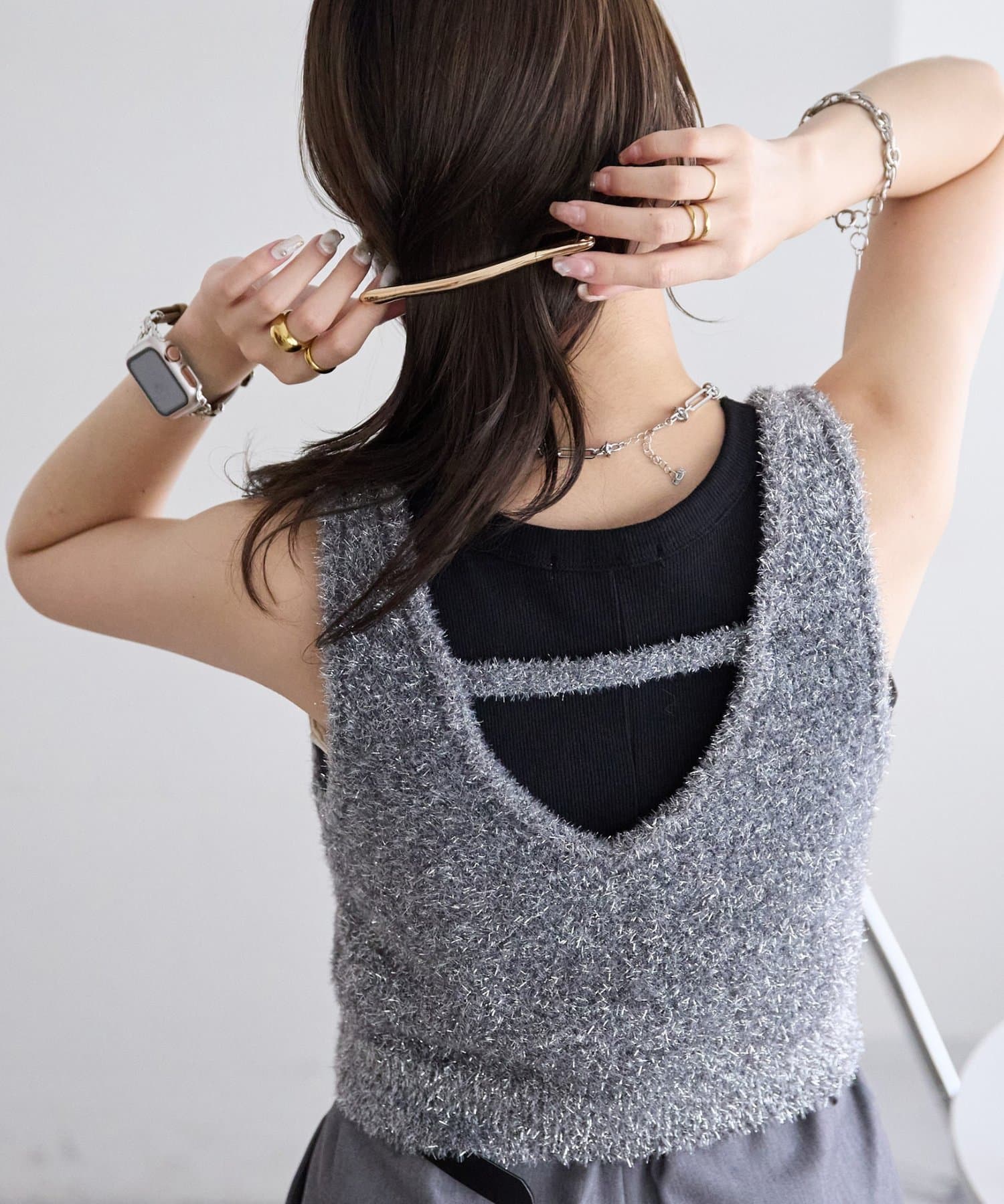 164cmスタッフ:思わず目を惹くラメフェザーンヤーンキャミ。程よいラメ感が、秋冬大活躍の予感!ハイゲージニットやTシャツ合わせもかわいい〇