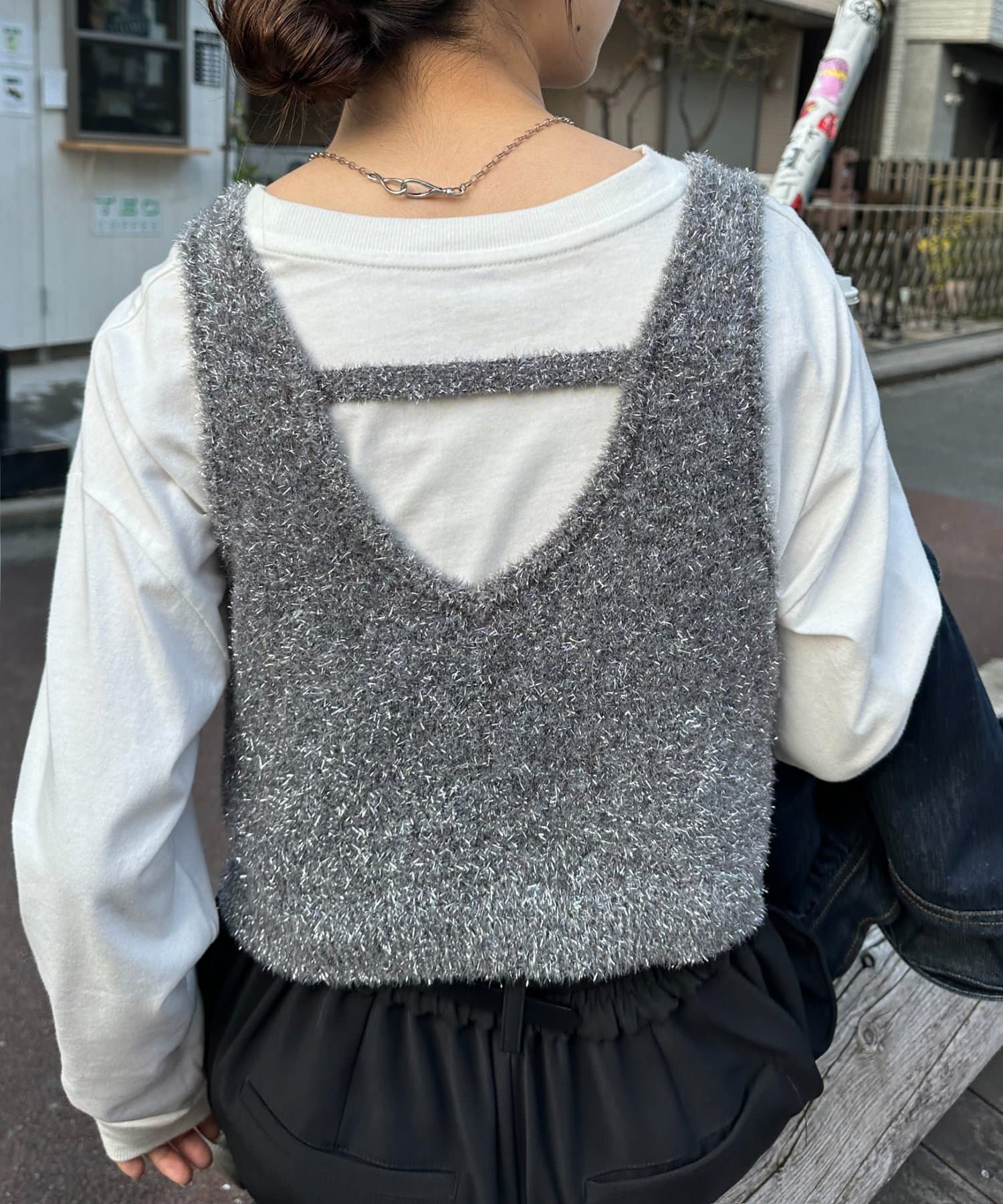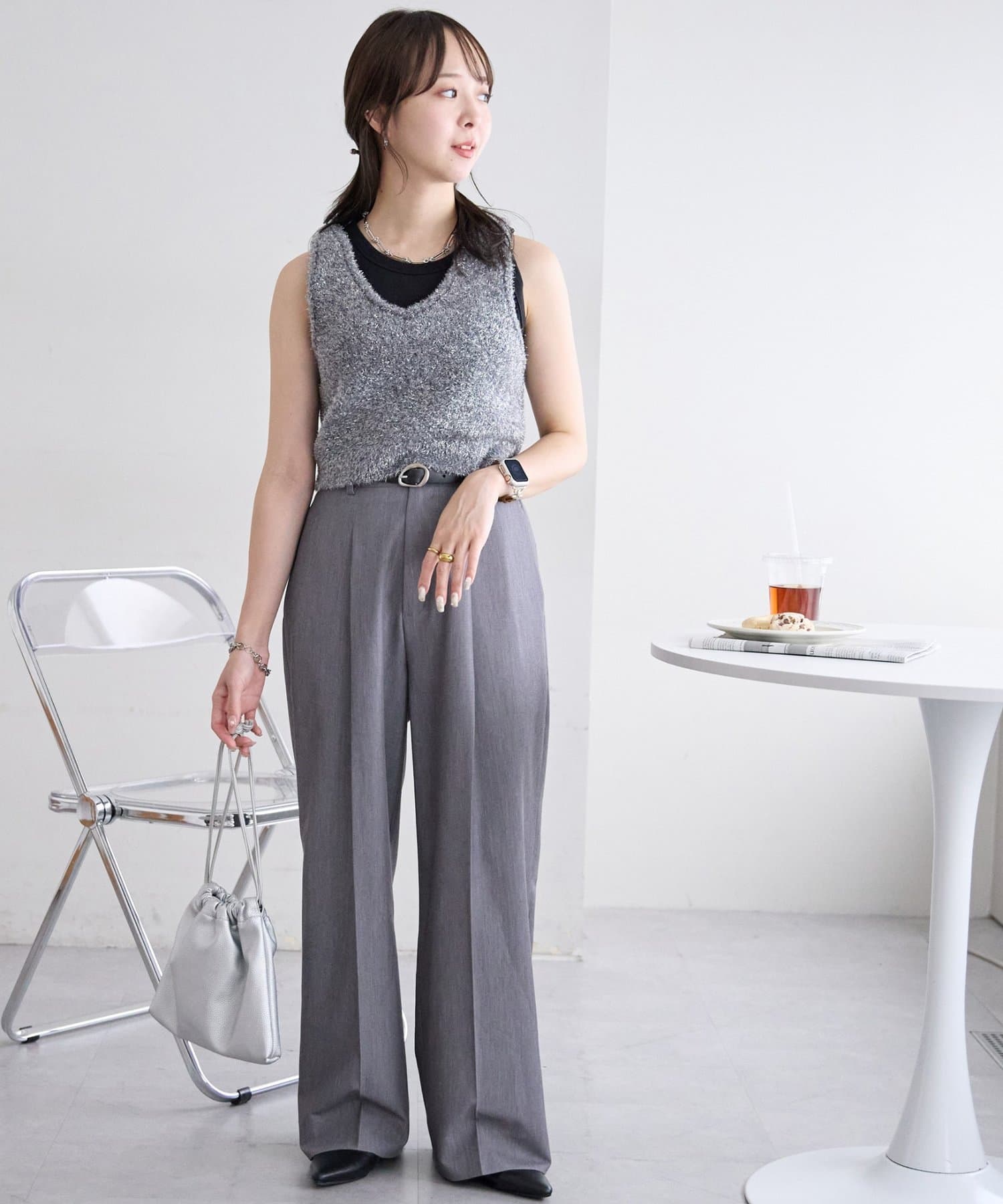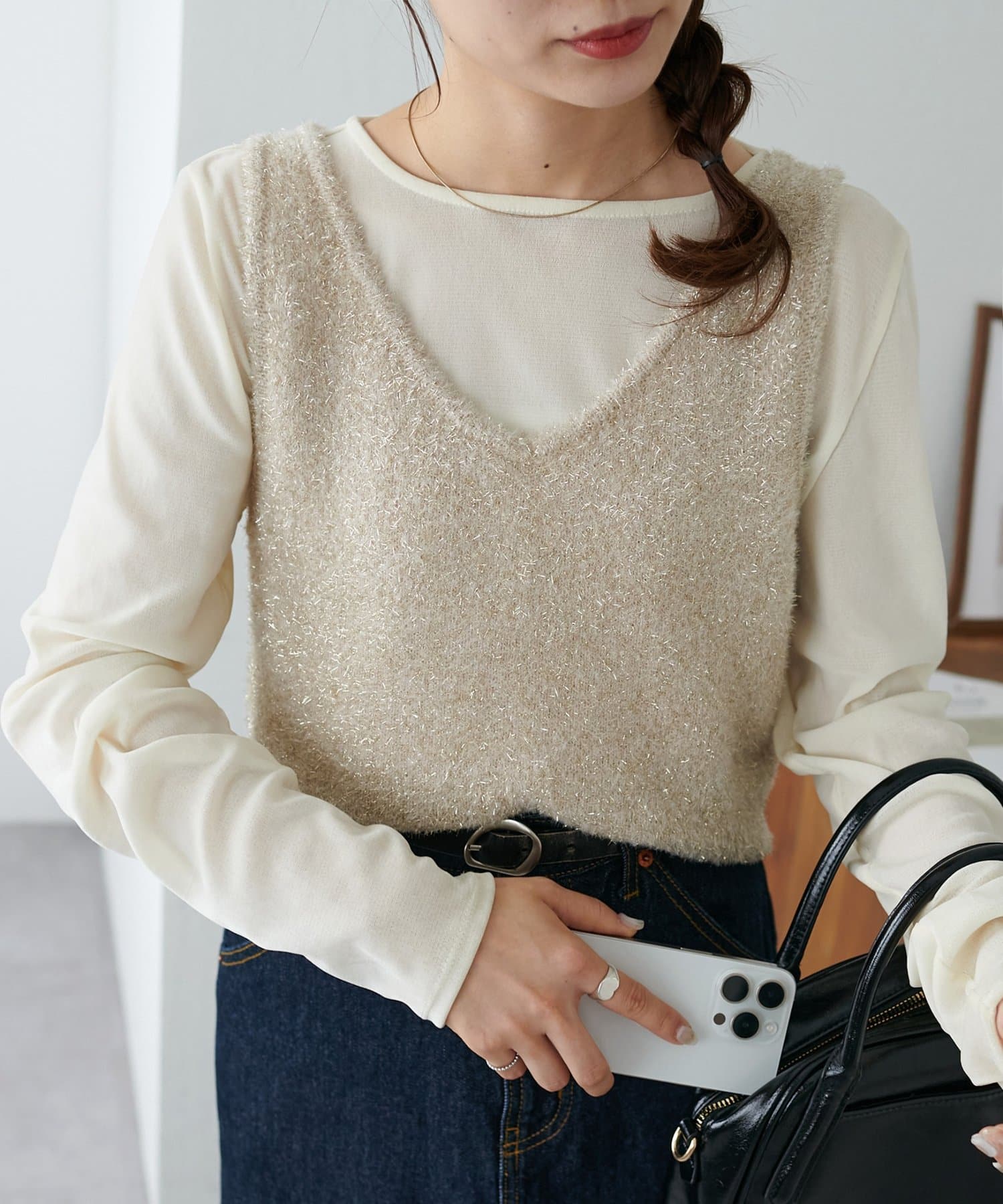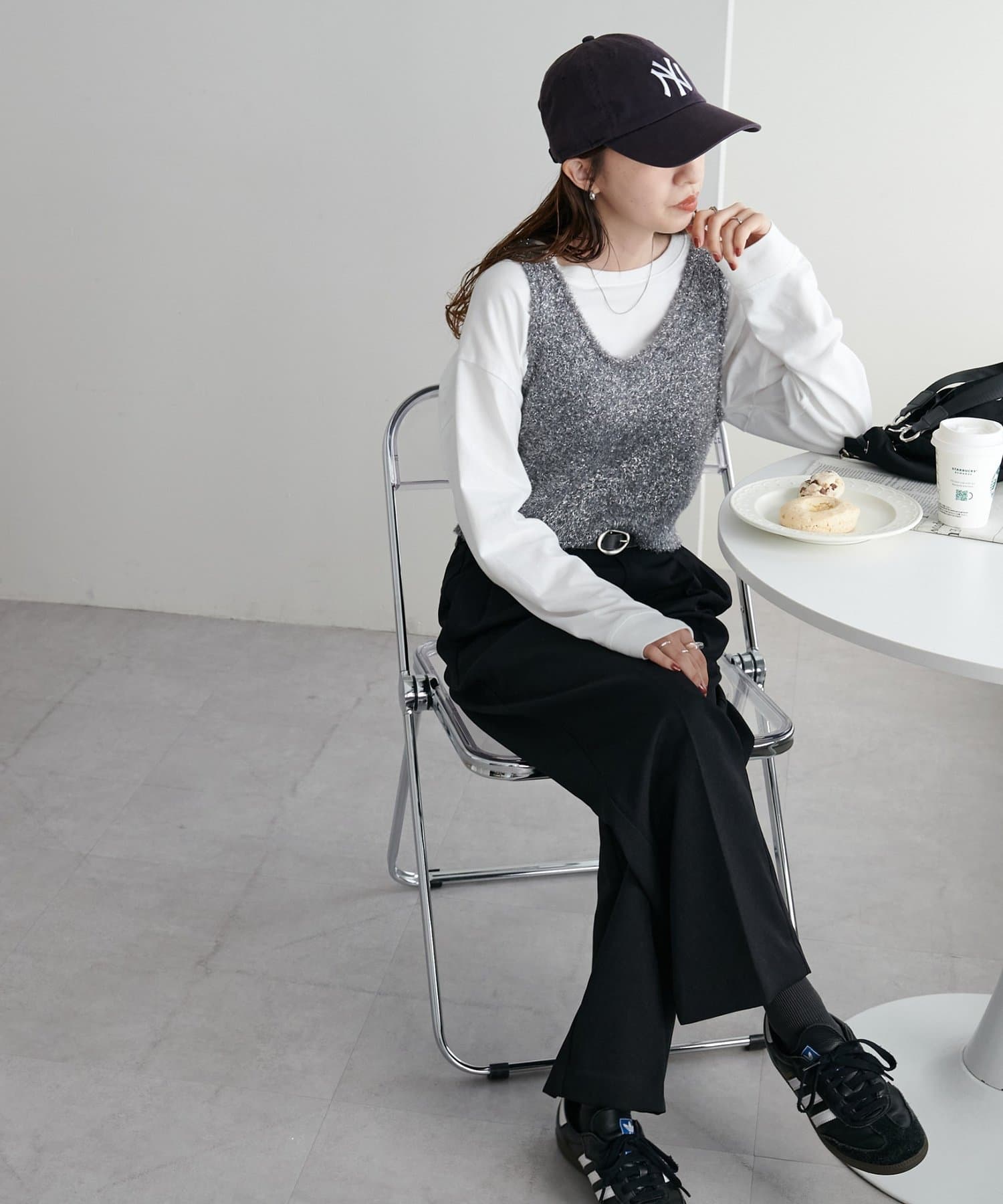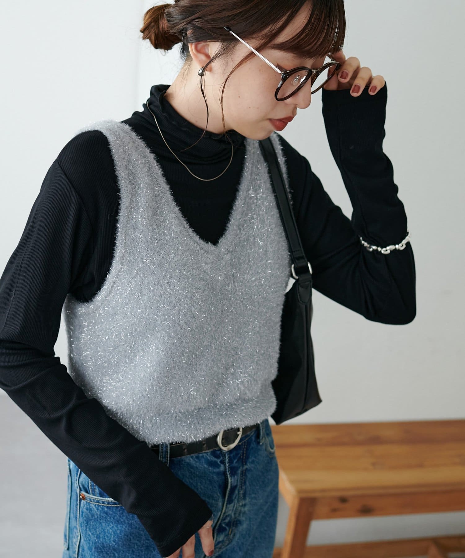 164cmスタッフ:思わず目を惹くラメフェザーンヤーンキャミ。程よいラメ感が、秋冬大活躍の予感!ハイゲージニットやTシャツ合わせもかわいい〇