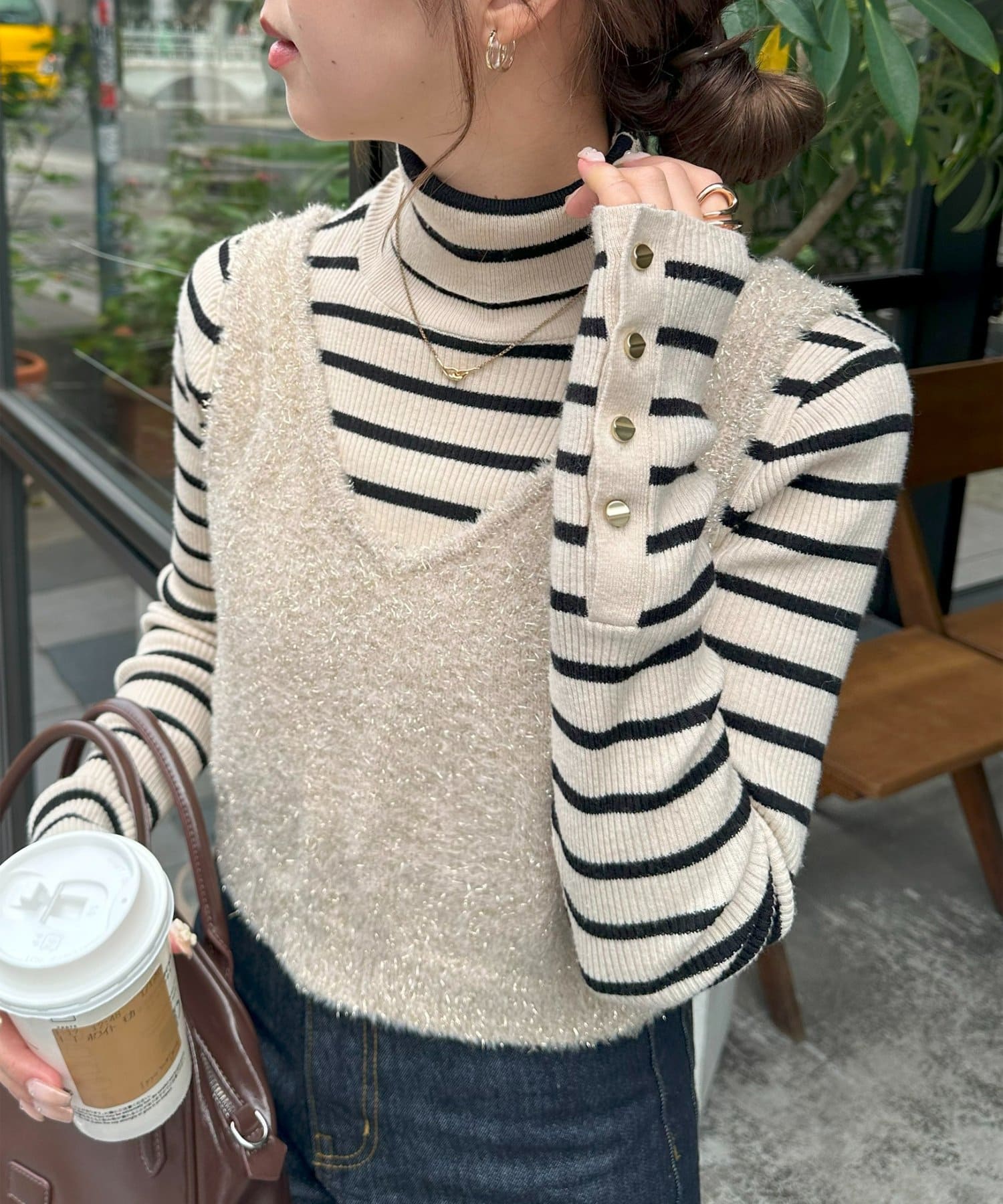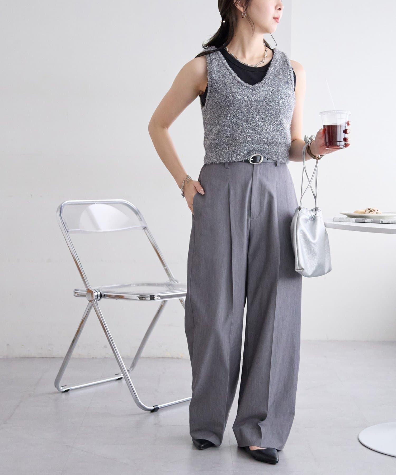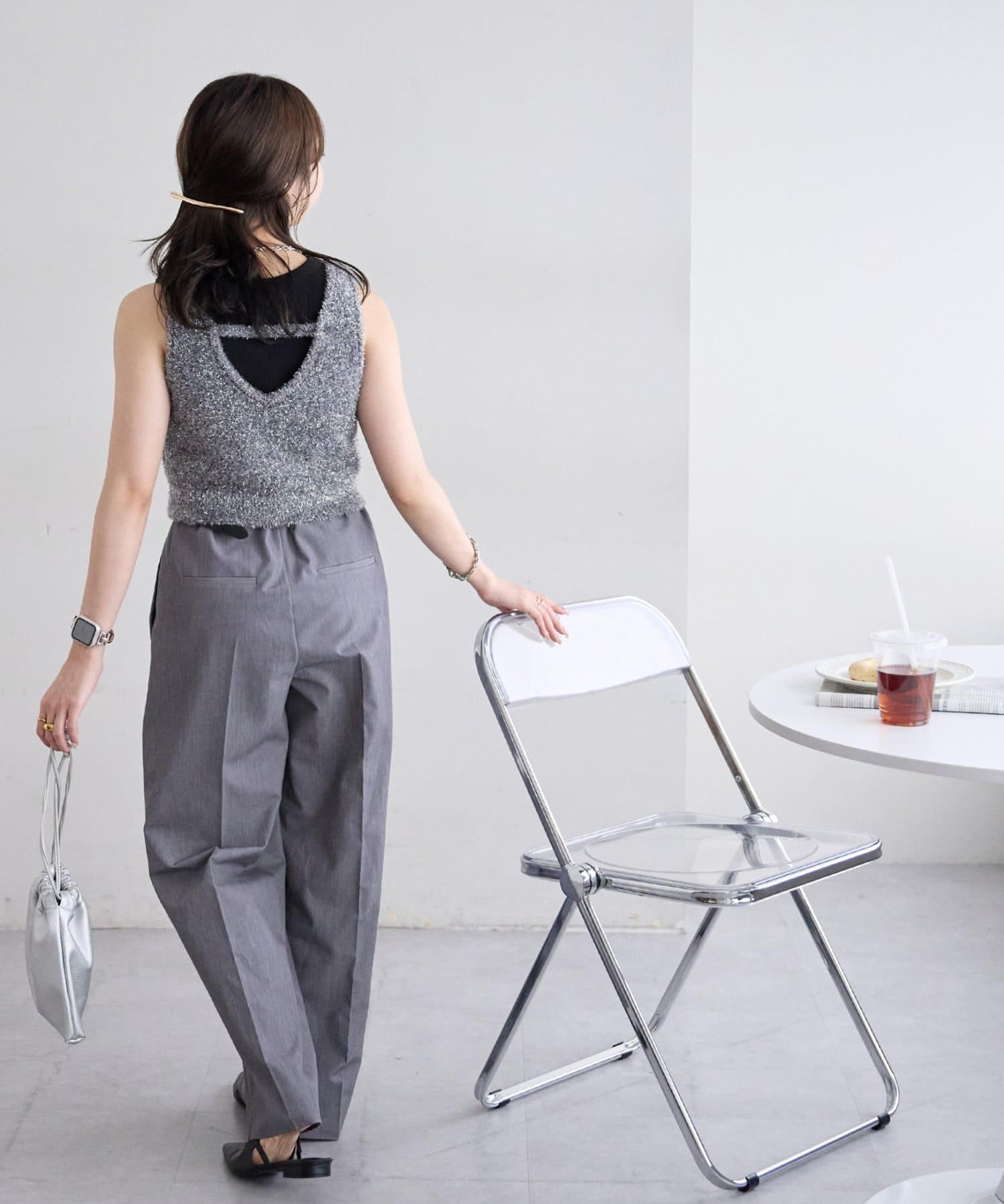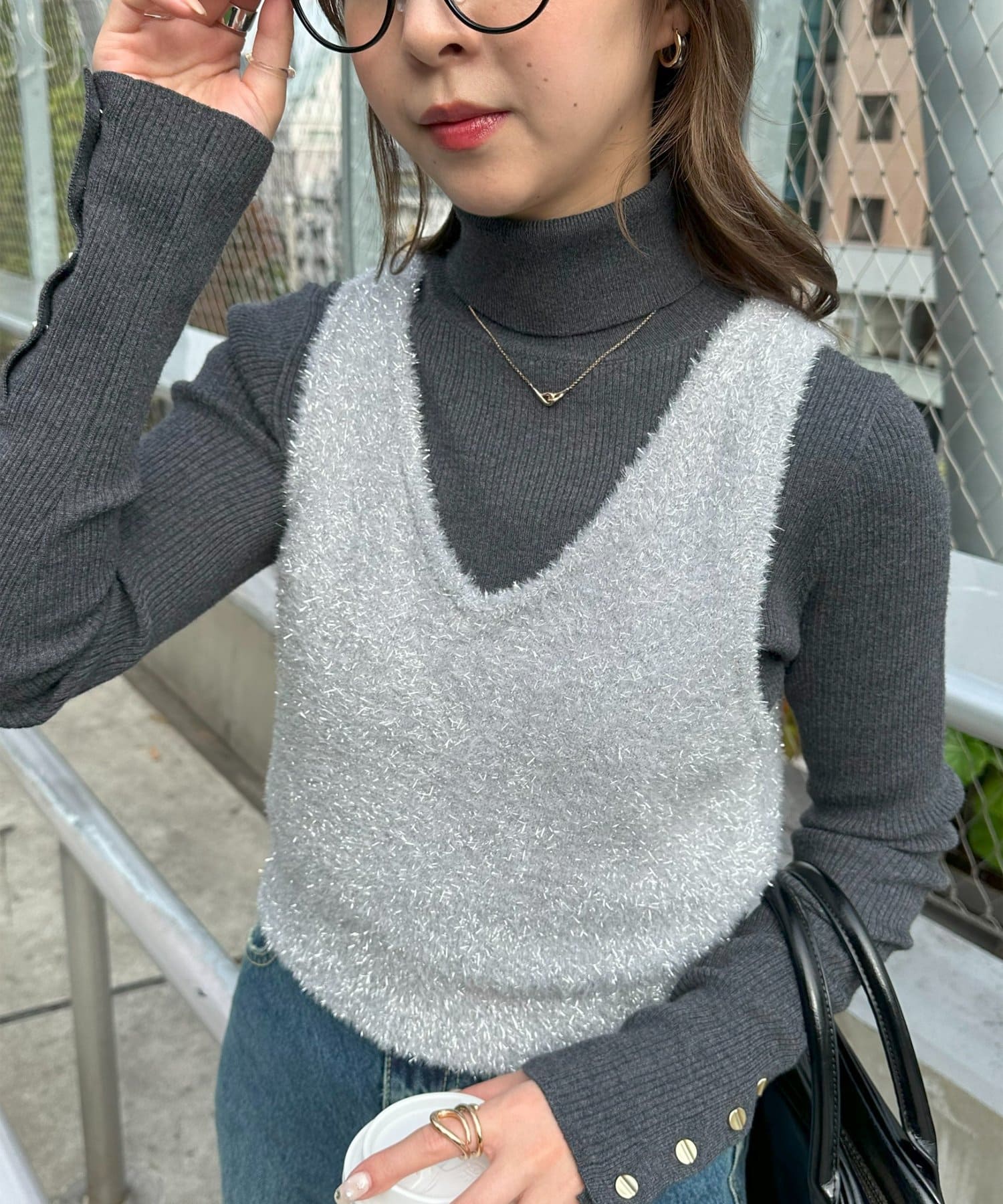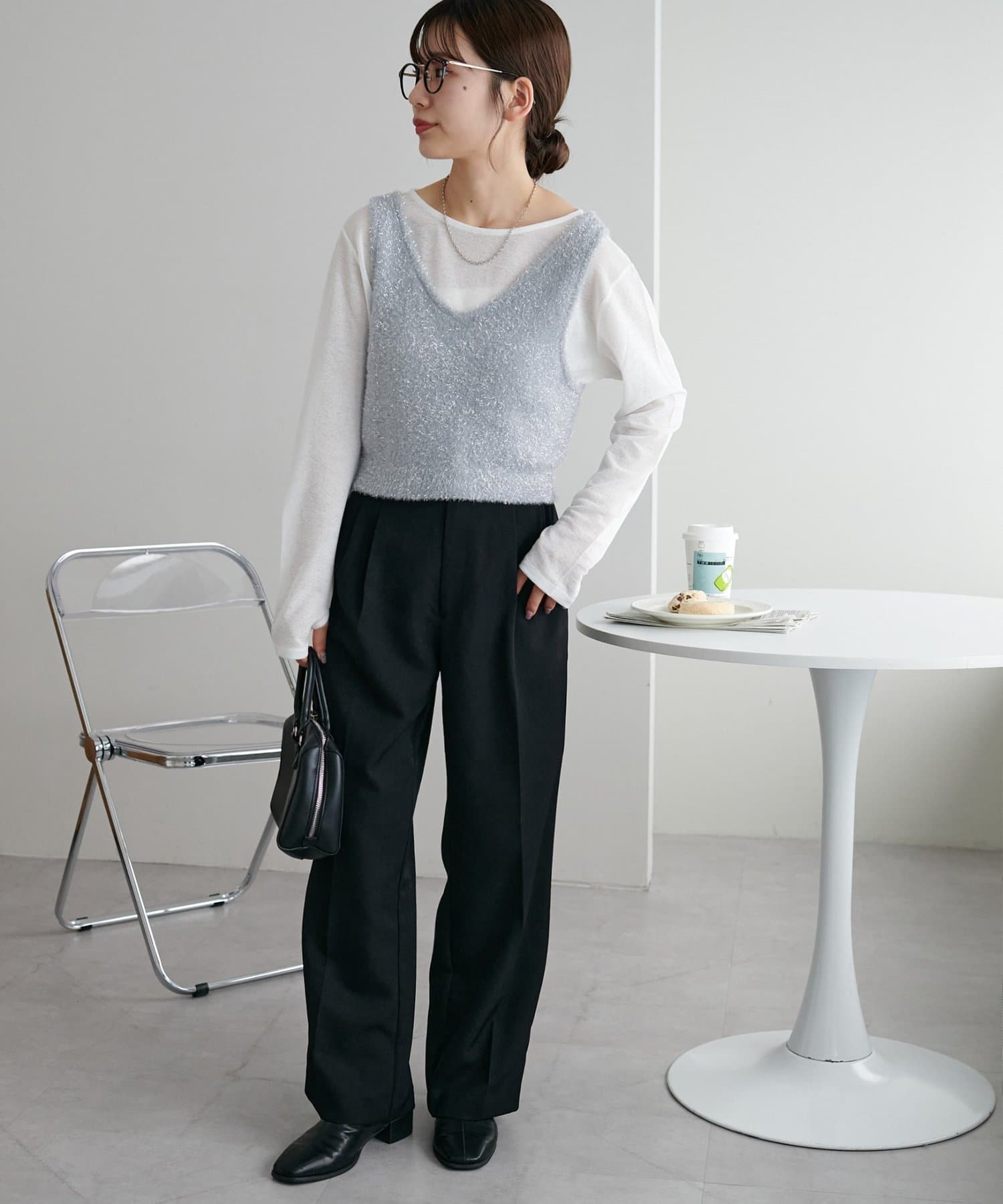 164cmスタッフ:思わず目を惹くラメフェザーンヤーンキャミ。程よいラメ感が、秋冬大活躍の予感!ハイゲージニットやTシャツ合わせもかわいい〇