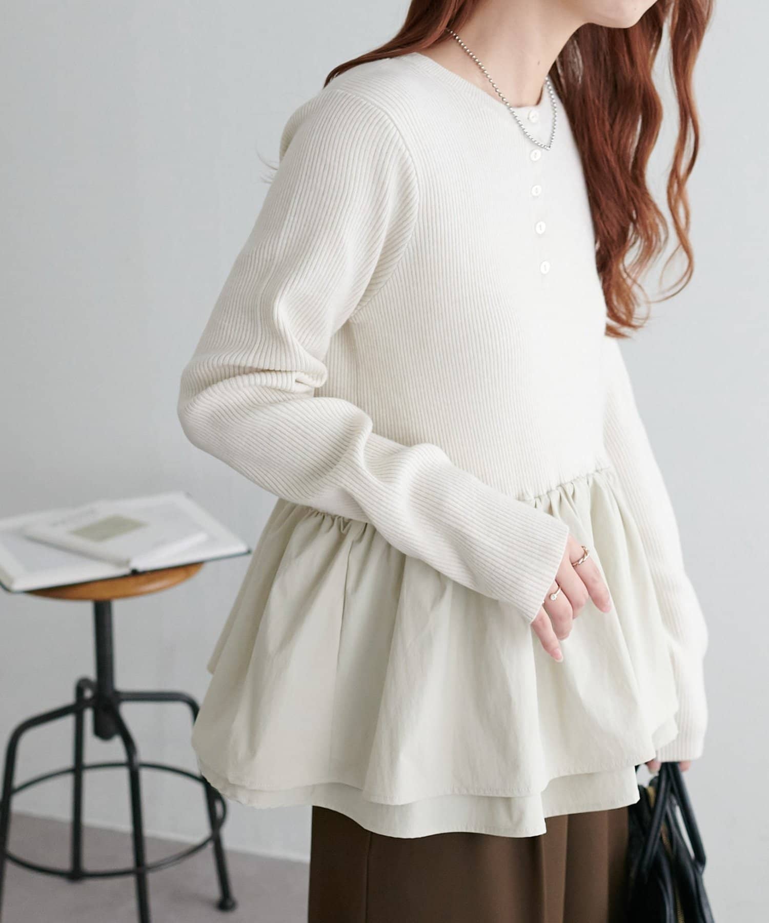 一枚で様になるペプラムニットはデニムやスウェットパンツ、スラックスなどシンプルなボトムス合わせがおすすめ!