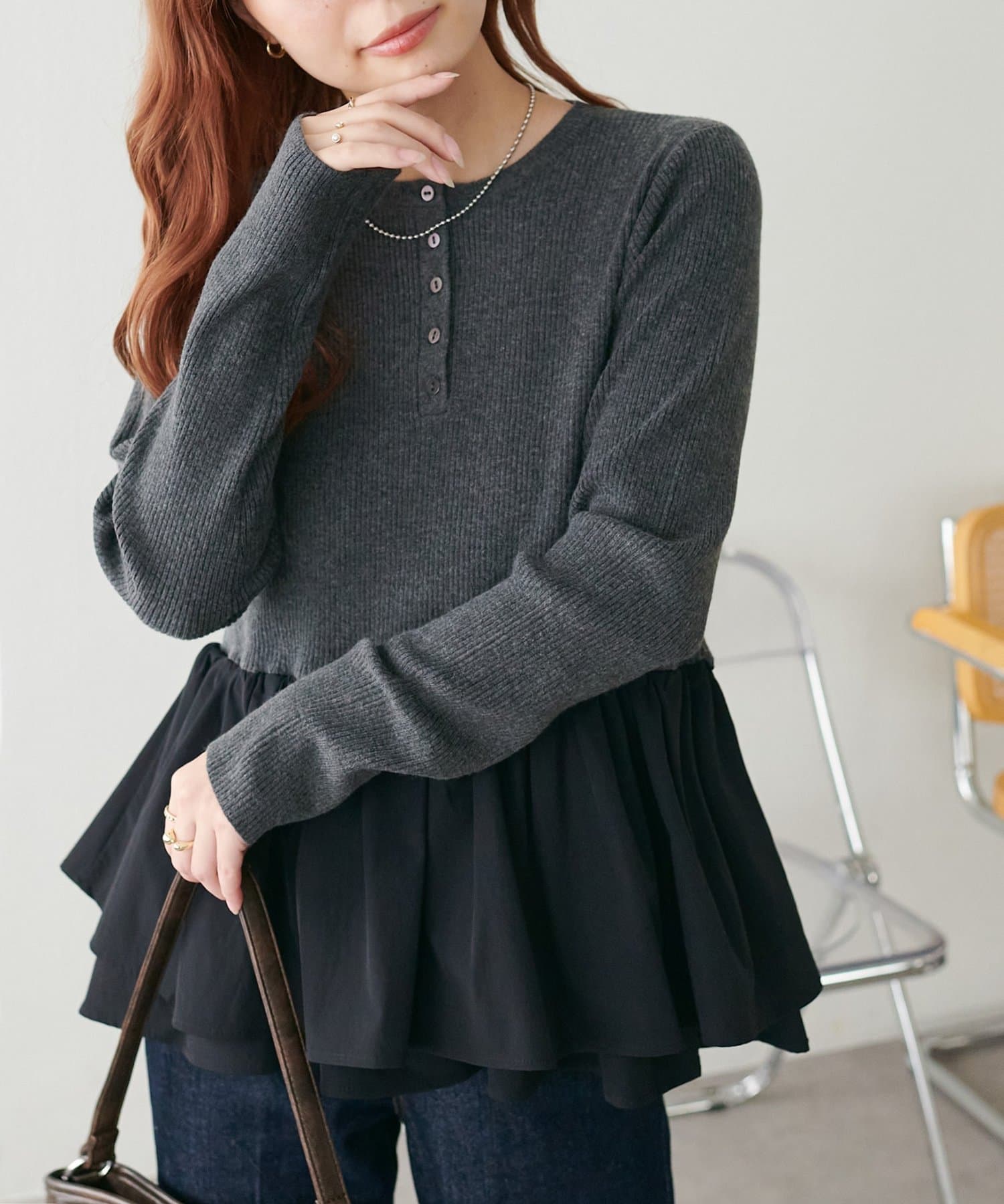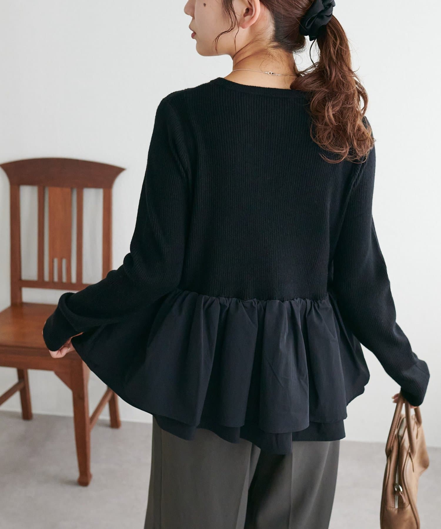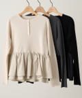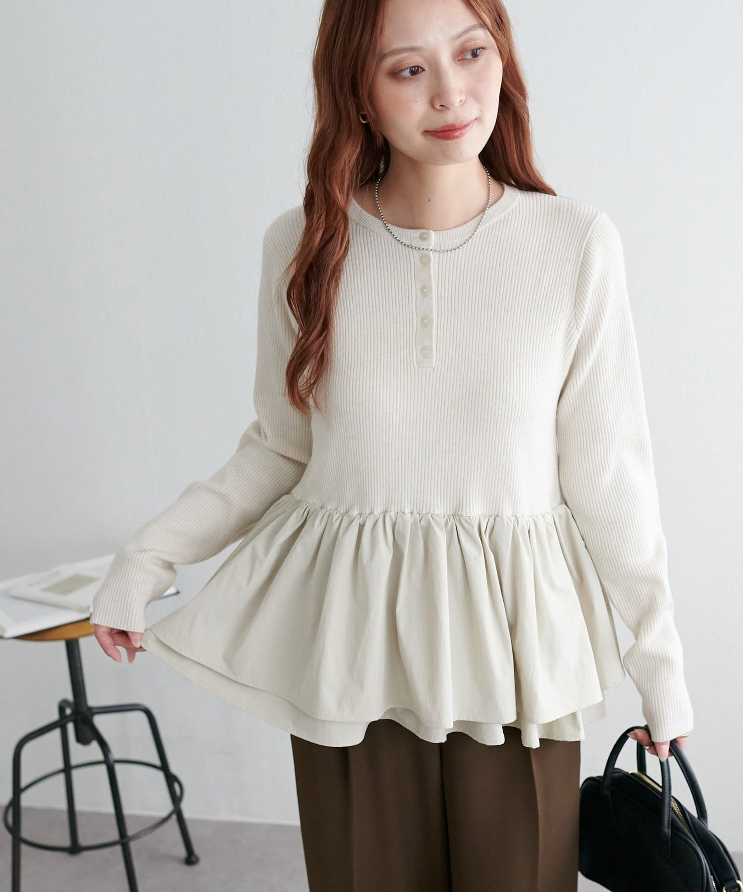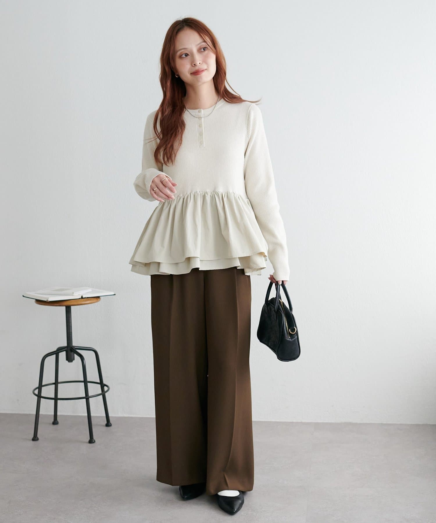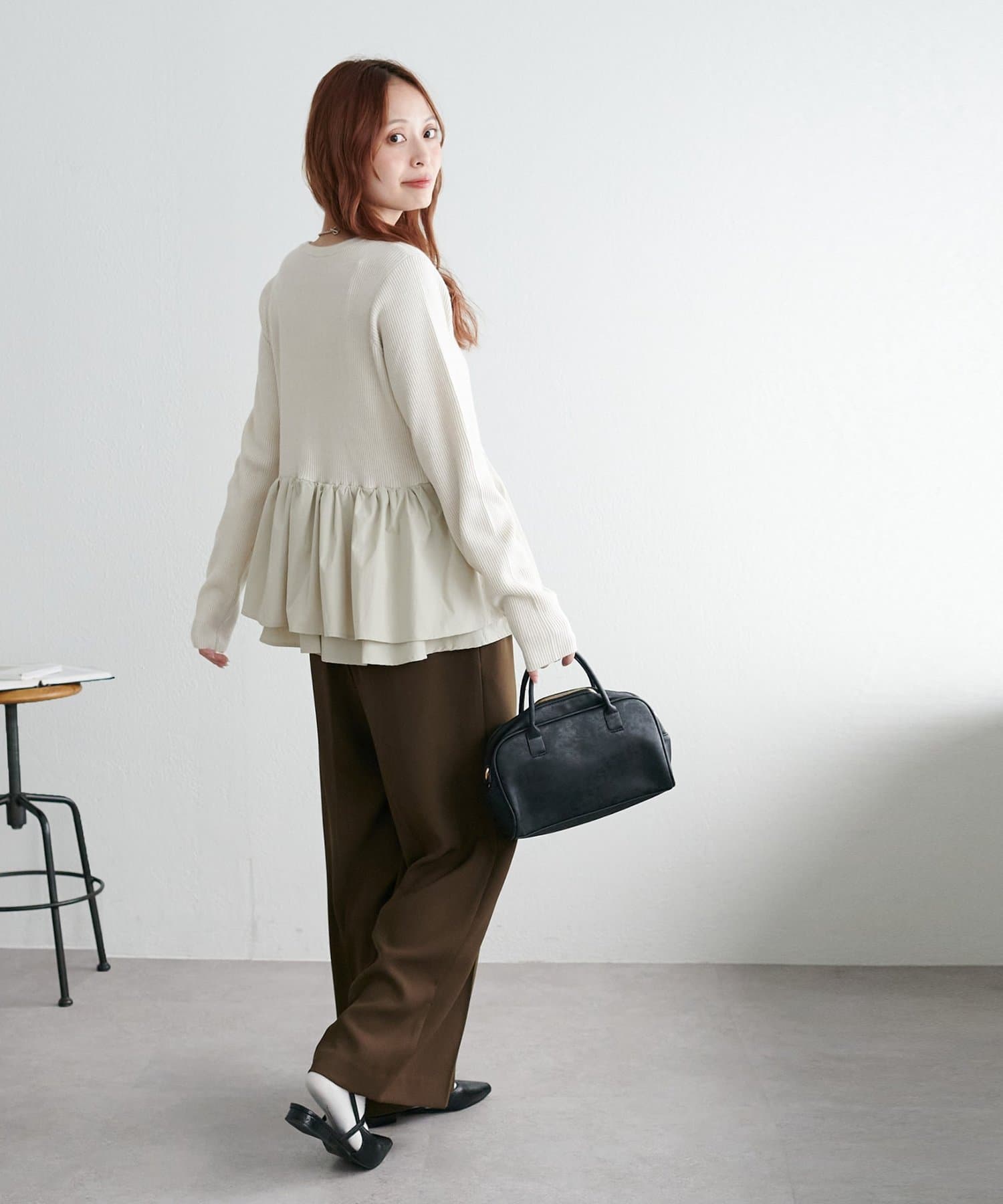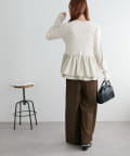 一枚で様になるペプラムニットはデニムやスウェットパンツ、スラックスなどシンプルなボトムス合わせがおすすめ!