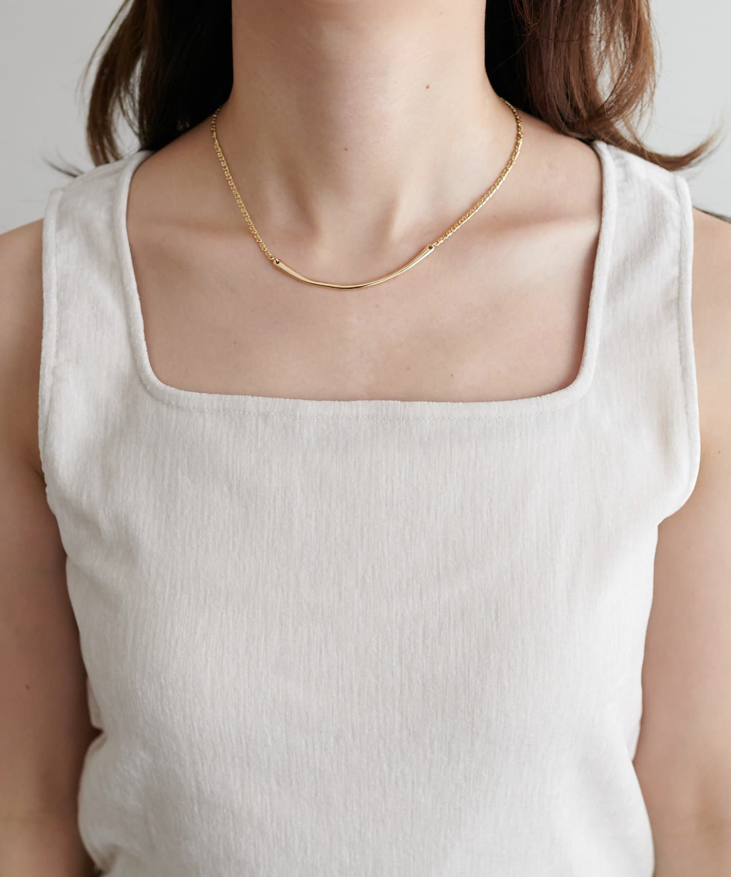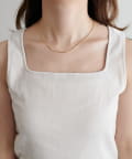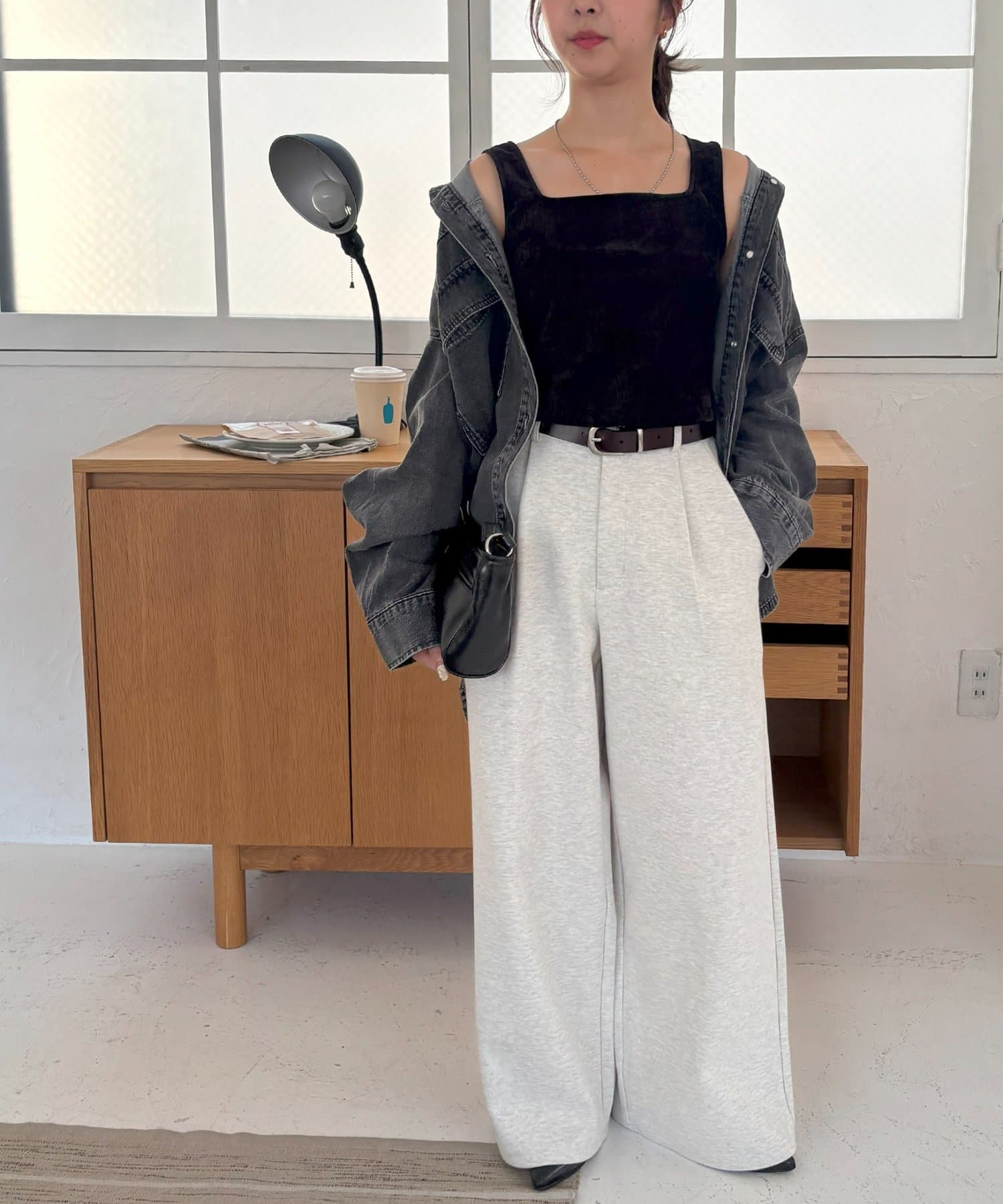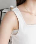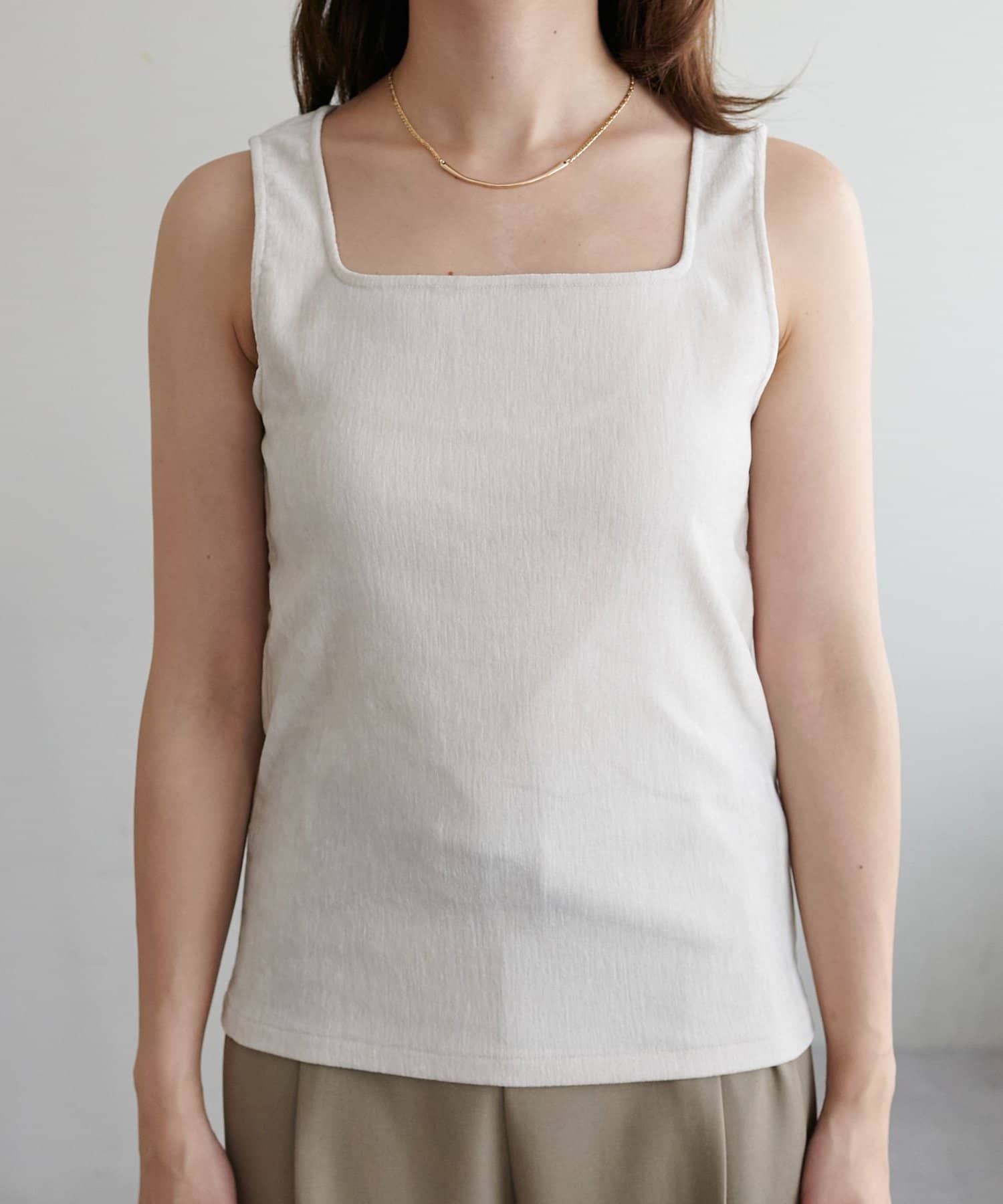 タンクトップは、鎖骨がきれいに見えるスクエアネック仕様で、女性らしさとモード感を兼ね備えたシルエットが魅力。