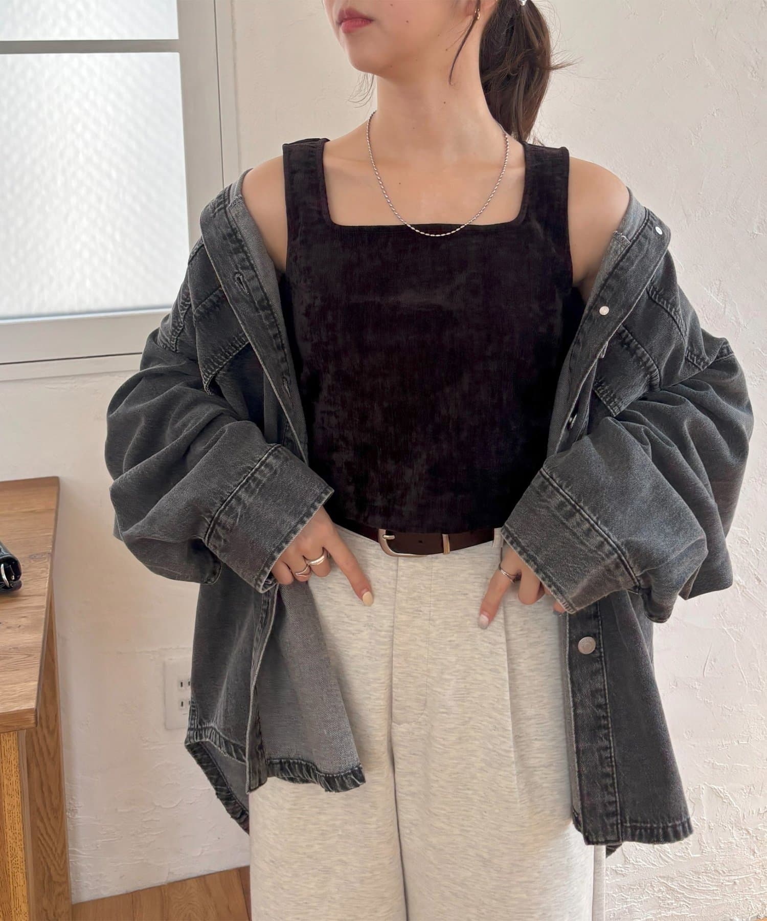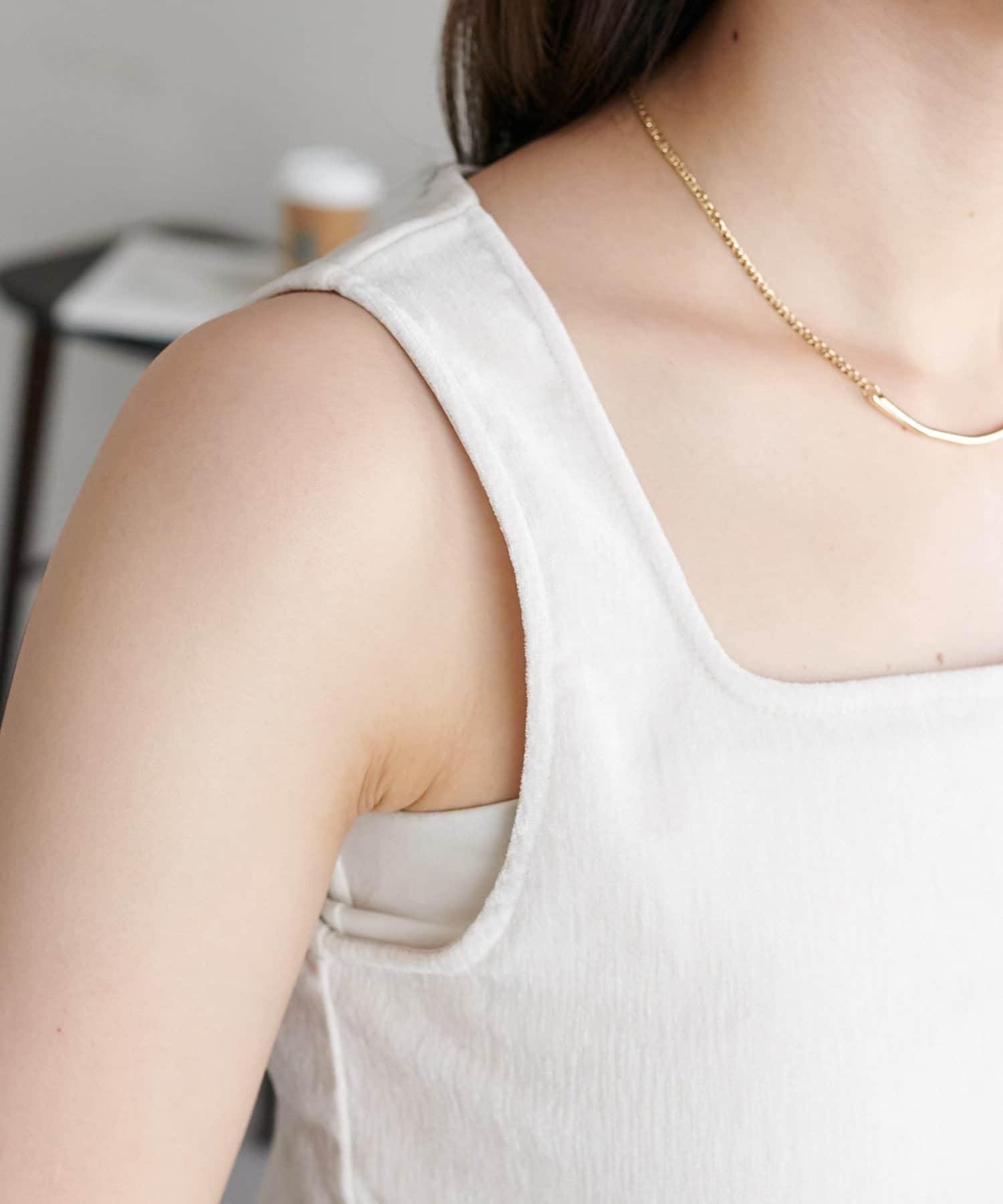 155cmスタッフ:ベロア素材だけど杢調なので派手すぎず、大人っぽく着こなせます。タンクはスクエアネックで顔まわりがすっきり見えて、ジャケットやシャツのインナーにもぴったりです。