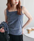 155cmスタッフ:ベロア素材だけど杢調なので派手すぎず、大人っぽく着こなせます。タンクはスクエアネックで顔まわりがすっきり見えて、ジャケットやシャツのインナーにもぴったりです。