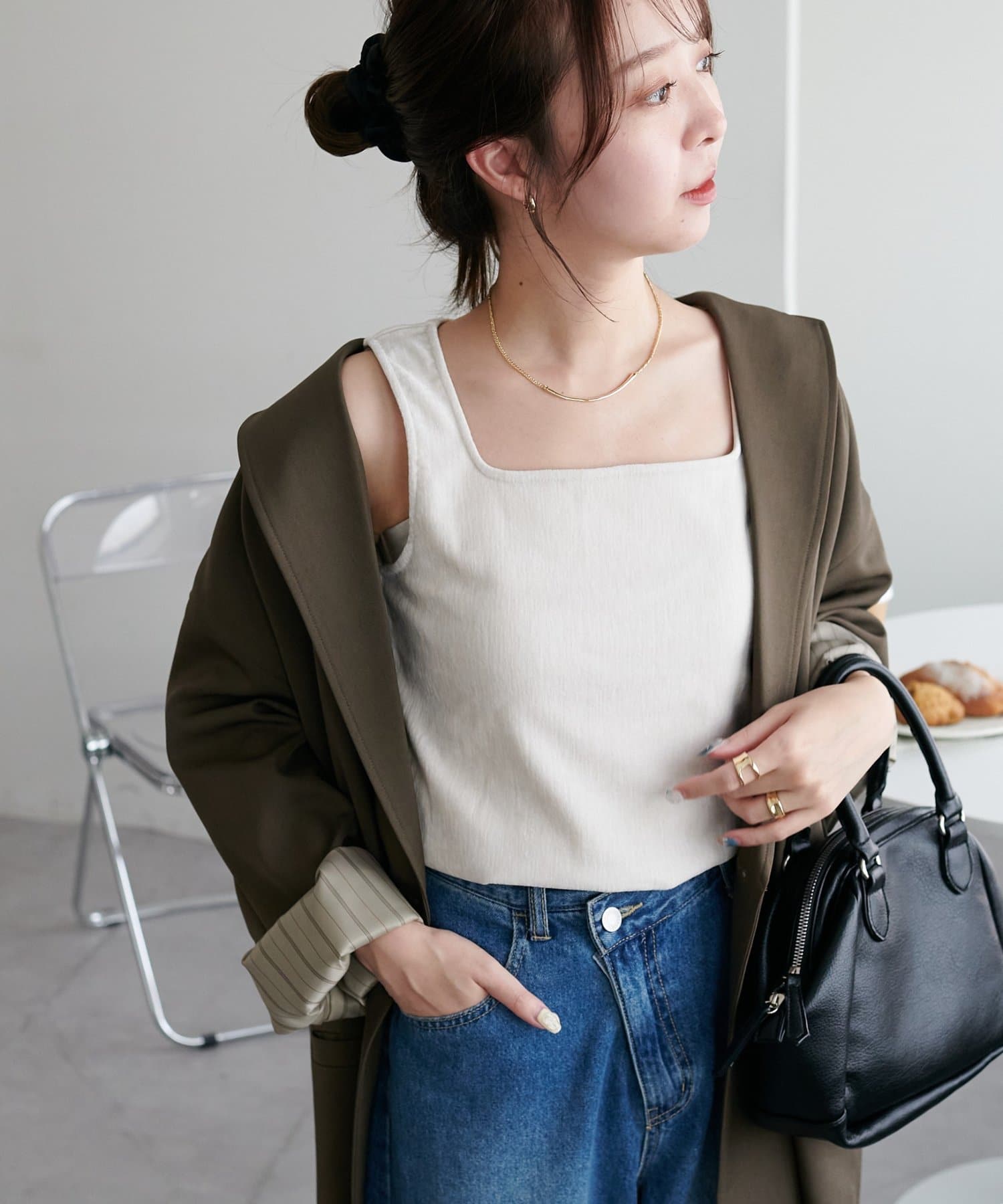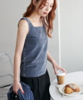 タンクトップは、鎖骨がきれいに見えるスクエアネック仕様で、女性らしさとモード感を兼ね備えたシルエットが魅力。