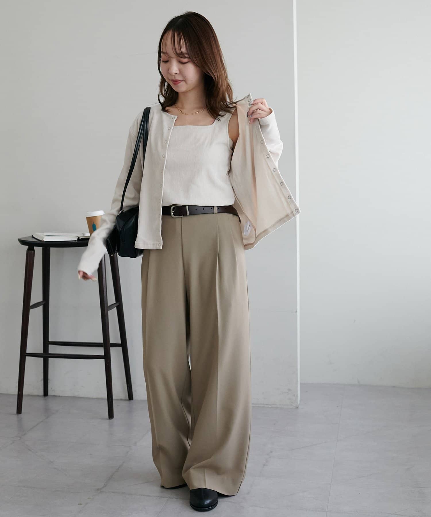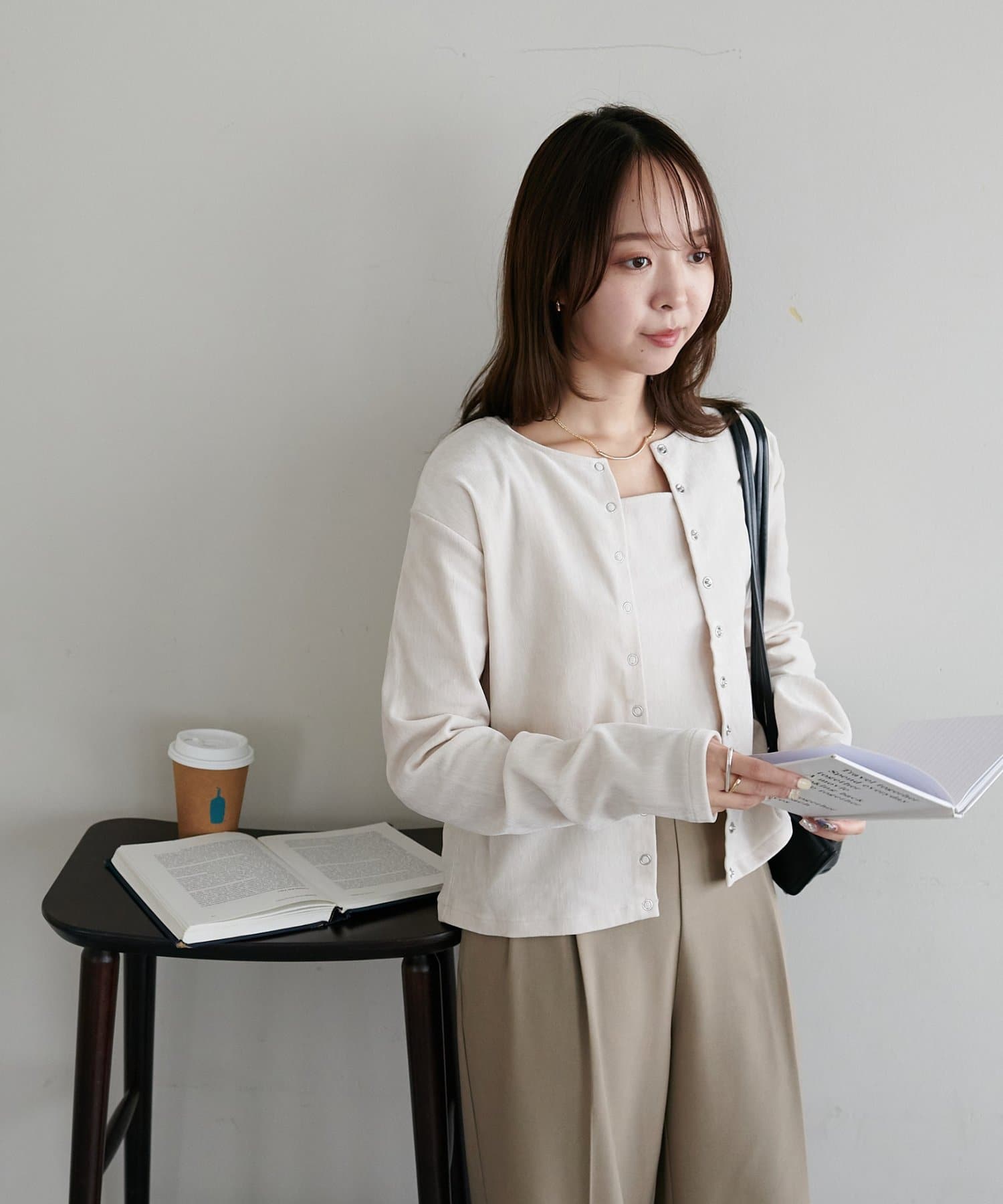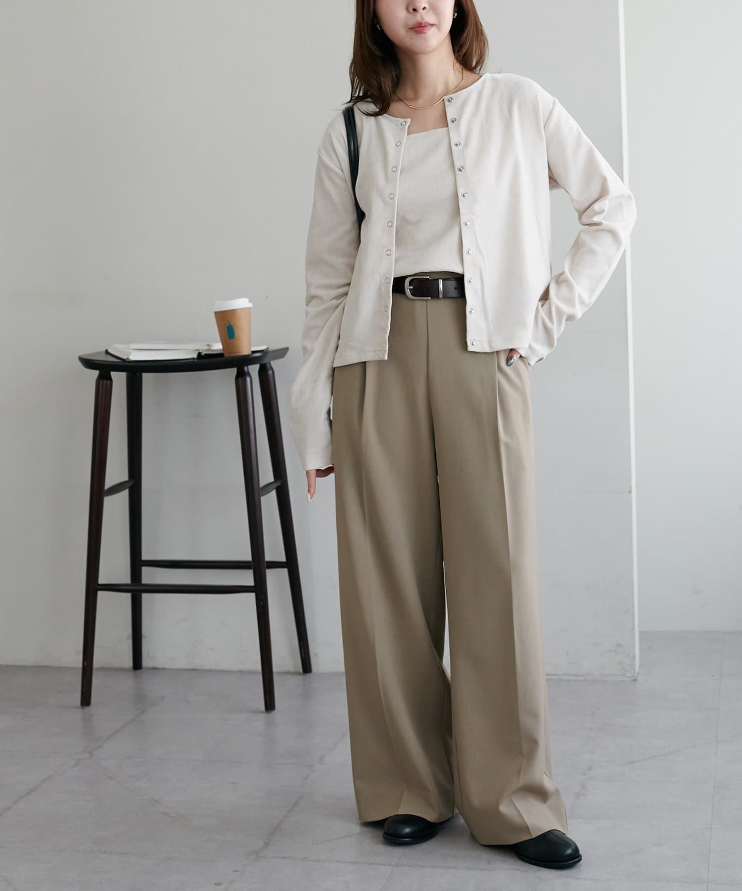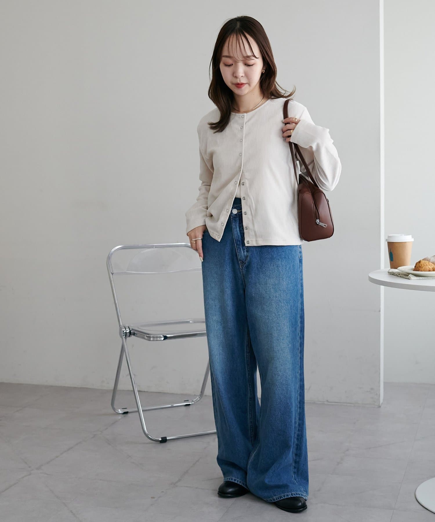 162cmスタッフ:カーディガンは程よくゆったりしていて、羽織るだけで抜け感のあるスタイリングになります。ボタンを全部閉じればプルオーバー風にも着られて、着回しの幅が広いです◎