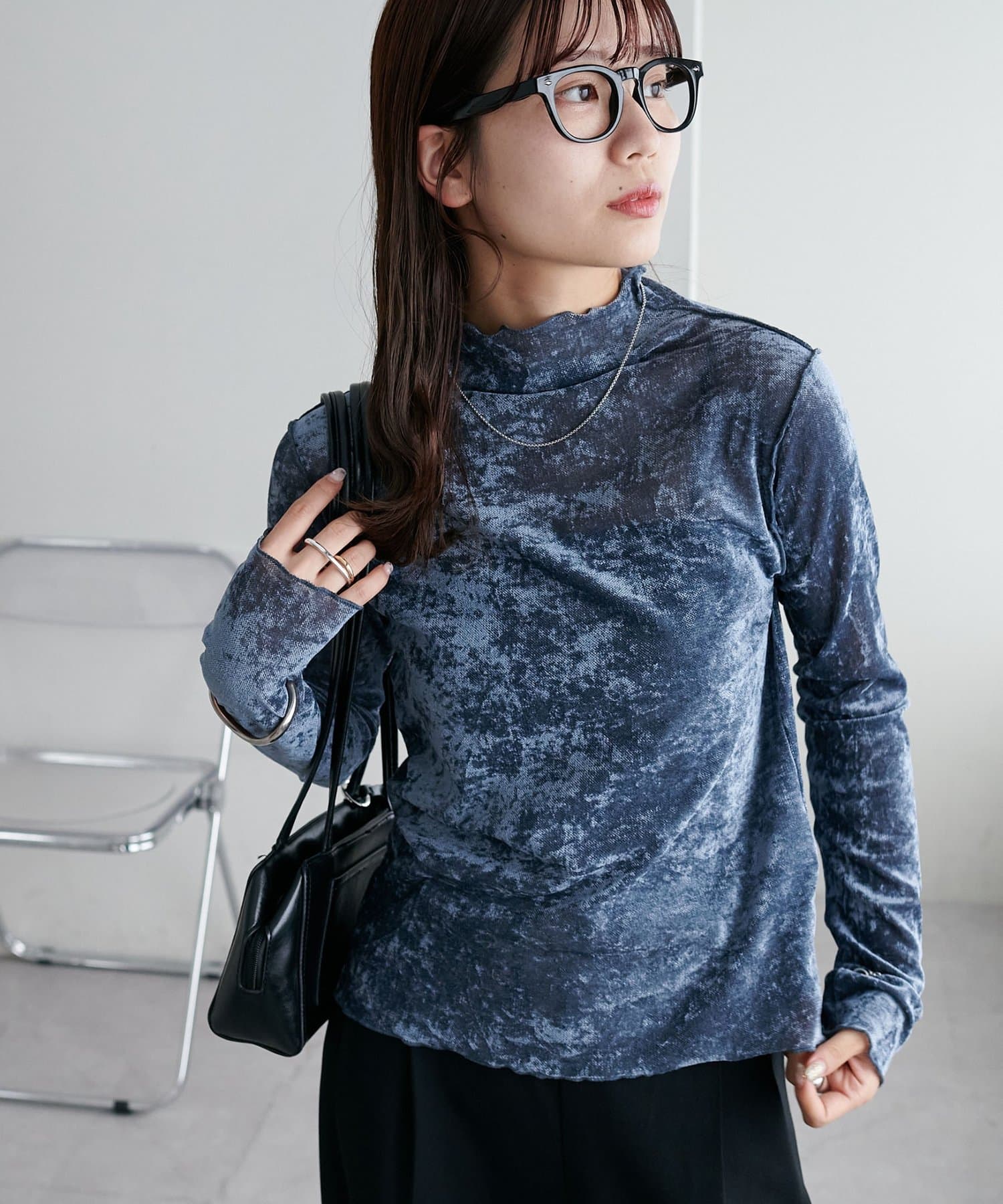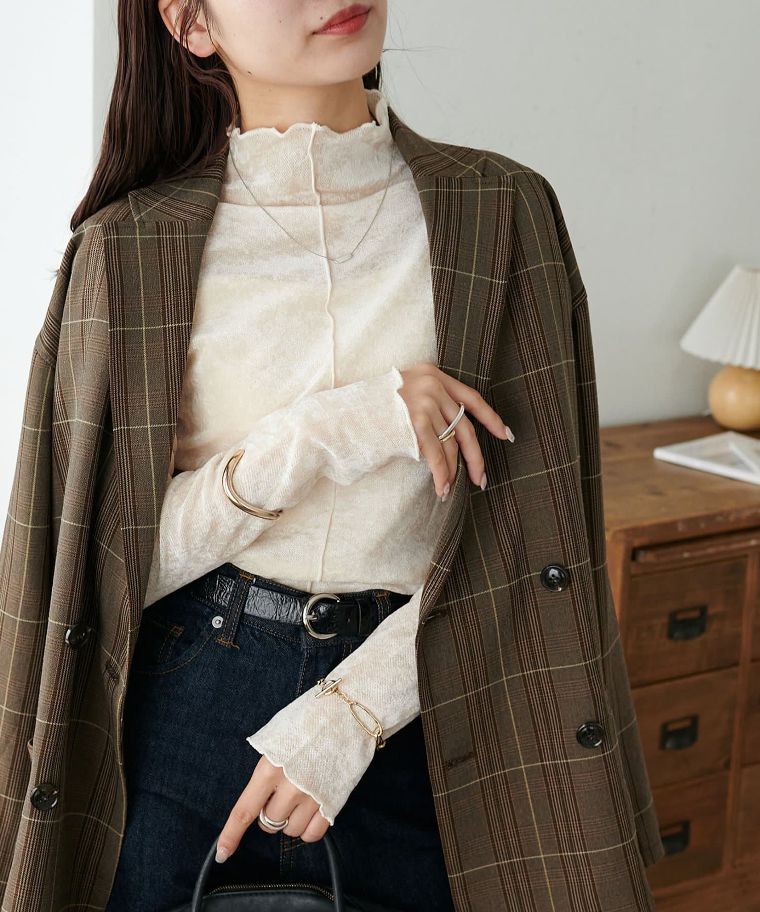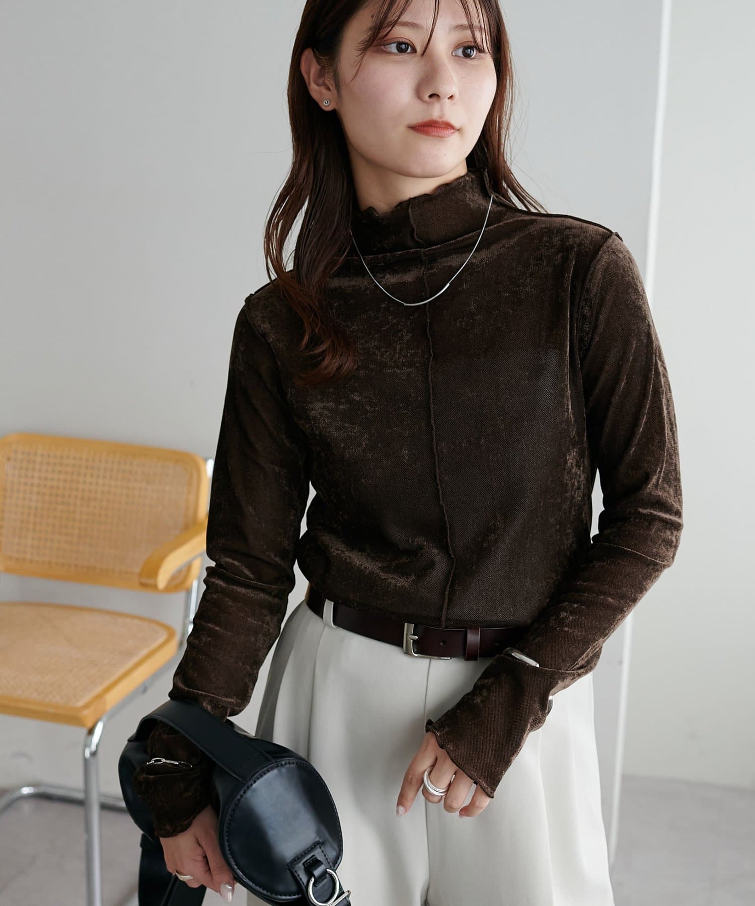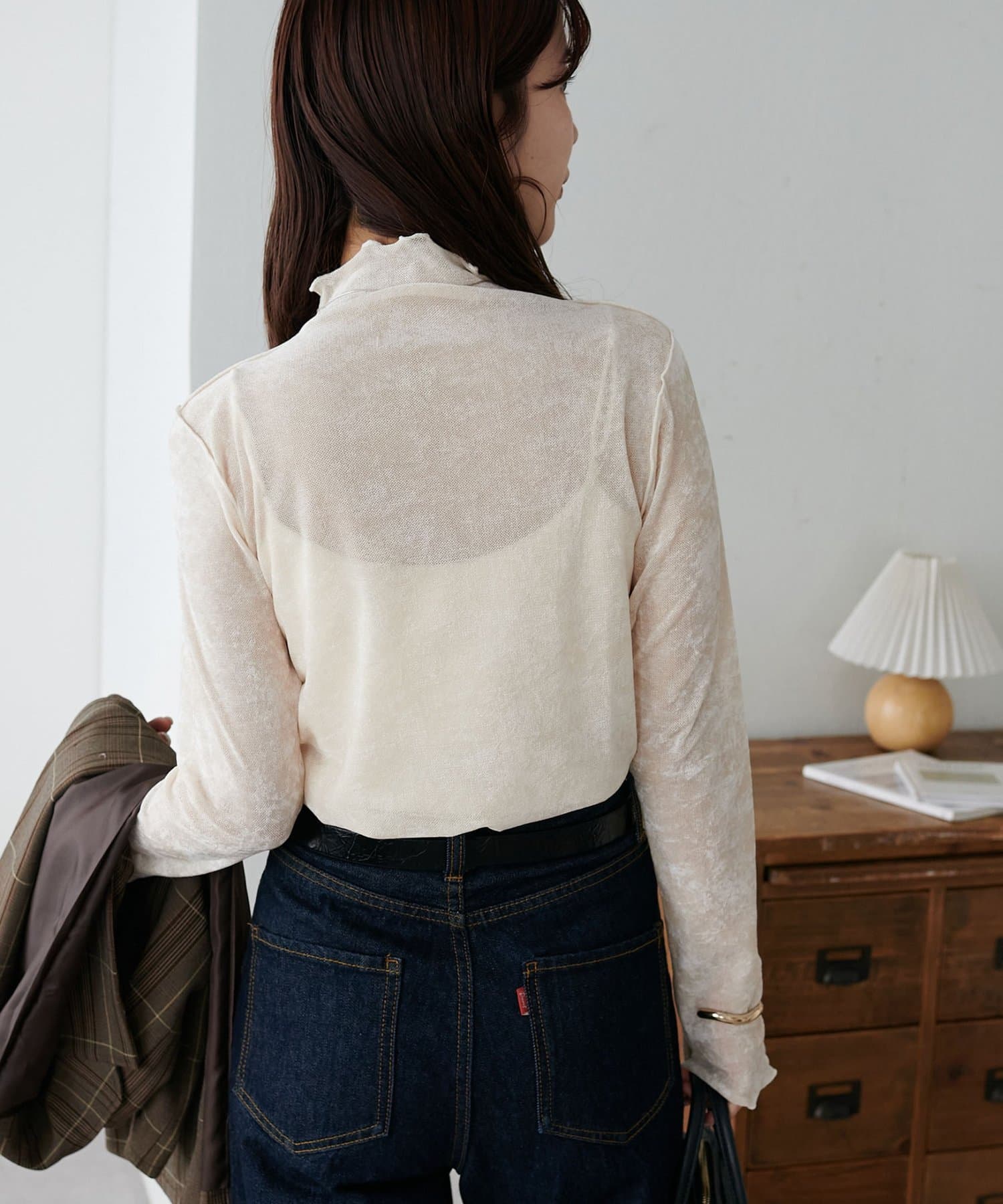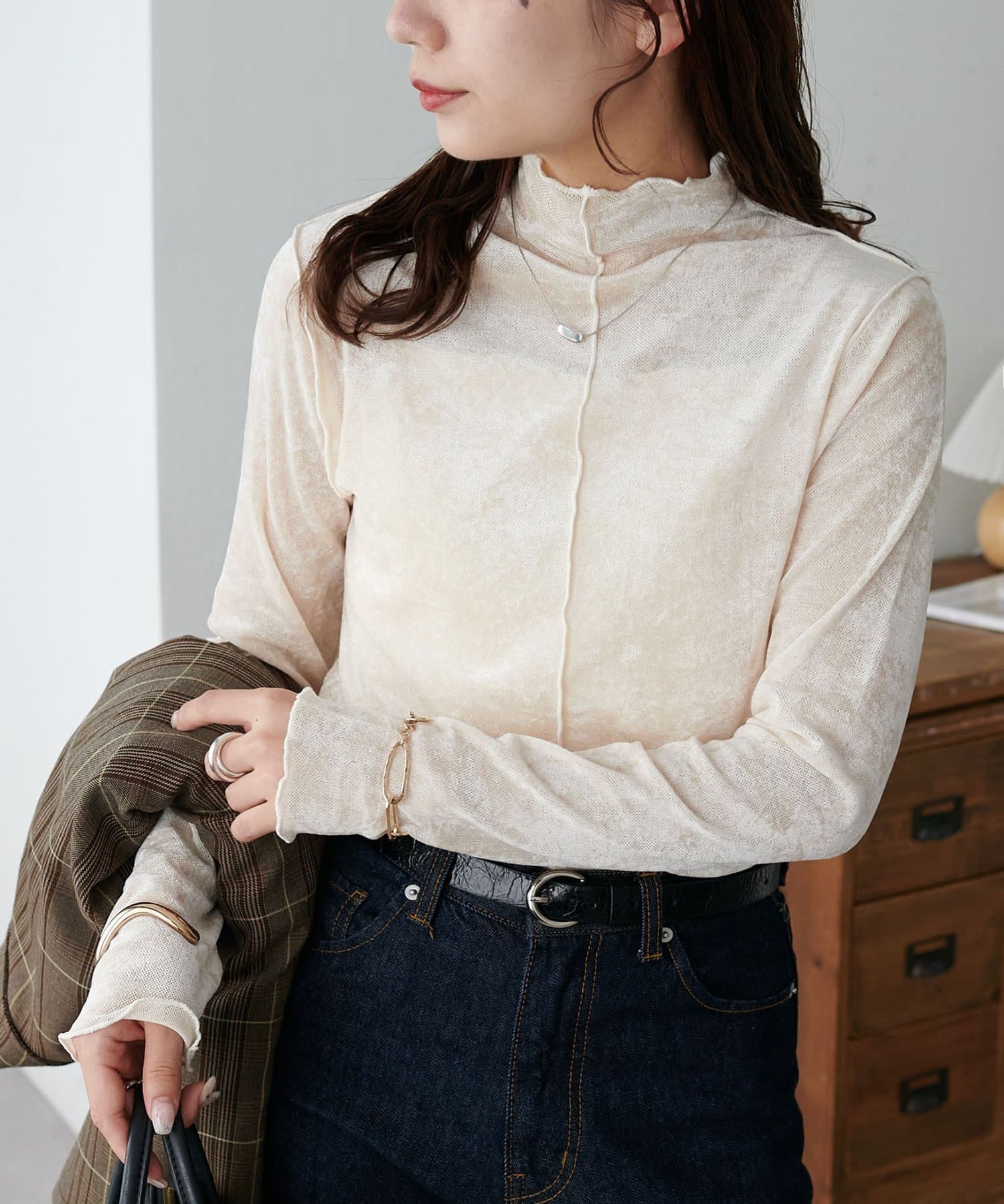 ほんのり抜け感のあるシアー素材に、メロウ仕上げのハイネックと袖口が女性らしいアクセントに。