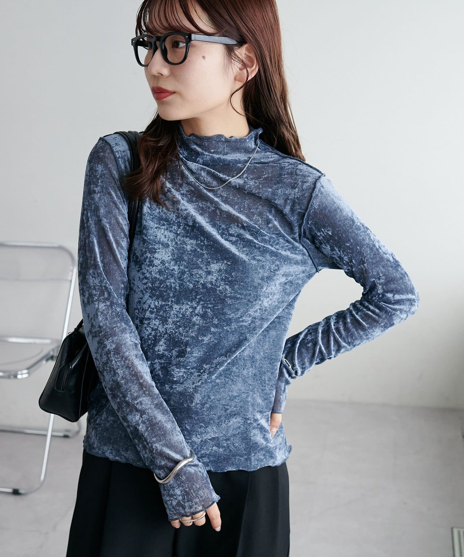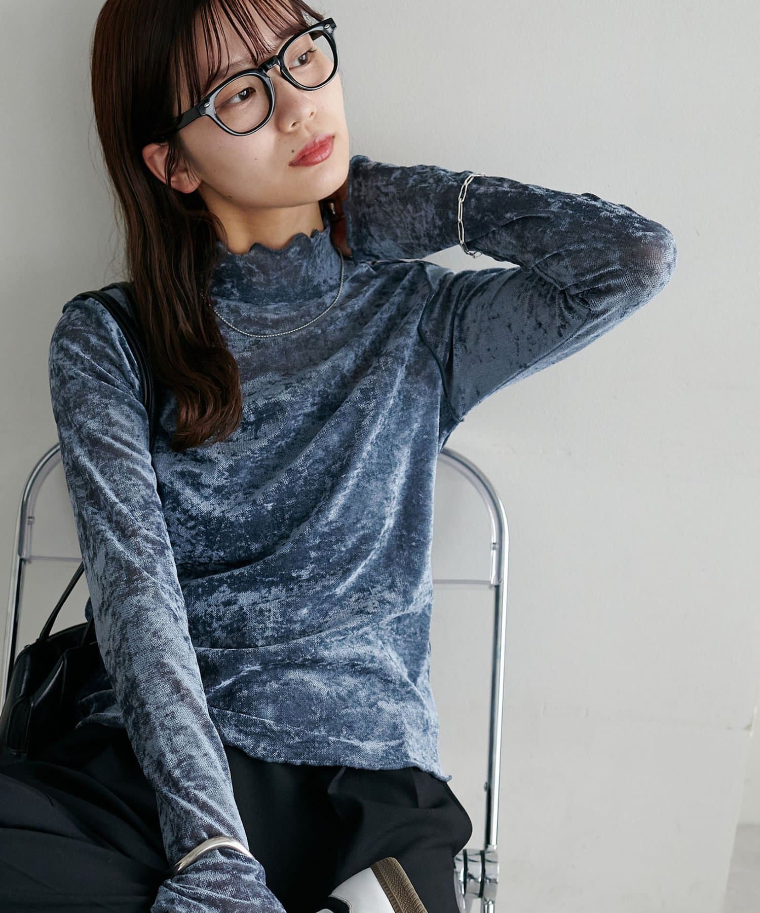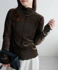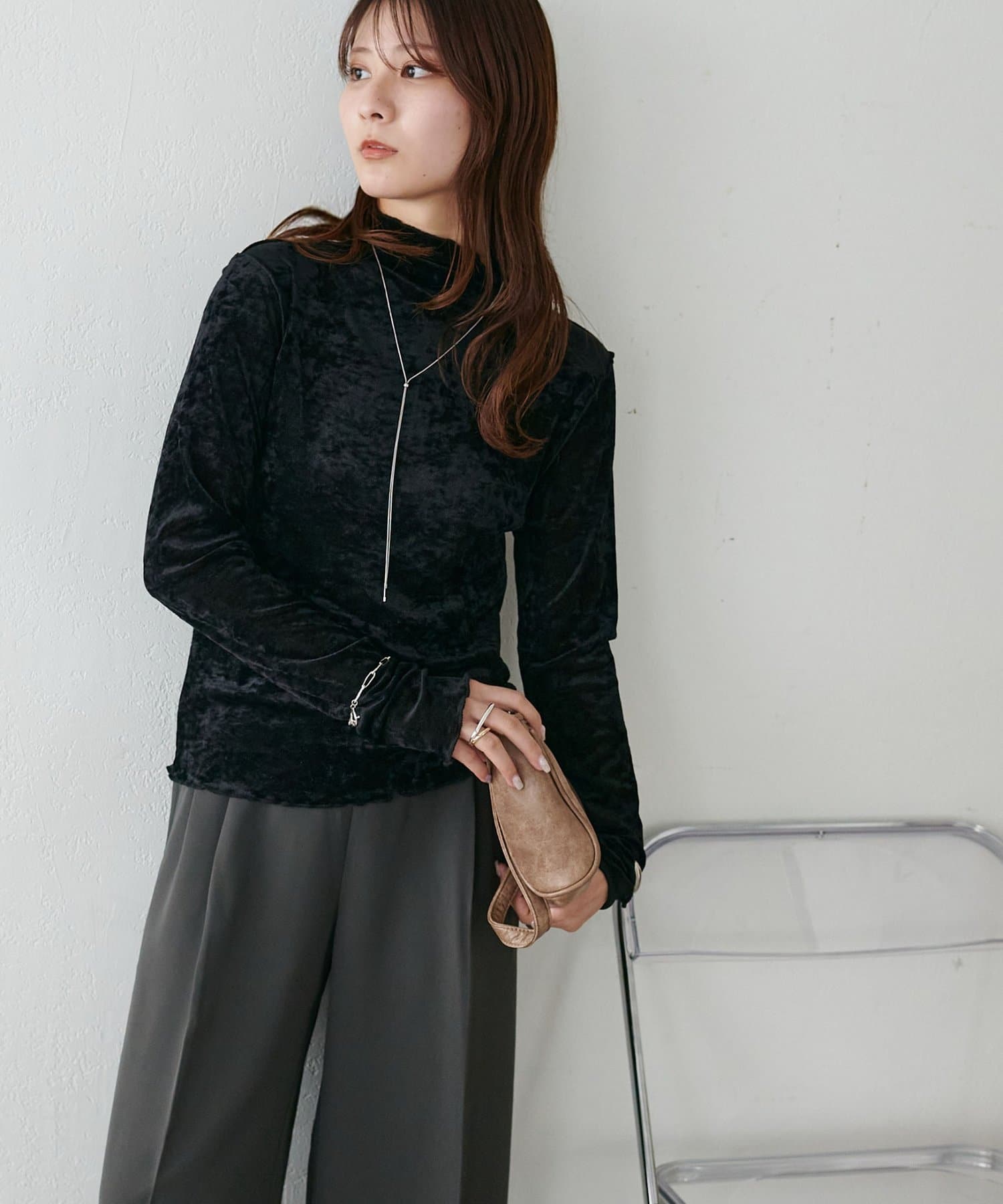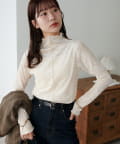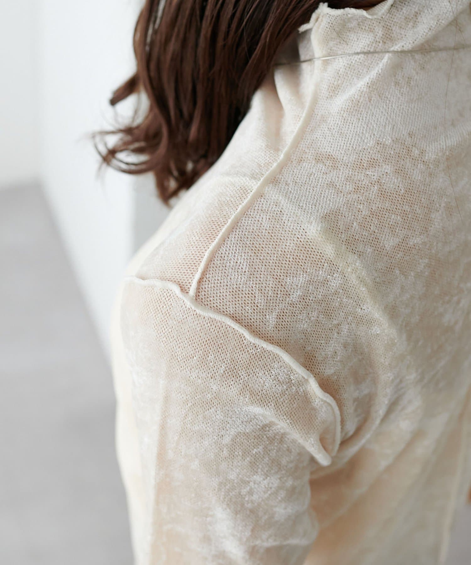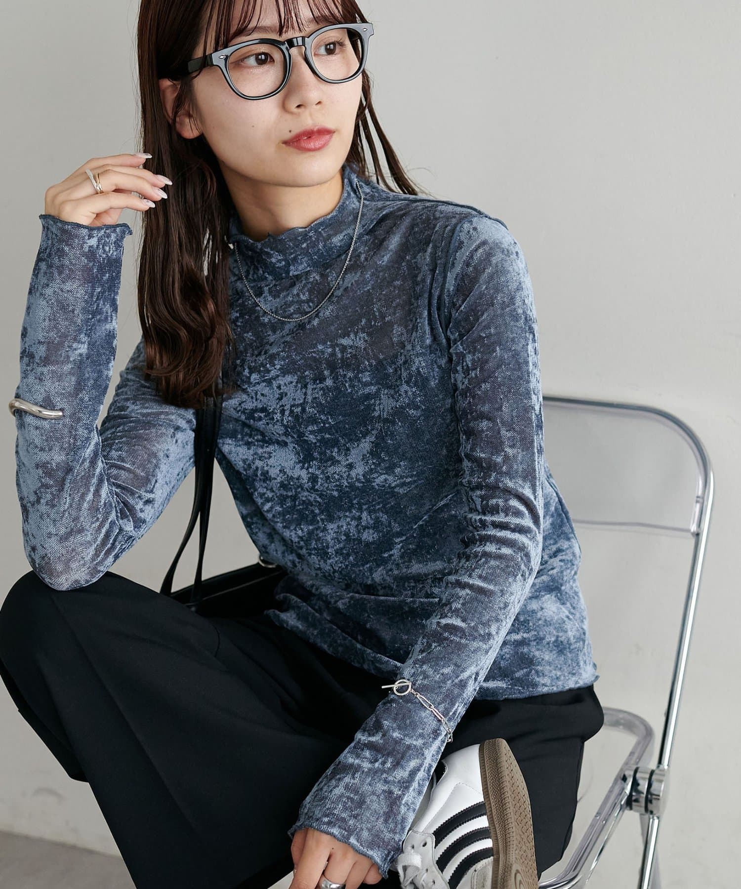ほんのり抜け感のあるシアー素材に、メロウ仕上げのハイネックと袖口が女性らしいアクセントに。