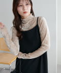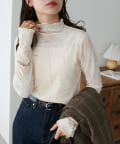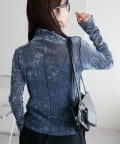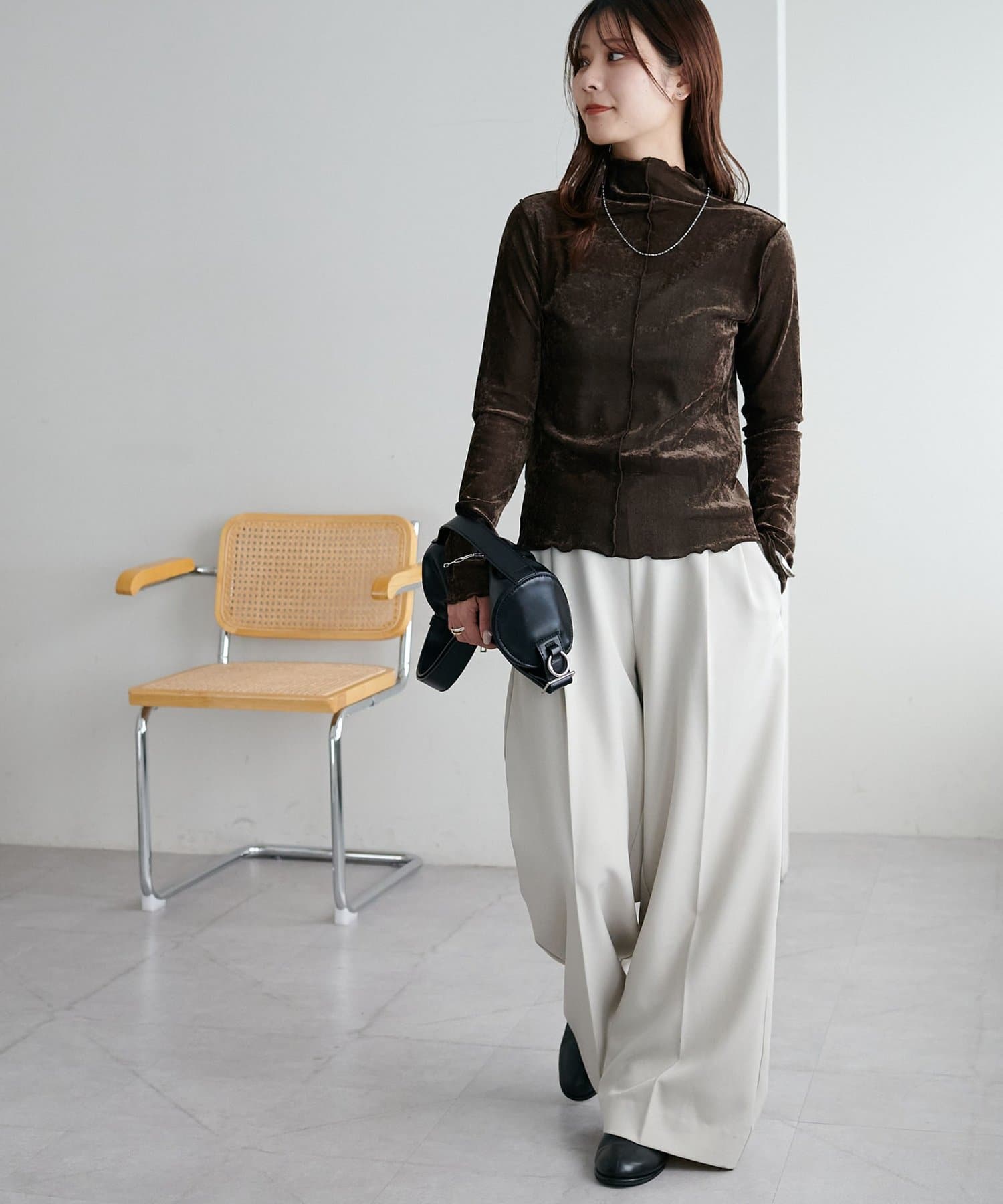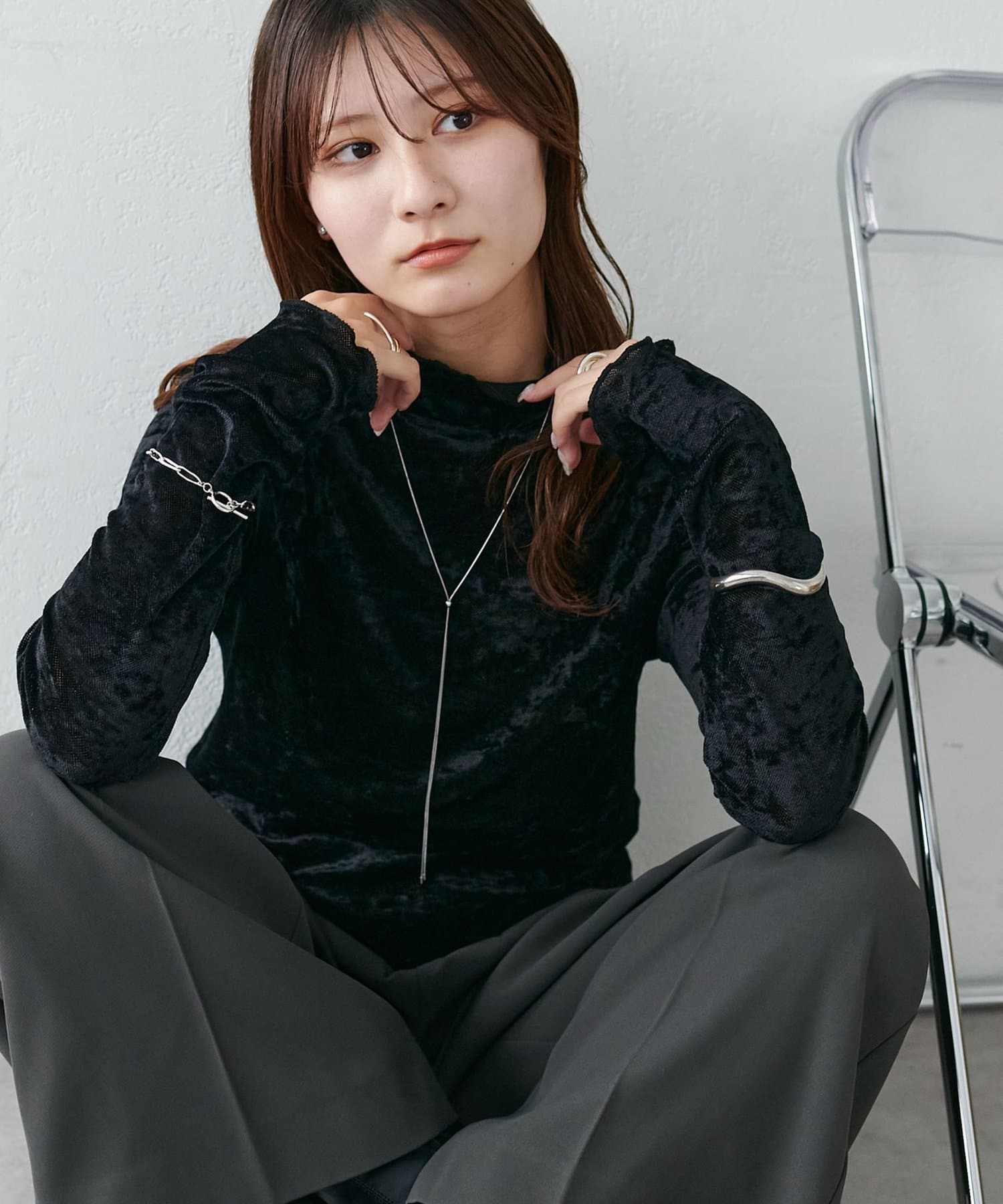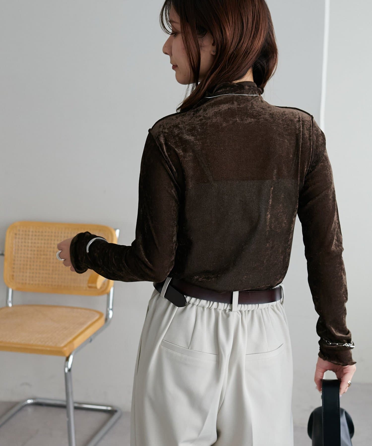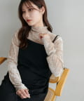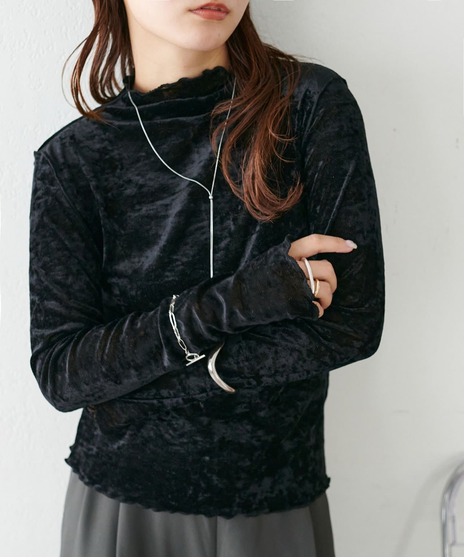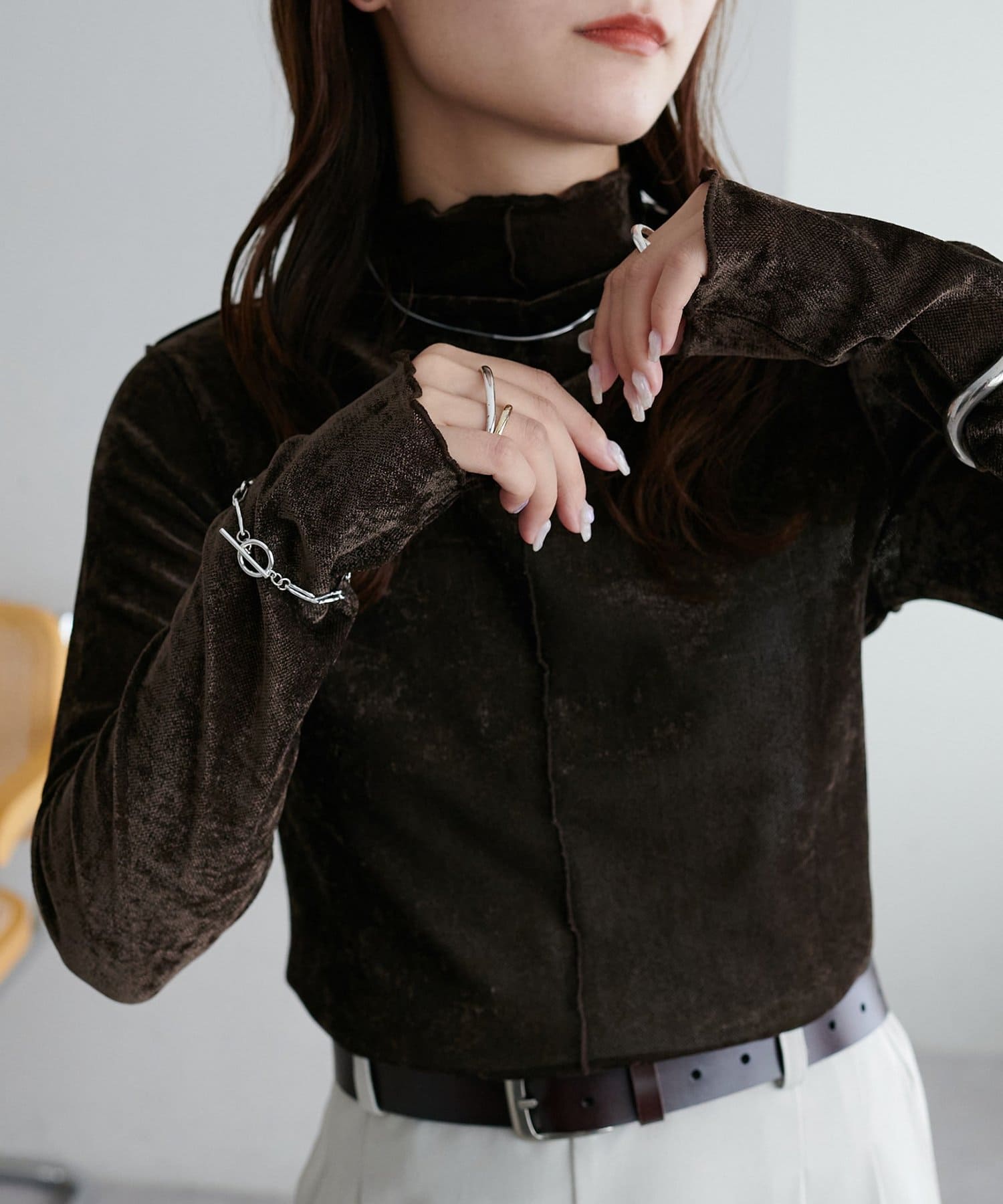 ほんのり抜け感のあるシアー素材に、メロウ仕上げのハイネックと袖口が女性らしいアクセントに。