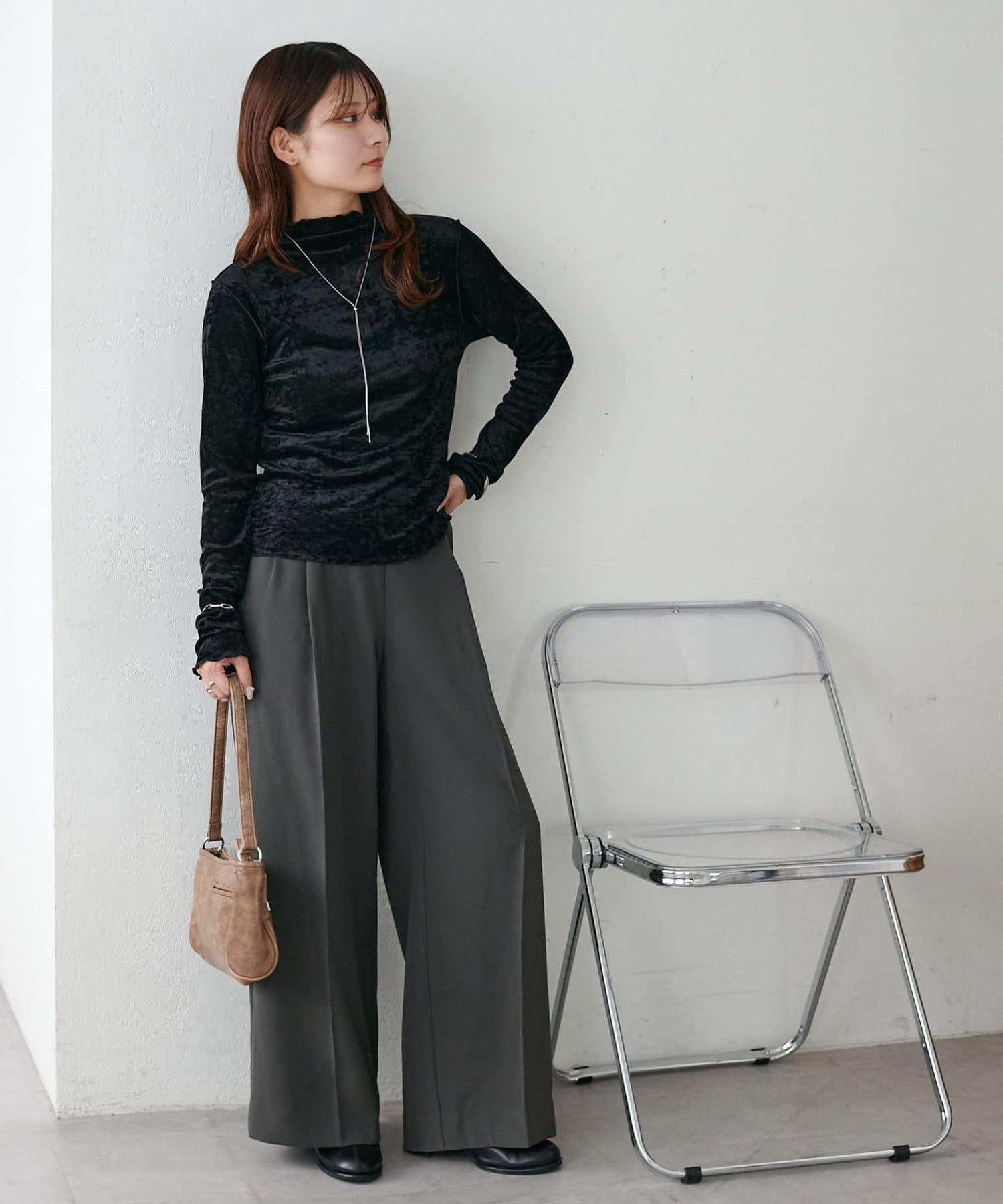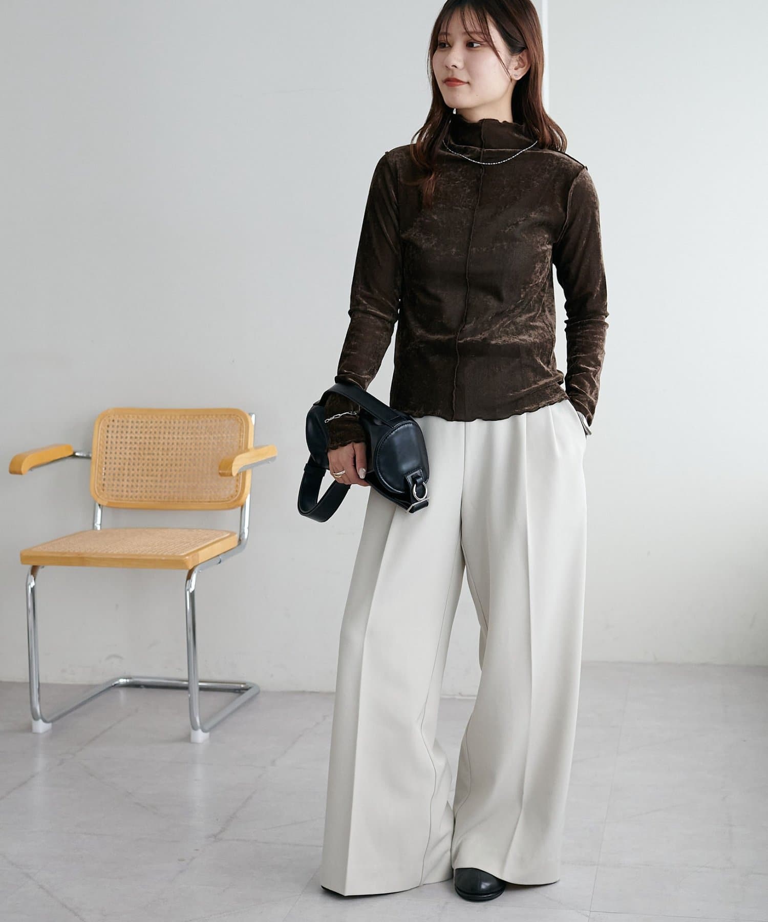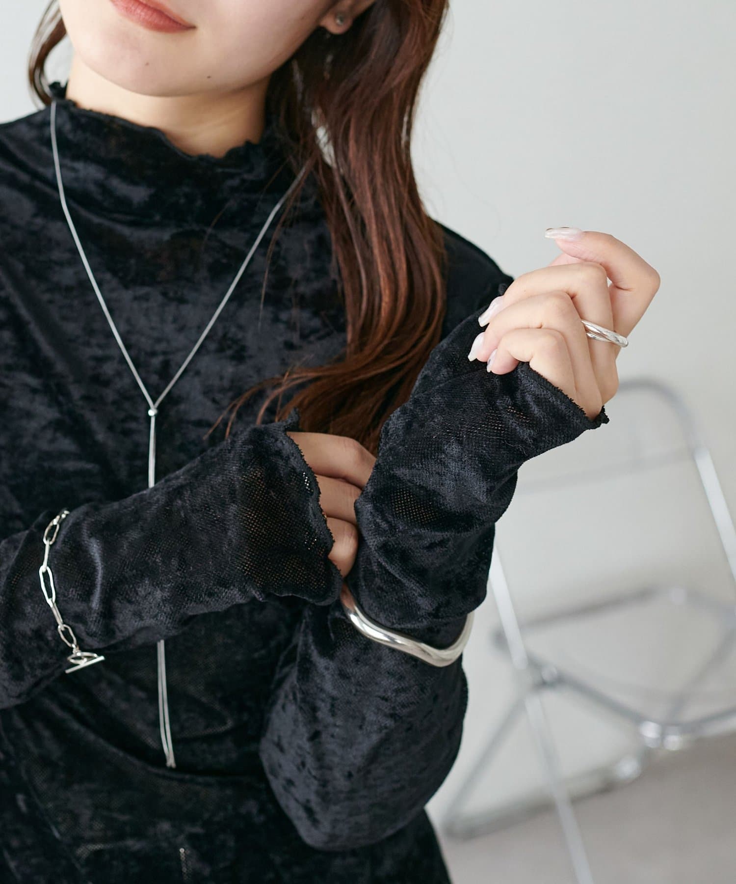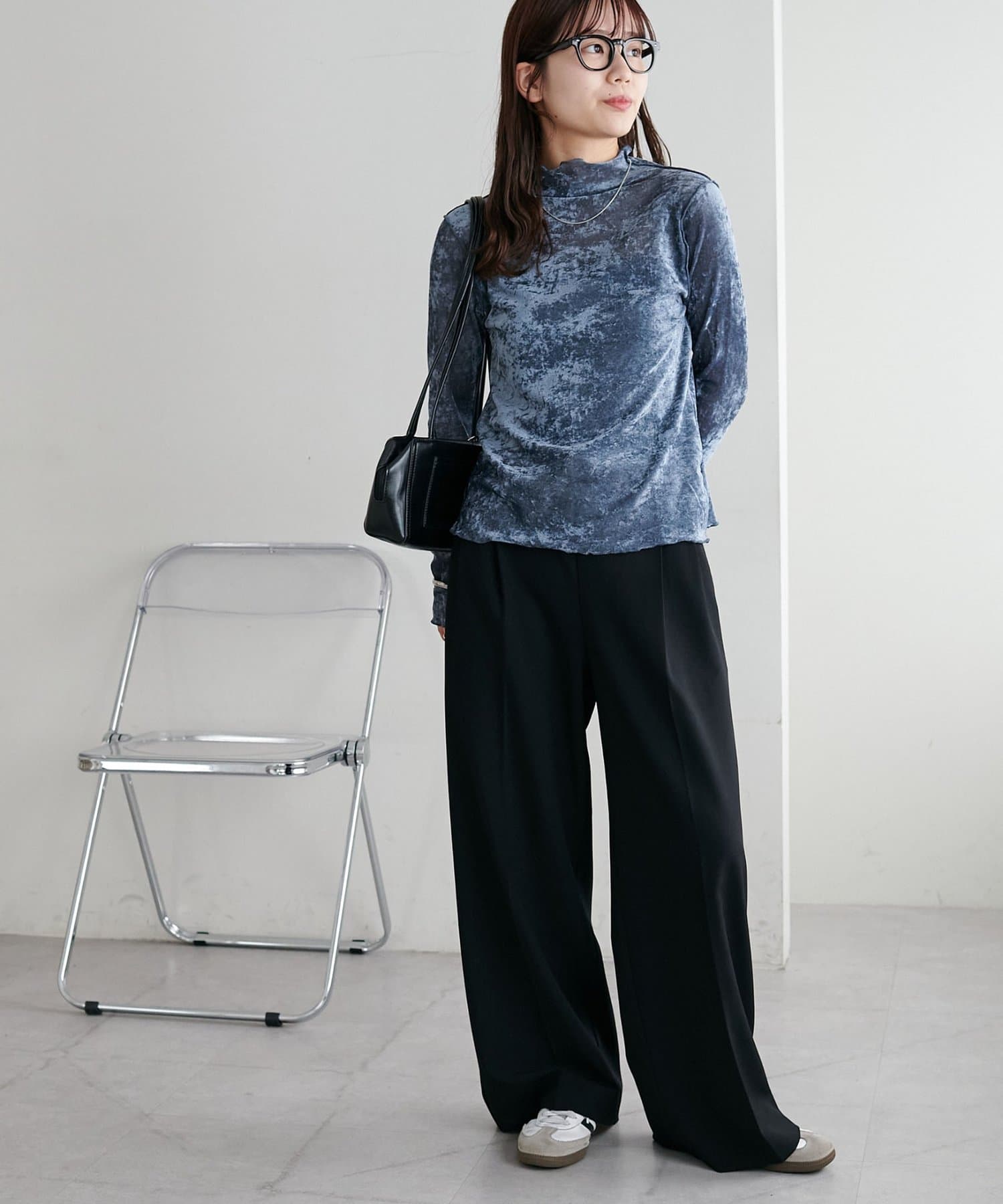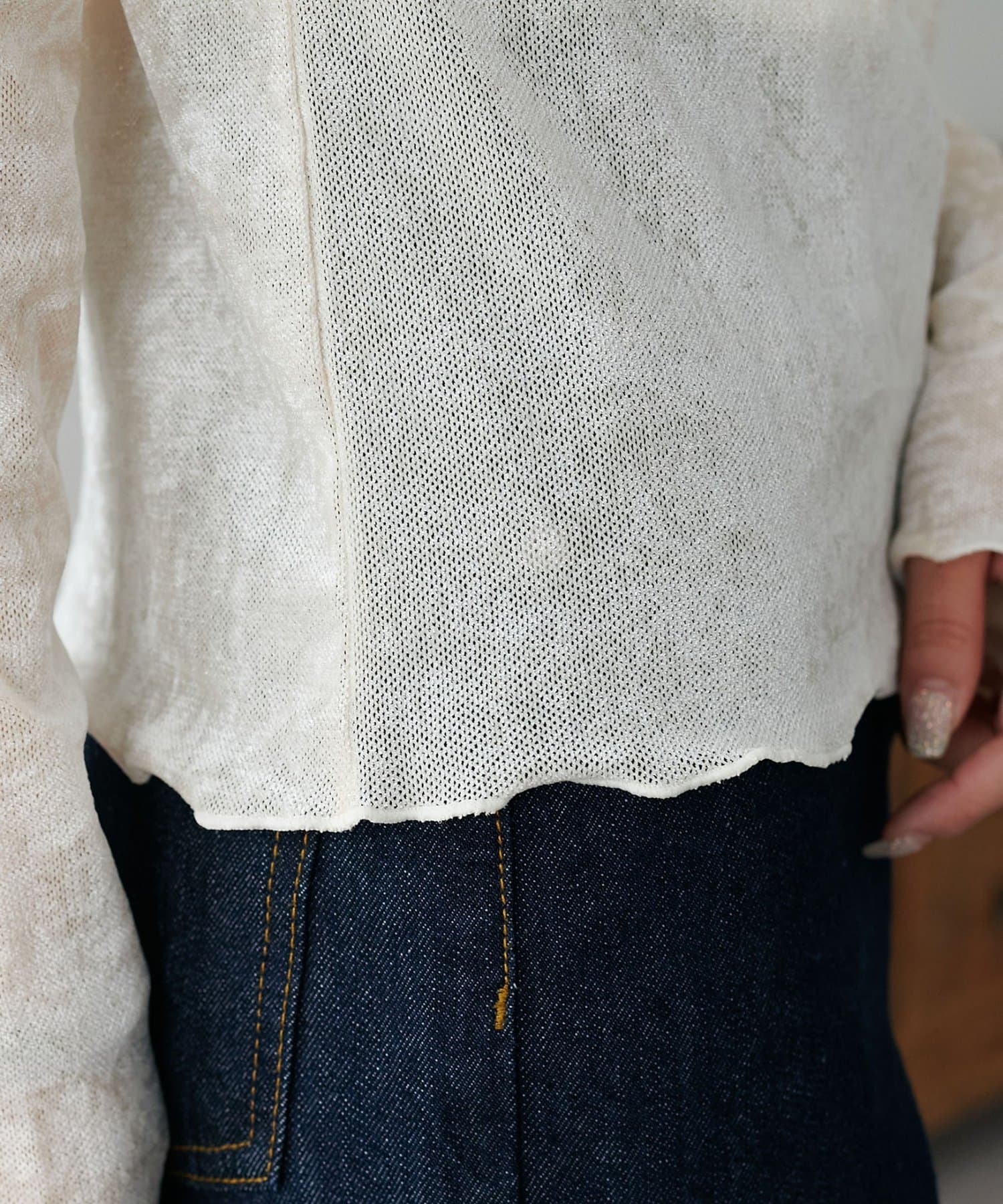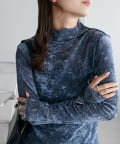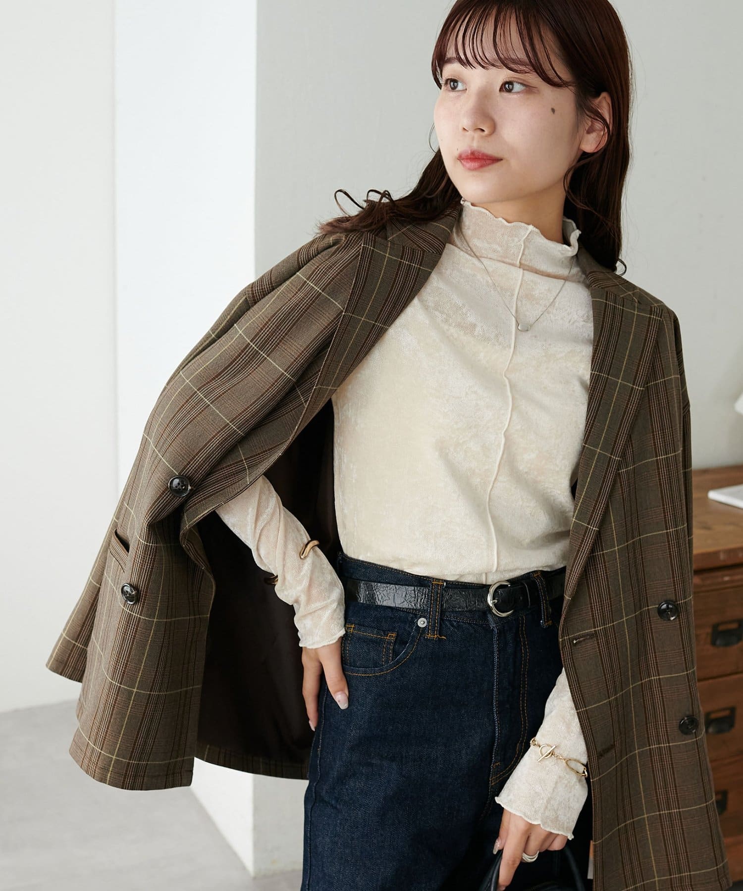 ほんのり抜け感のあるシアー素材に、メロウ仕上げのハイネックと袖口が女性らしいアクセントに。
