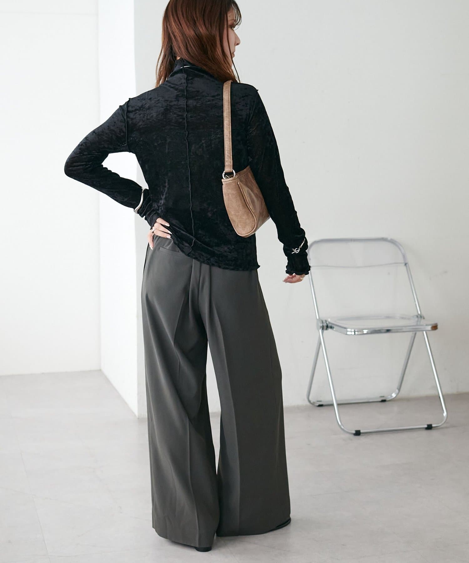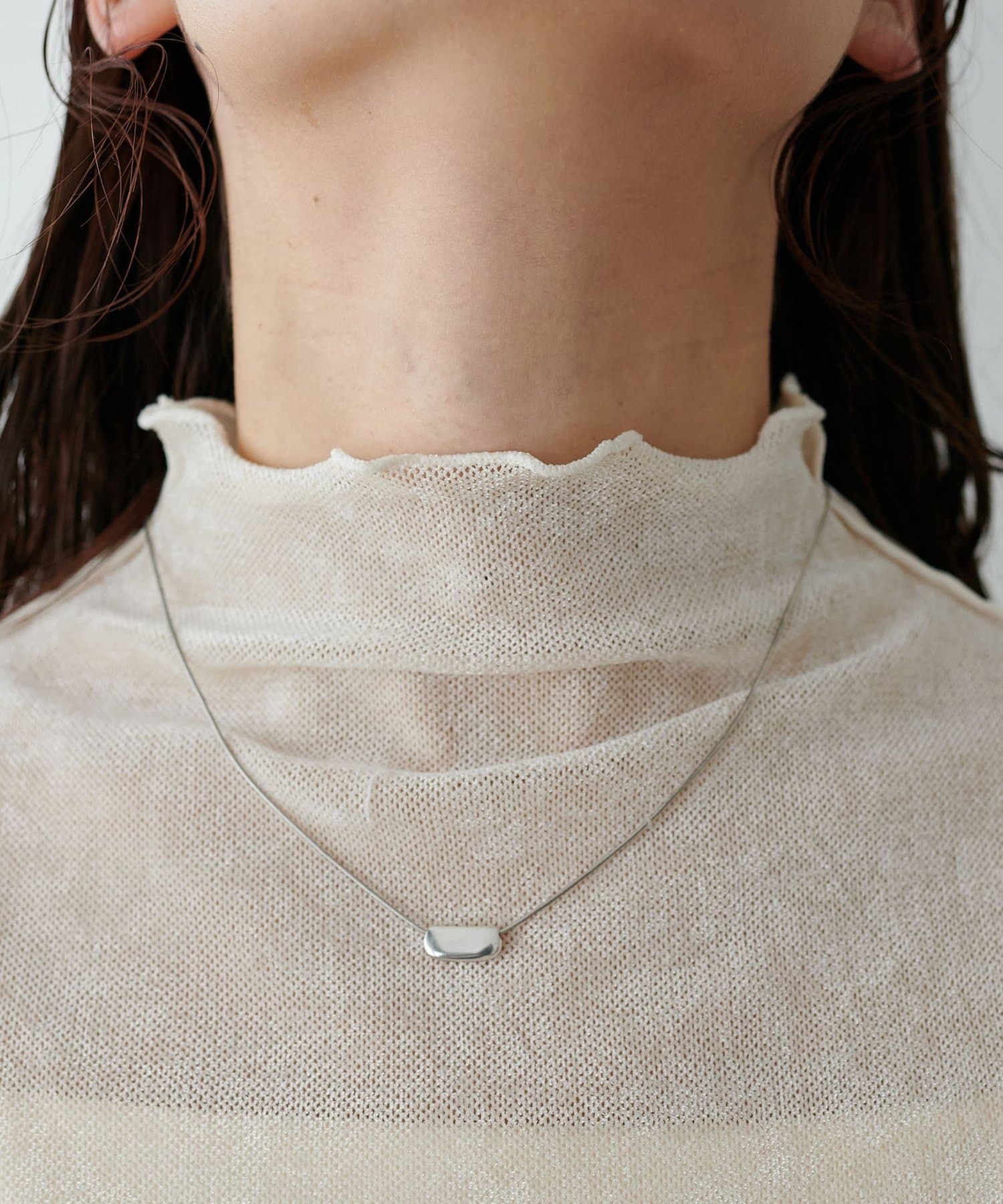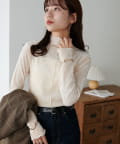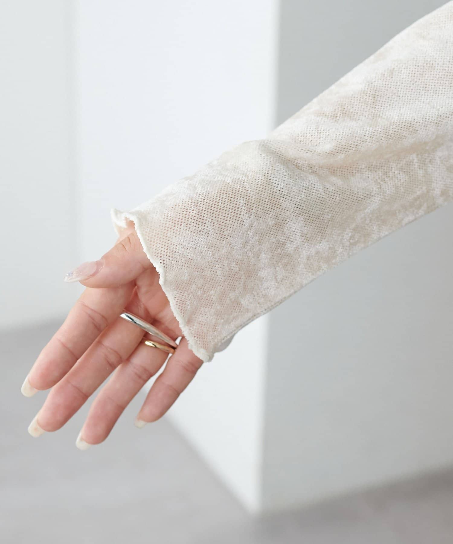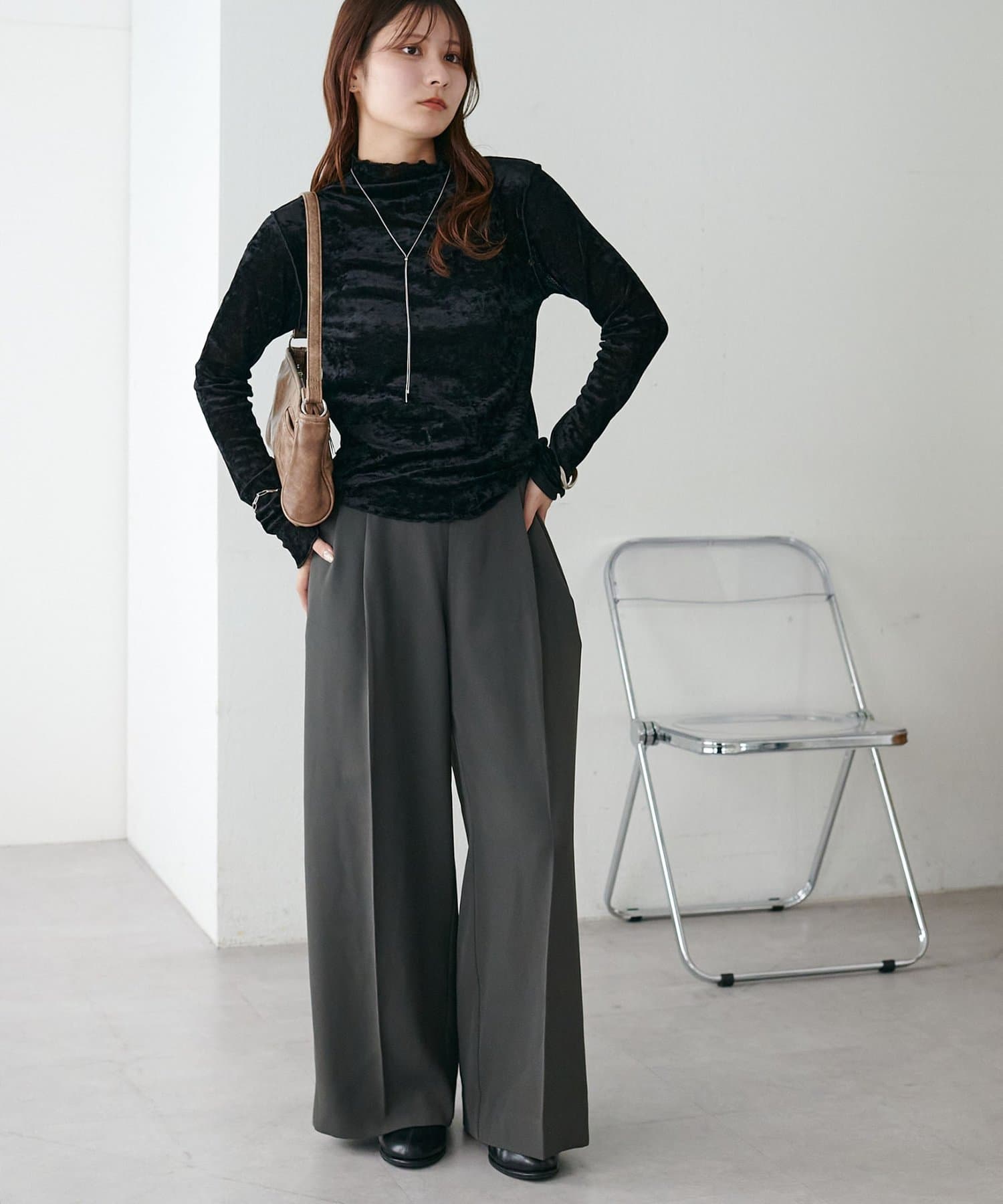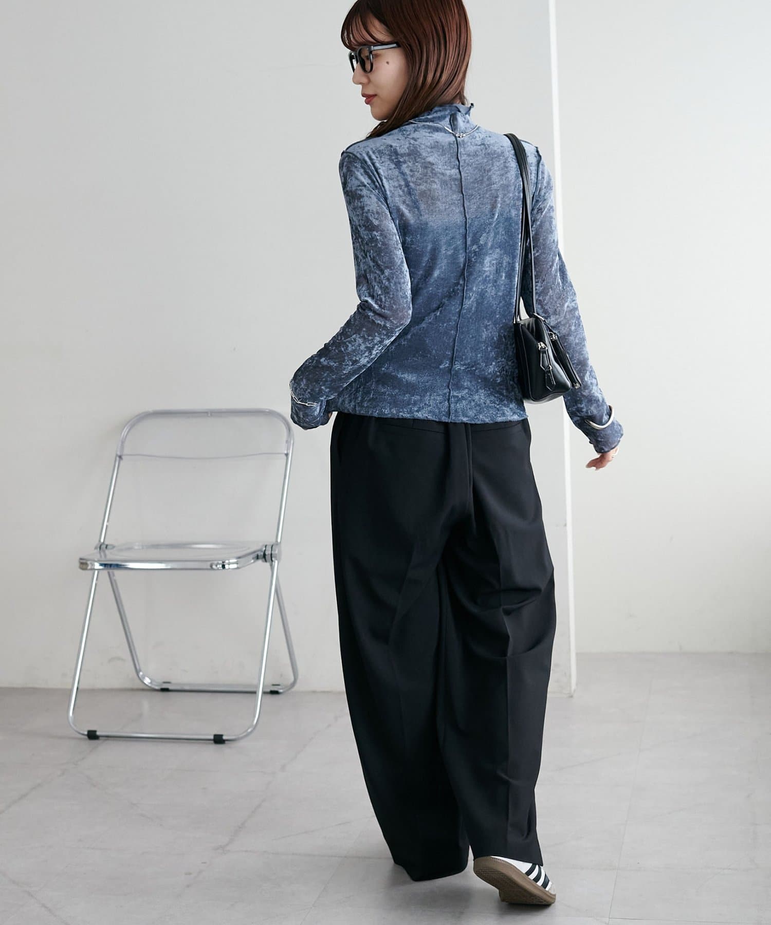 ほんのり抜け感のあるシアー素材に、メロウ仕上げのハイネックと袖口が女性らしいアクセントに。