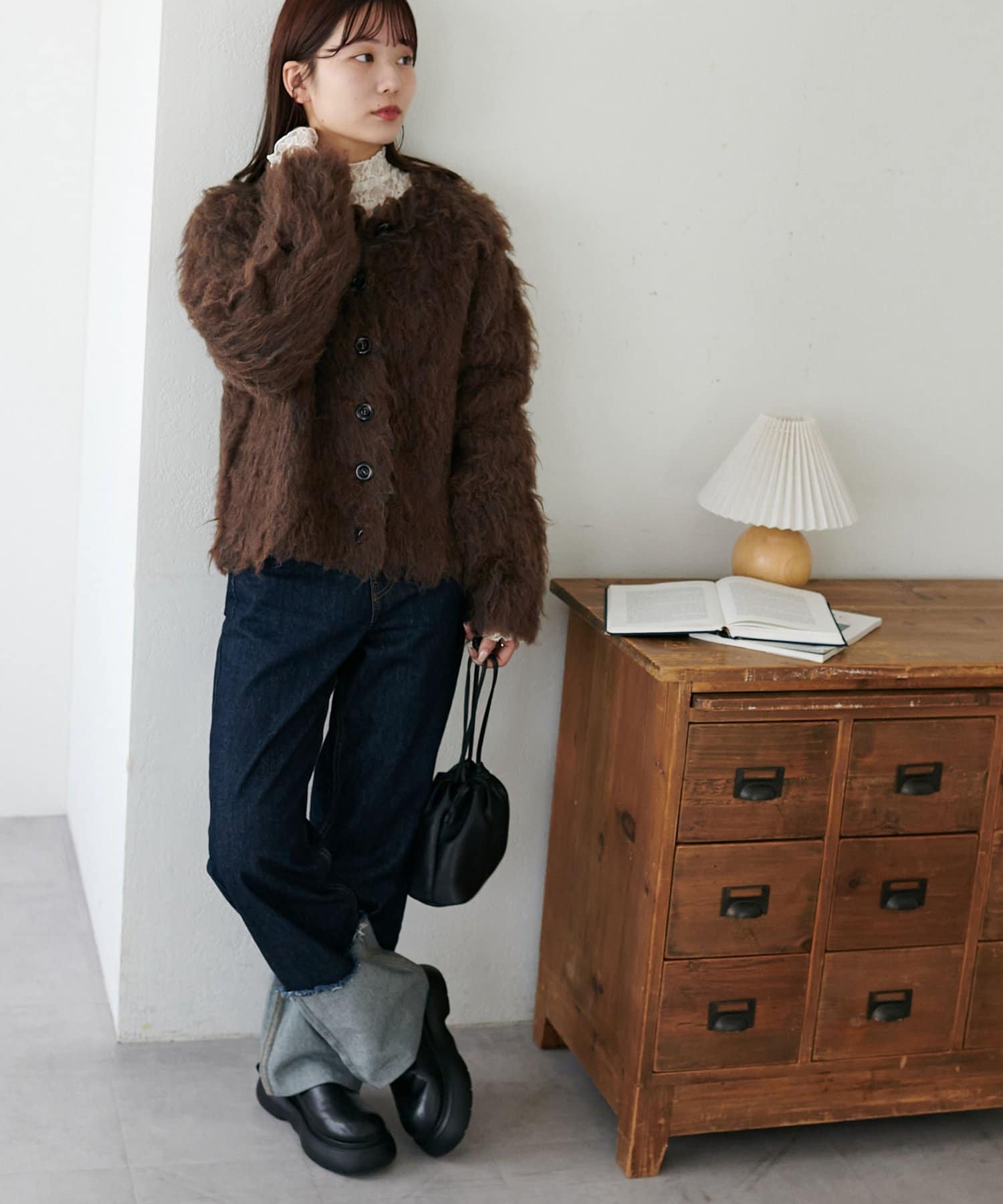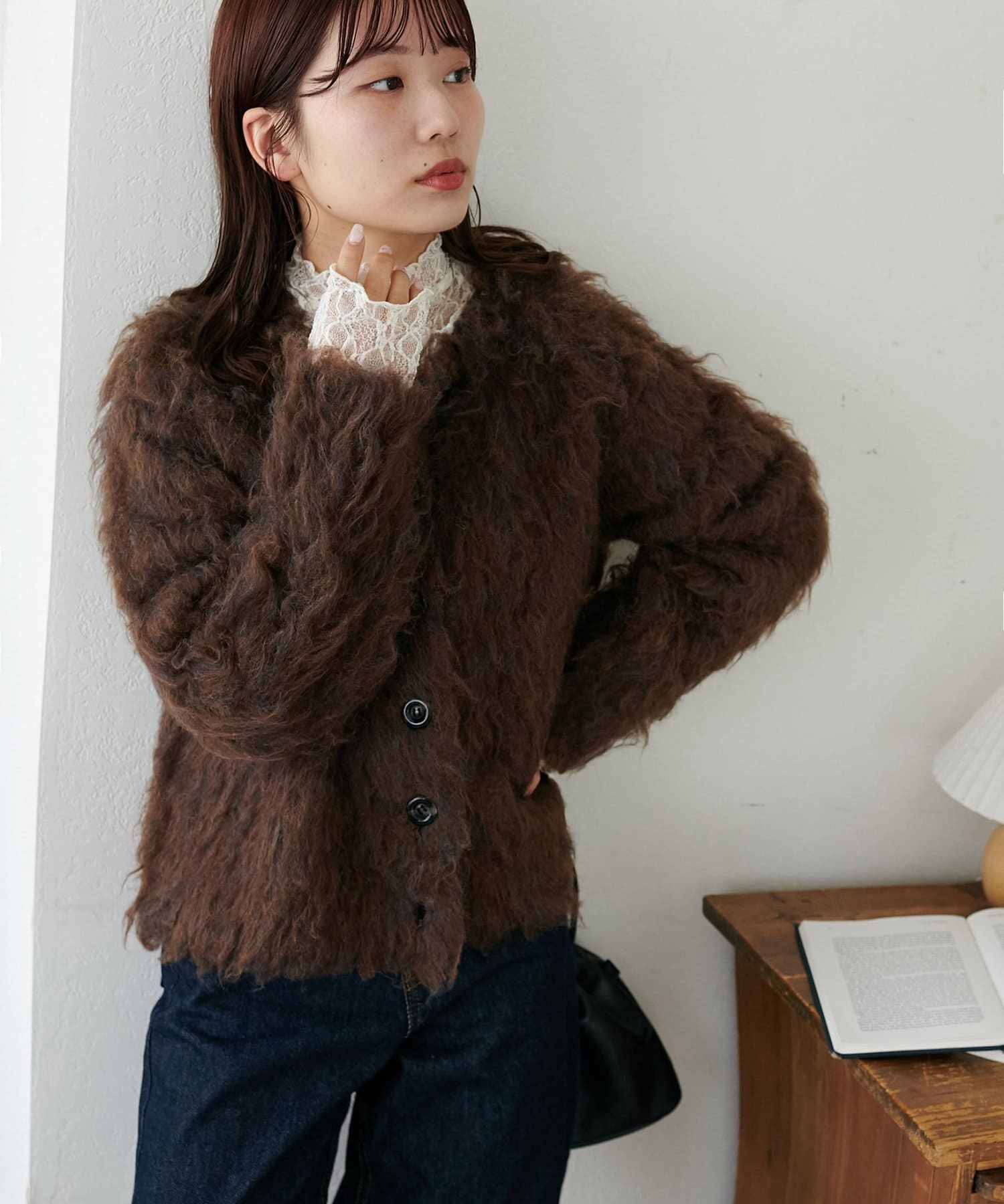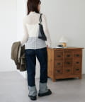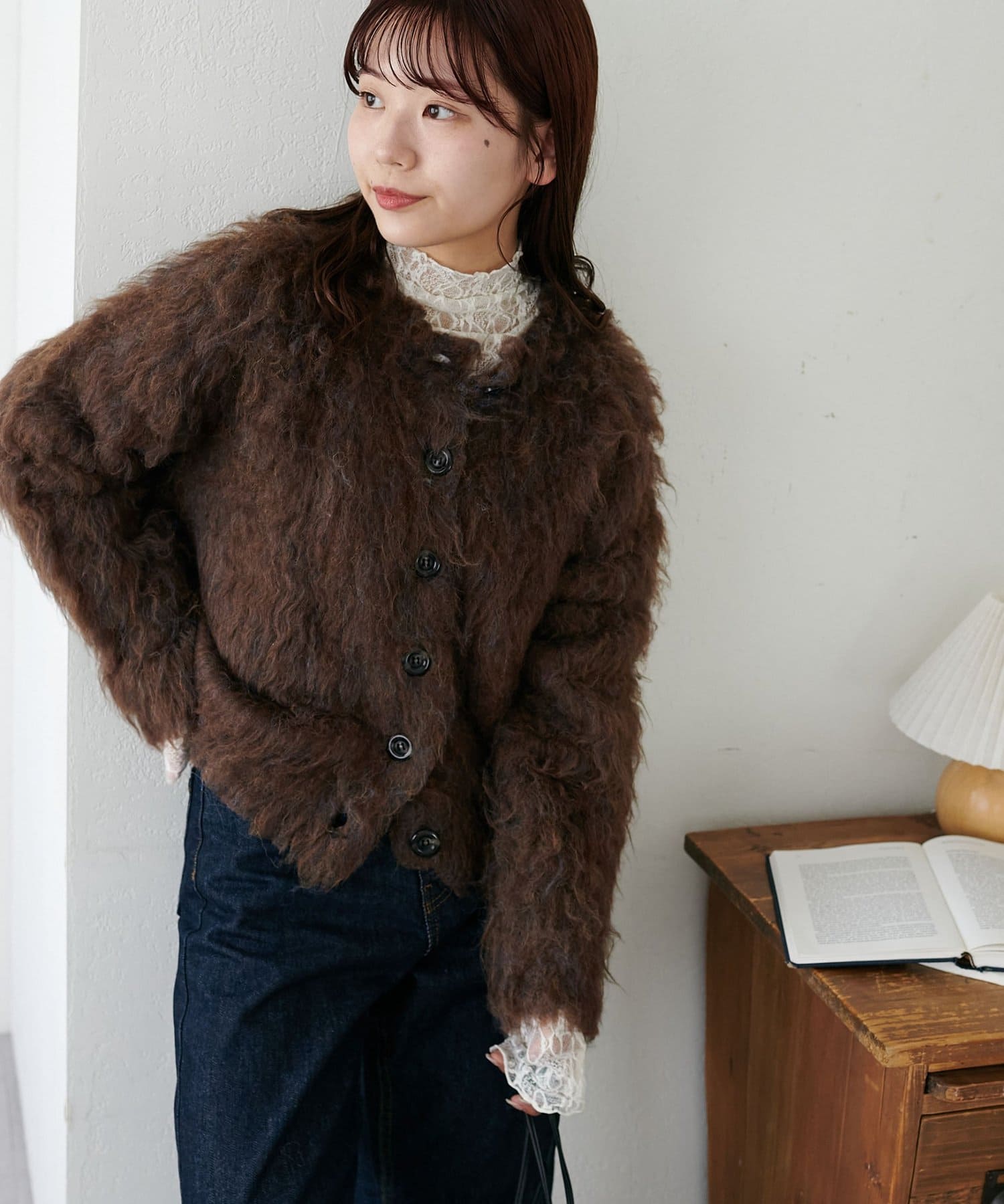 シンプルなニットなどに重ねて着ると、可愛く着こなせます。