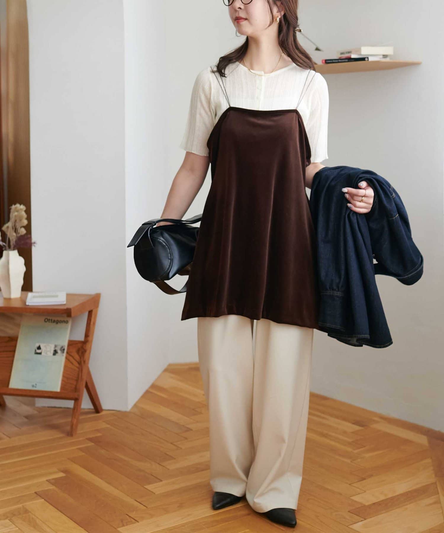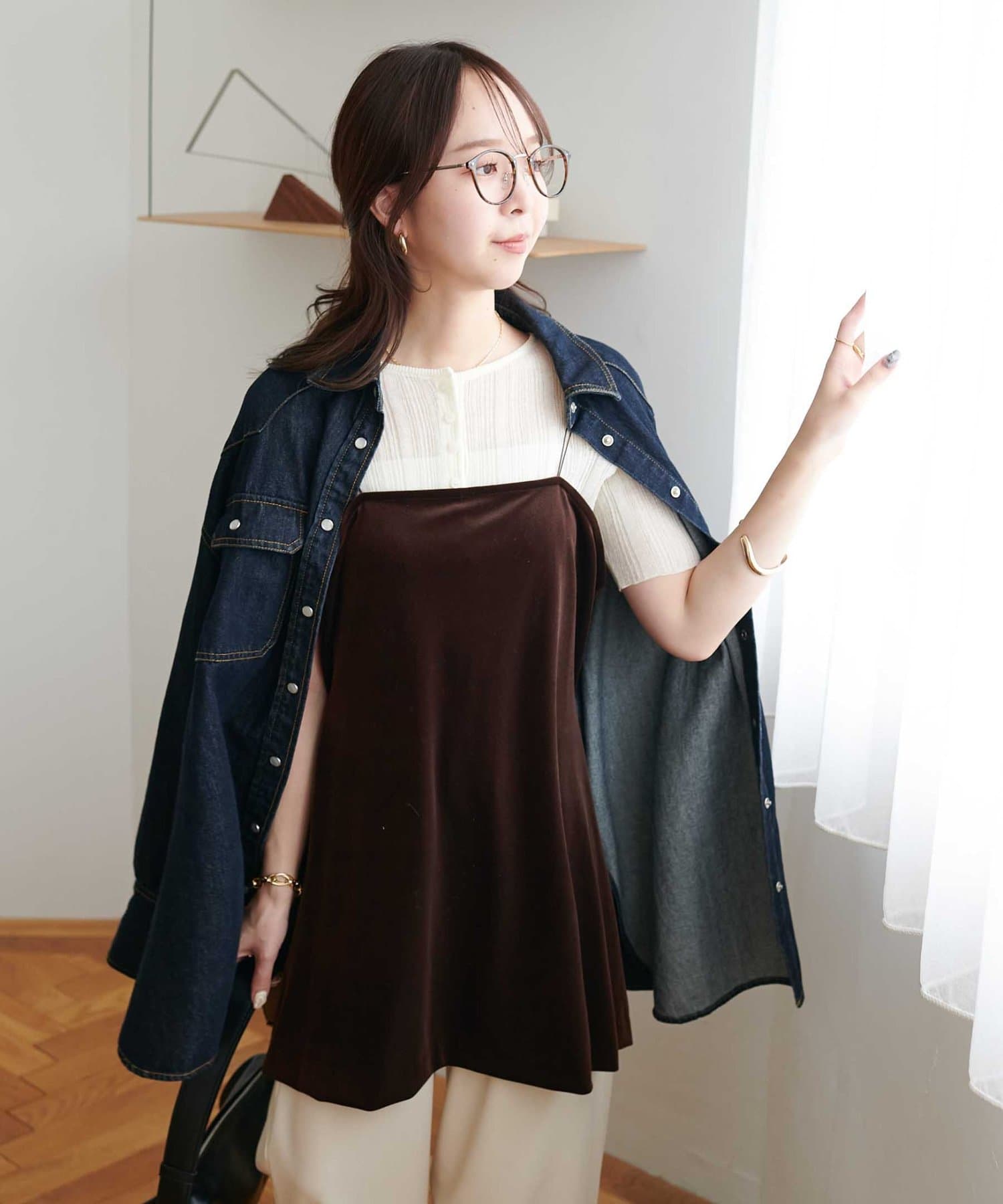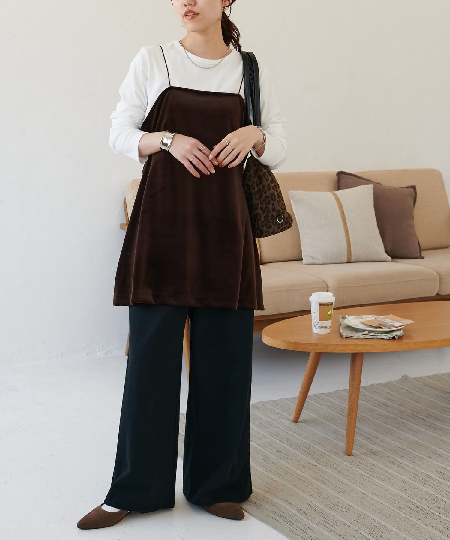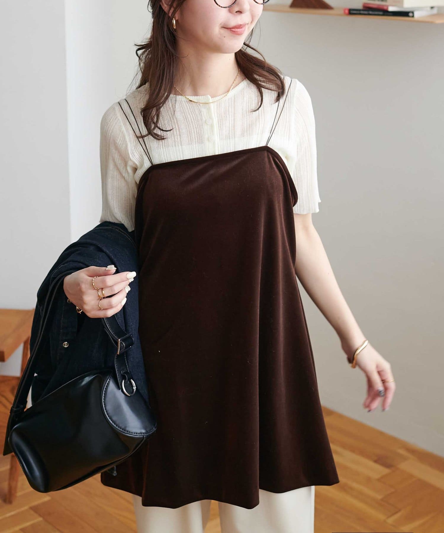 シンプルながらもほどよい光沢感のあるベロア素材が上品な印象をプラスしてくれるキャミチュニック!