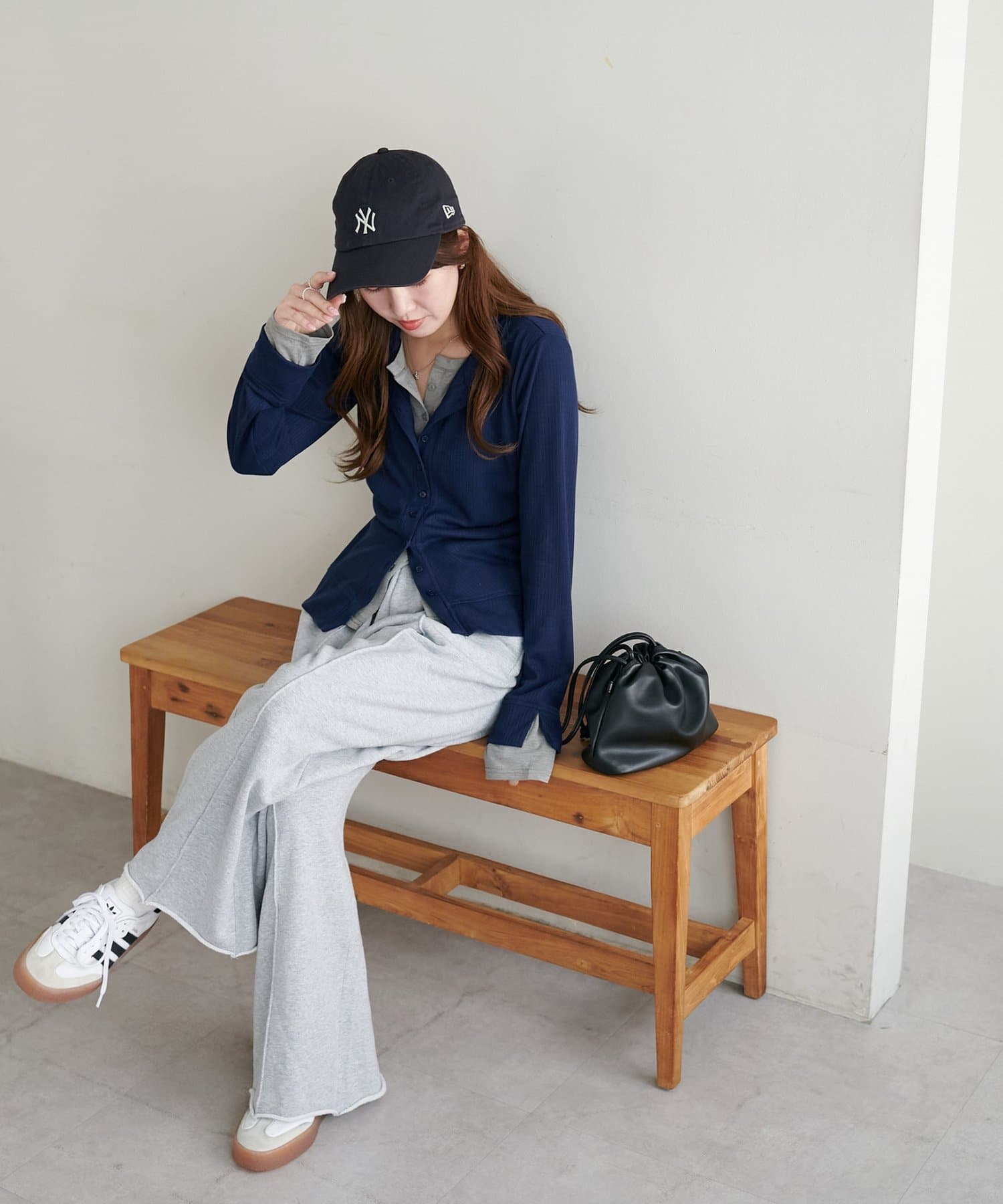 シンプルなボトムに合わせるだけで、トレンドライクなスタイリングが完成します。