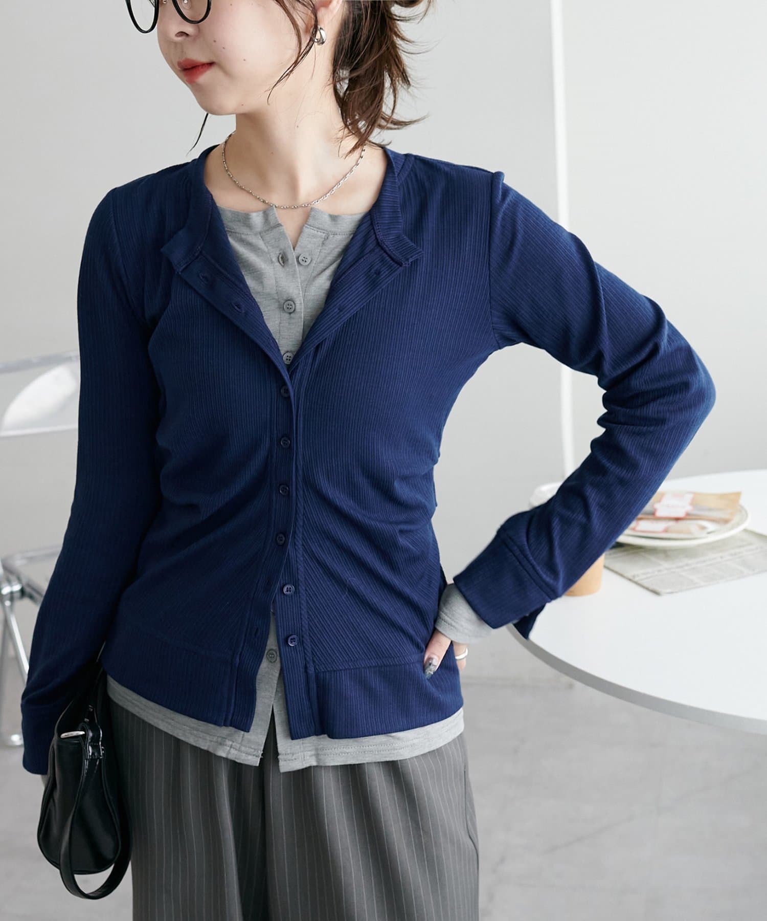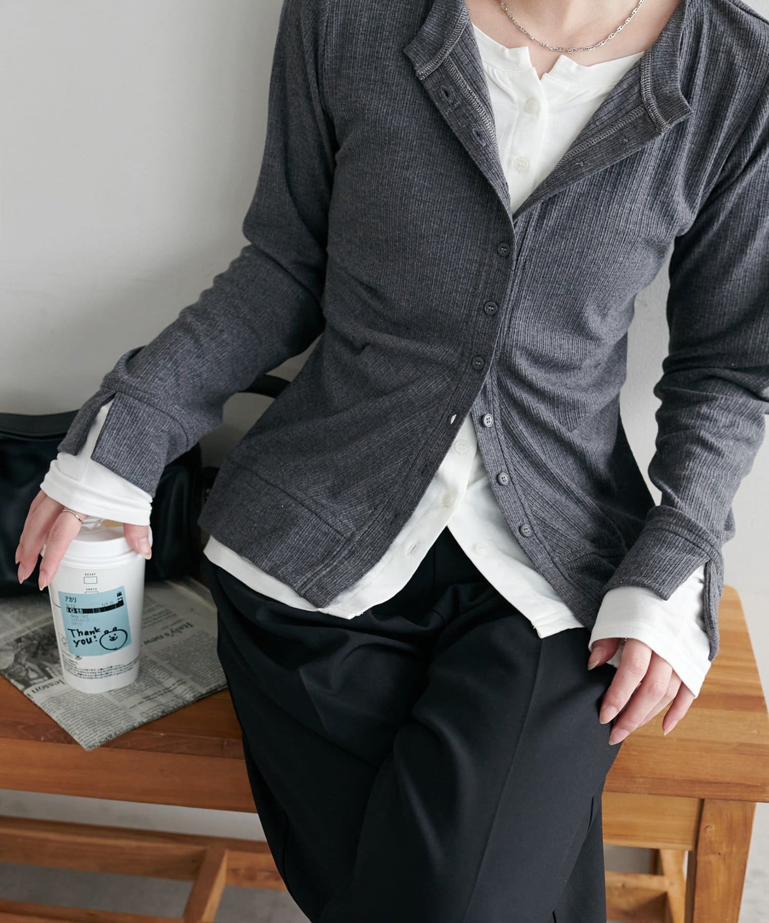 前立てや裾からのぞくインナー風ディテールがスタイリングに奥行きを与え、抜け感のある大人カジュアルを演出します。