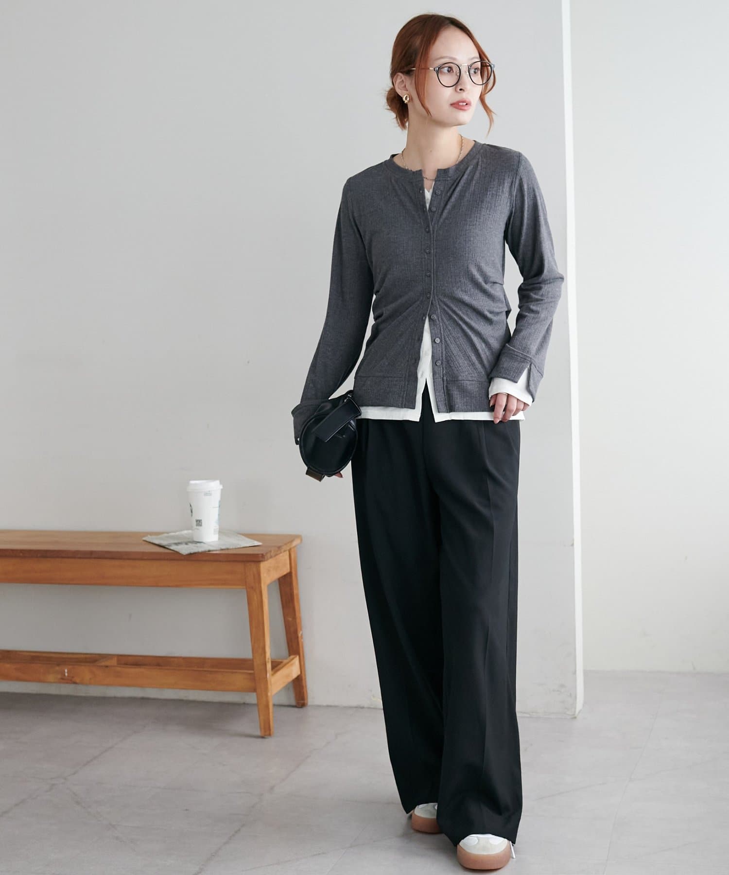 153cmスタッフ:レイヤード風になっているトップスもボタンの開け具合を調節することで、抜け感をプラスできます!