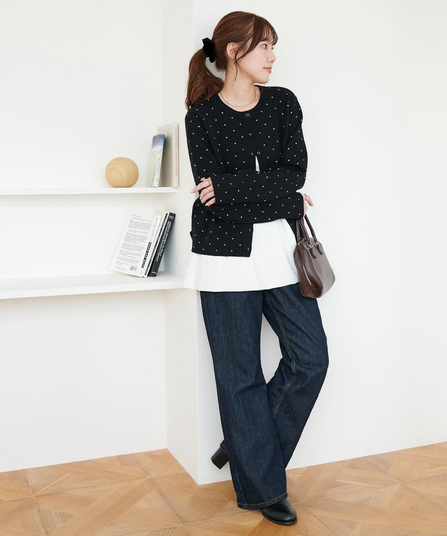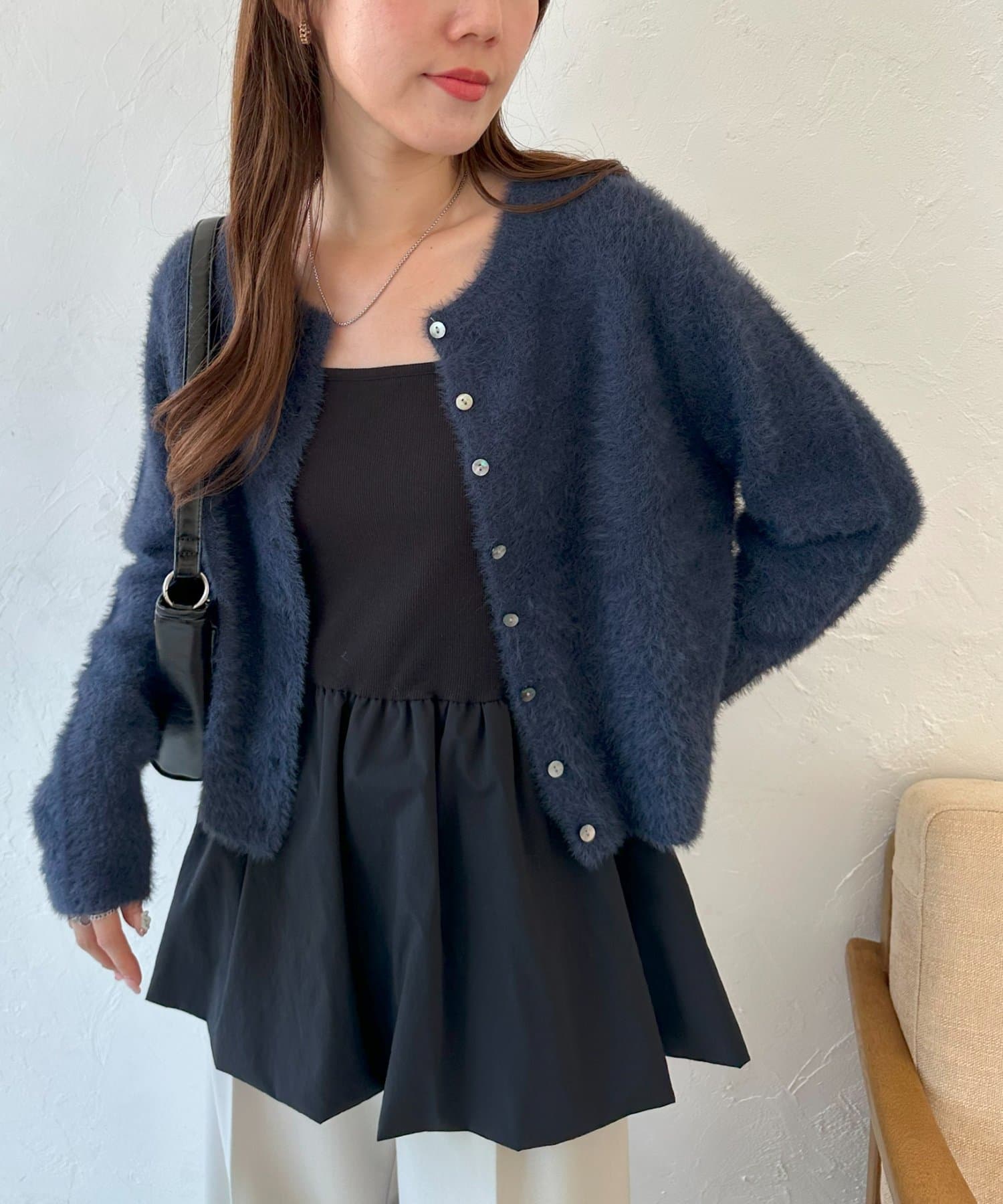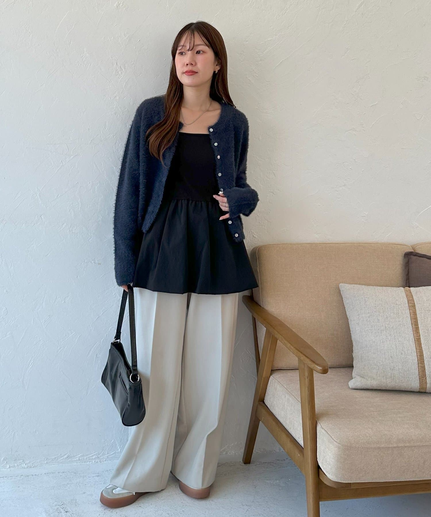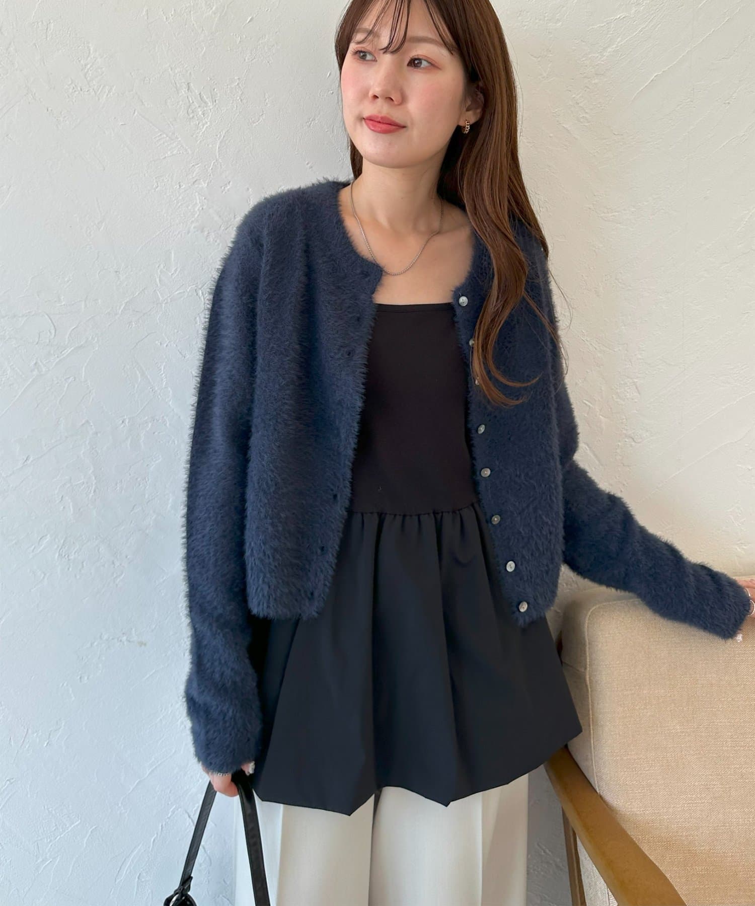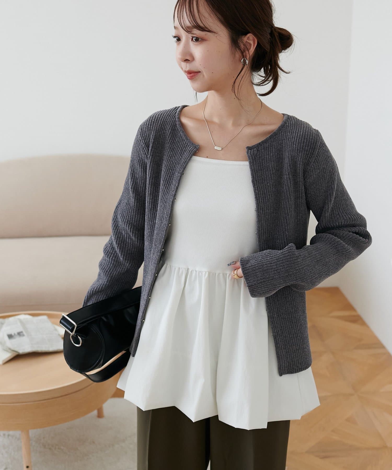 甘さのあるシルエットながらも無地デザインで、大人っぽさと可愛らしさを両立した1枚です。