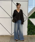 155cmスタッフ:深めに開いたVネックのデザインが顔まわりをすっきり見せ、抜け感のあるスタイルに。絶妙な丈感でイン・アウトどちらも綺麗に着こなせます◎