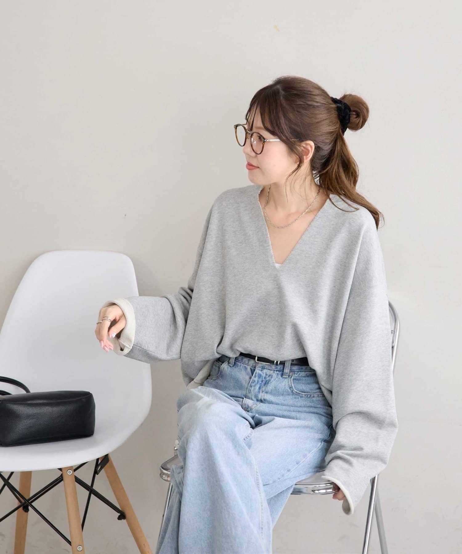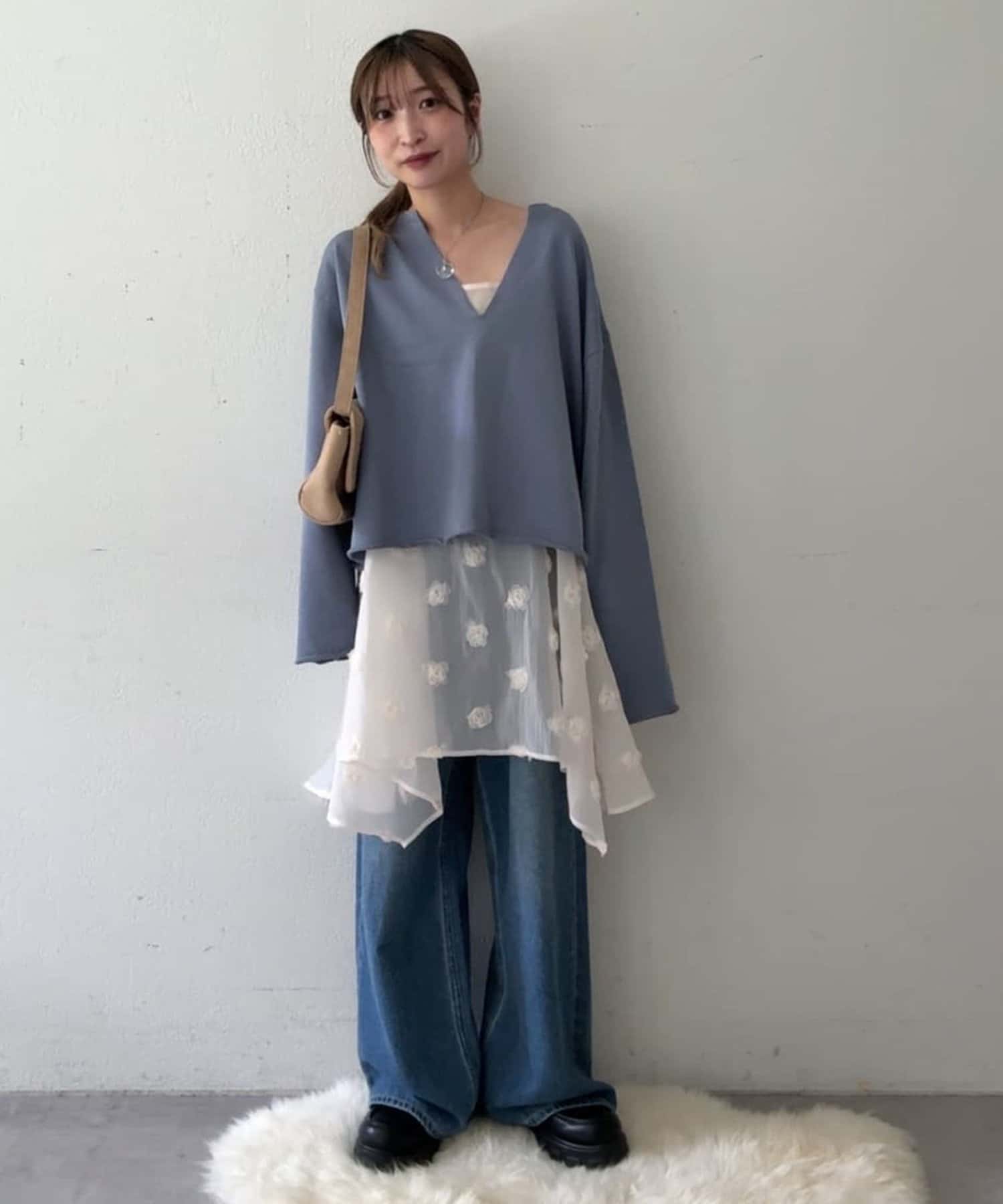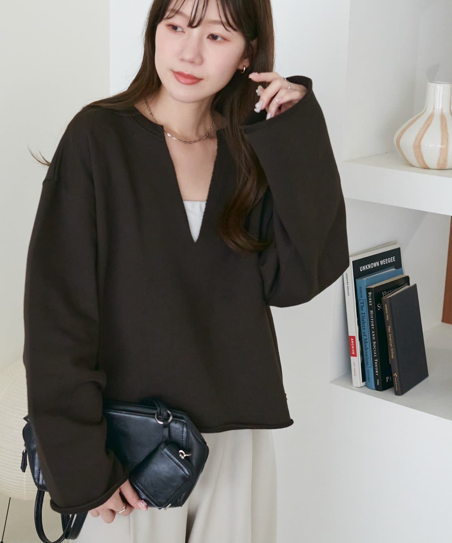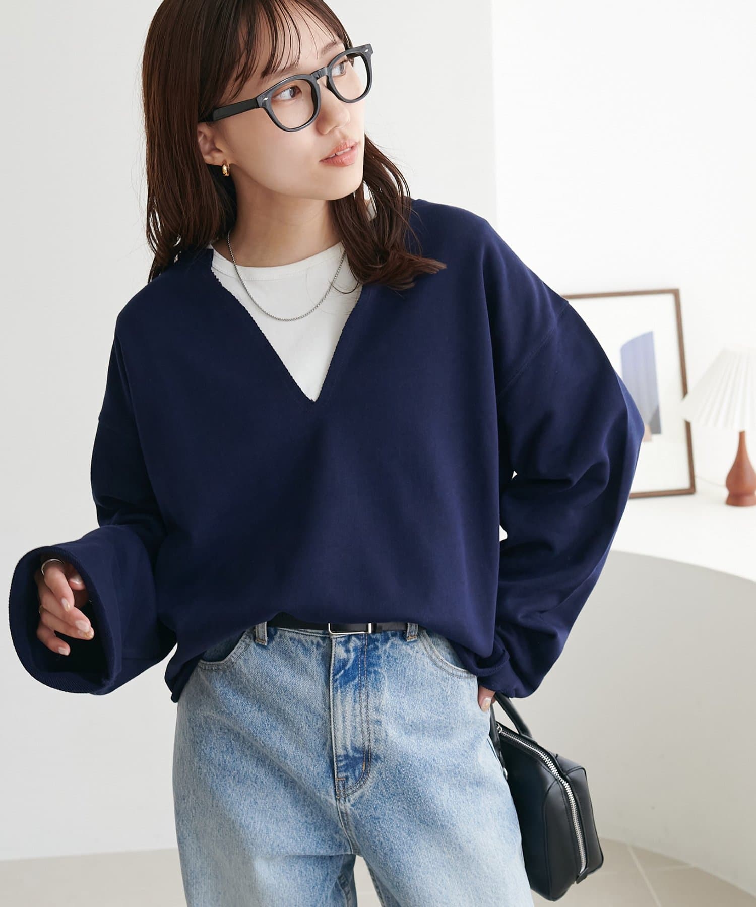 Vネックデザインなので、顔回りがスッキリとした印象になり、アクセサリー合わせも映えます〇
