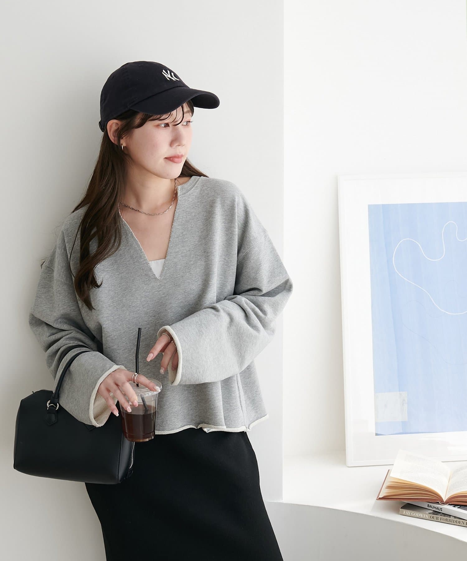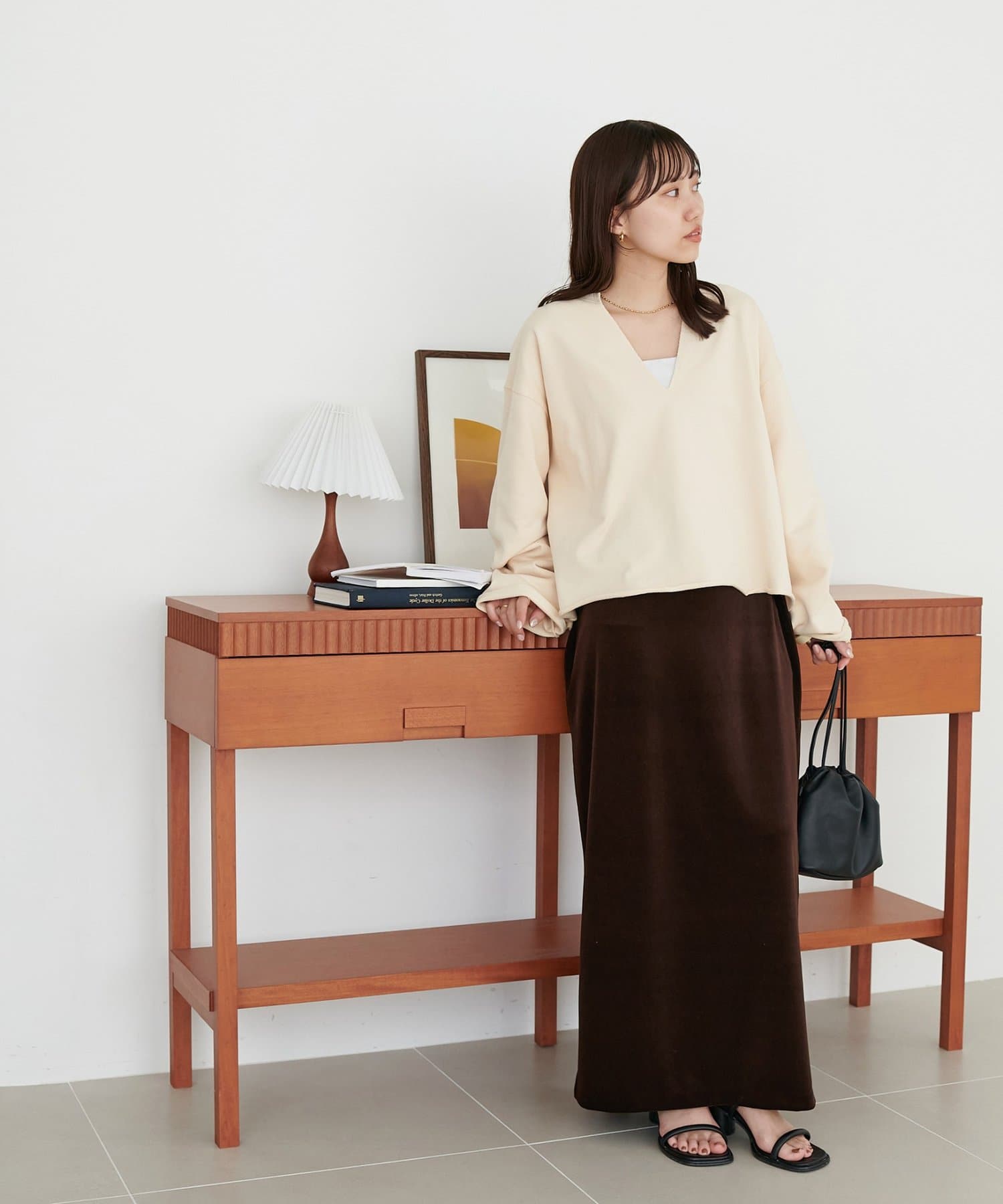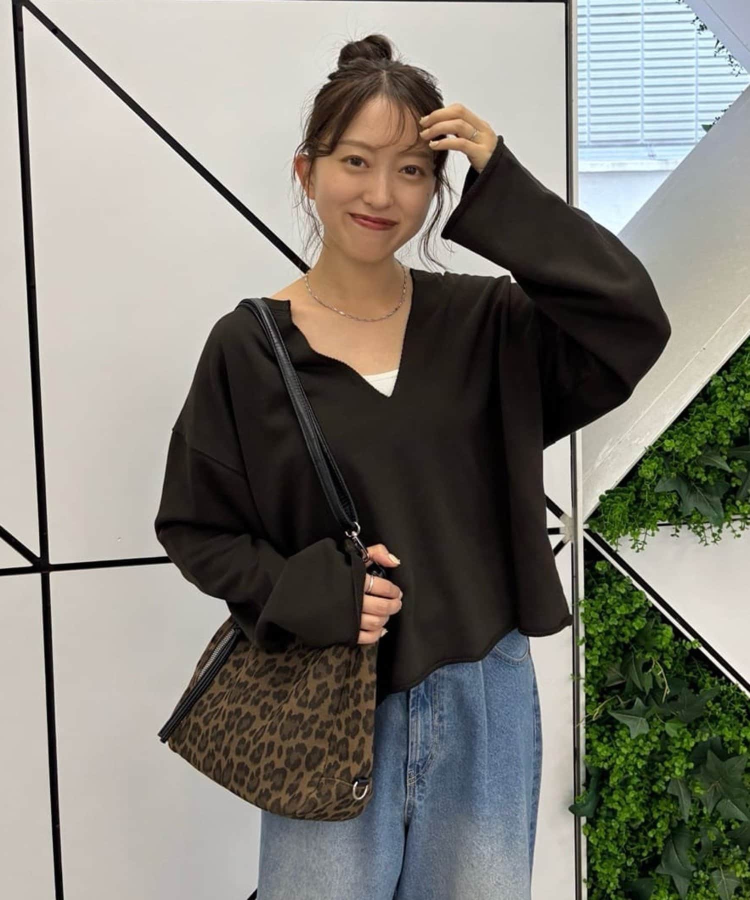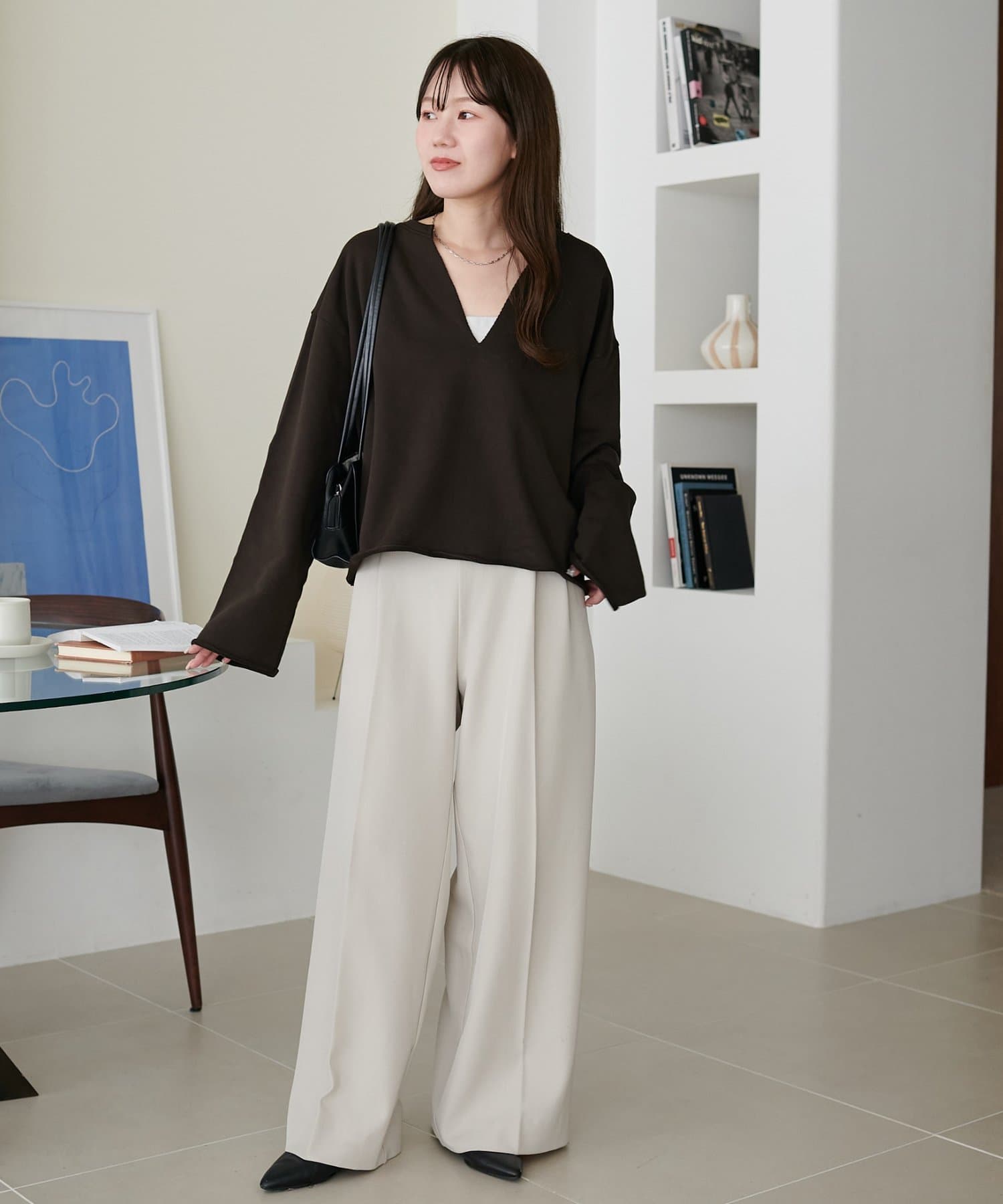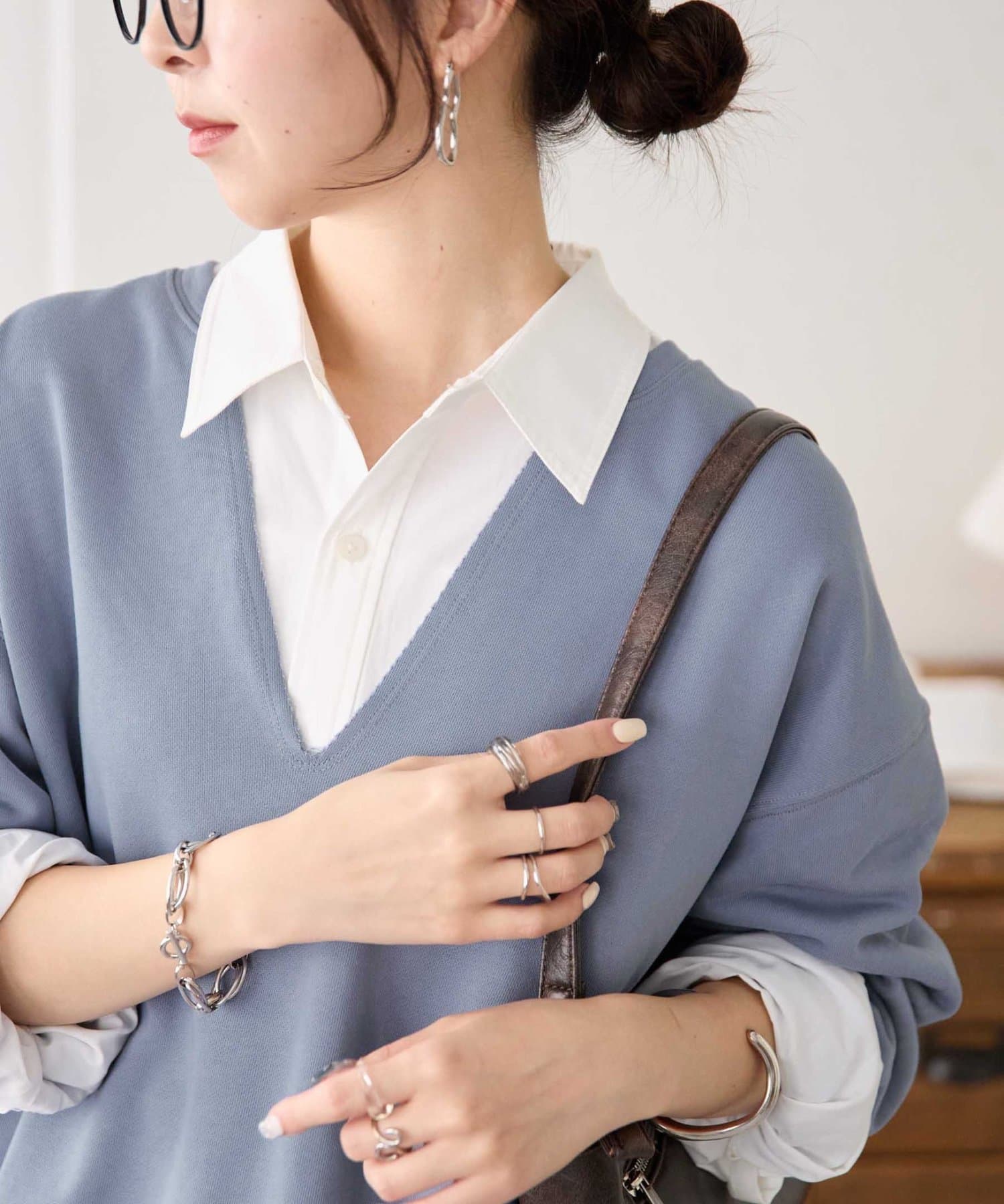Vネックデザインなので、顔回りがスッキリとした印象になり、アクセサリー合わせも映えます〇