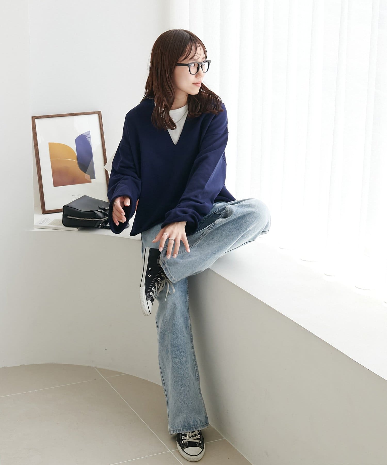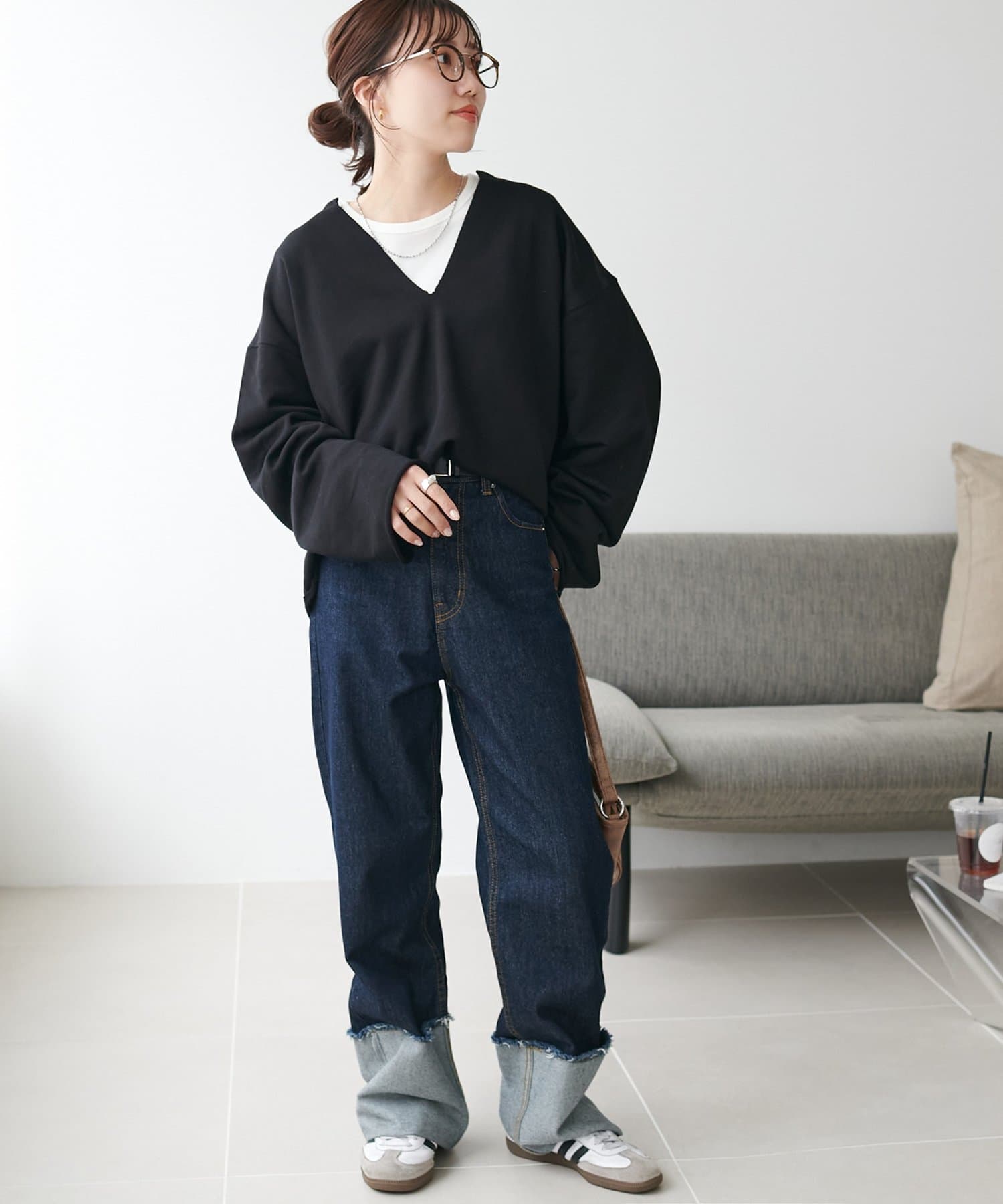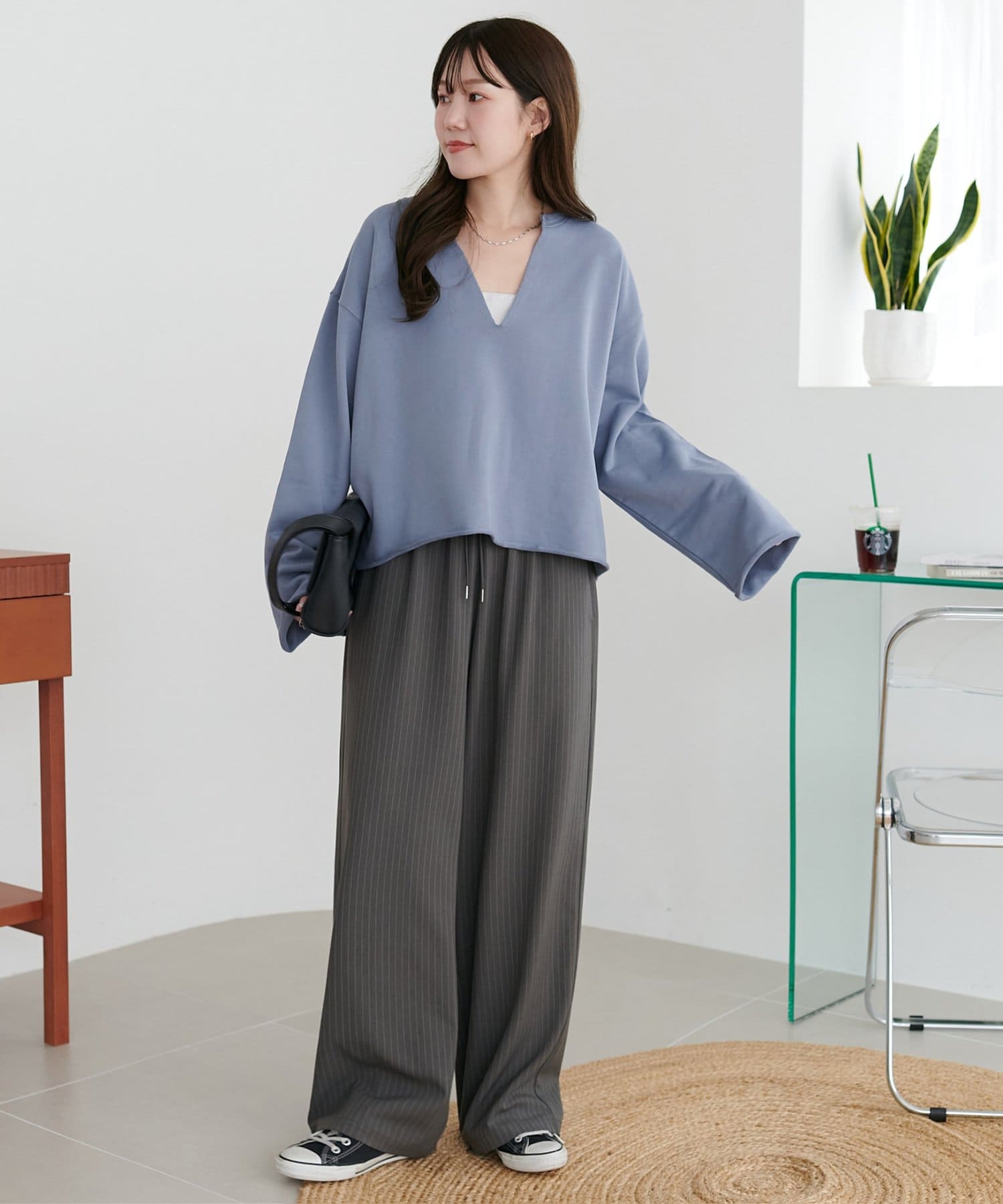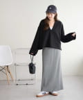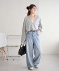 155cmスタッフ:深めに開いたVネックのデザインが顔まわりをすっきり見せ、抜け感のあるスタイルに。絶妙な丈感でイン・アウトどちらも綺麗に着こなせます◎