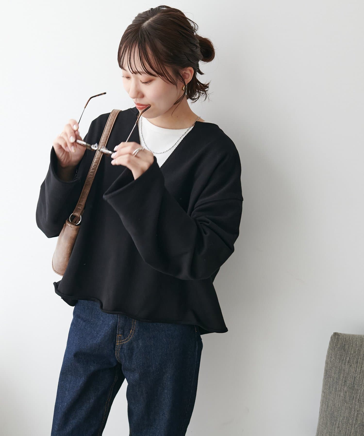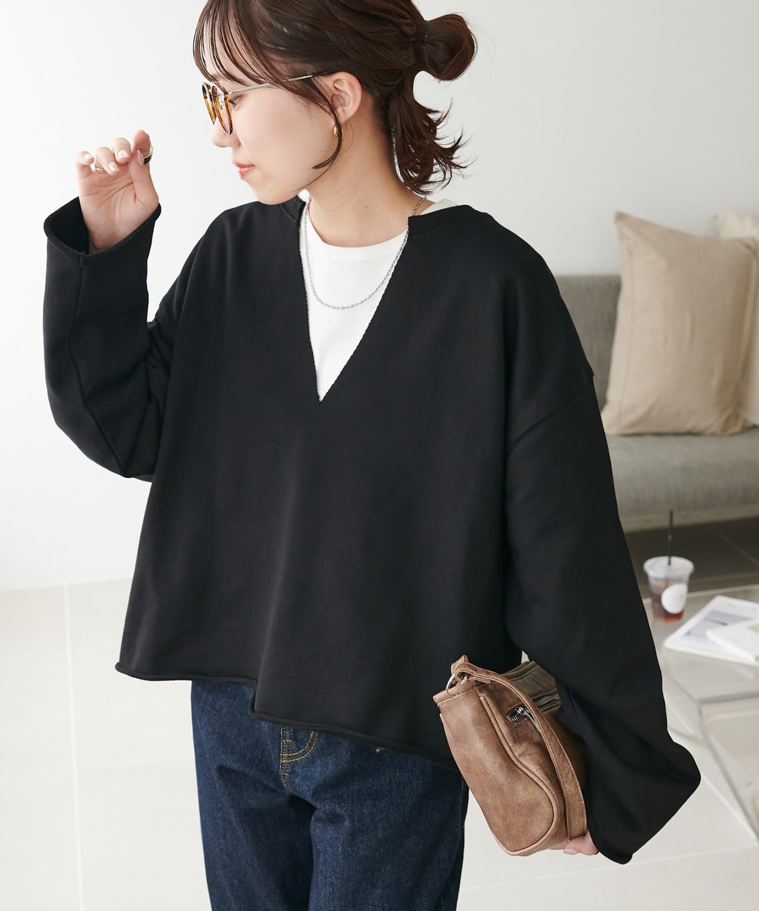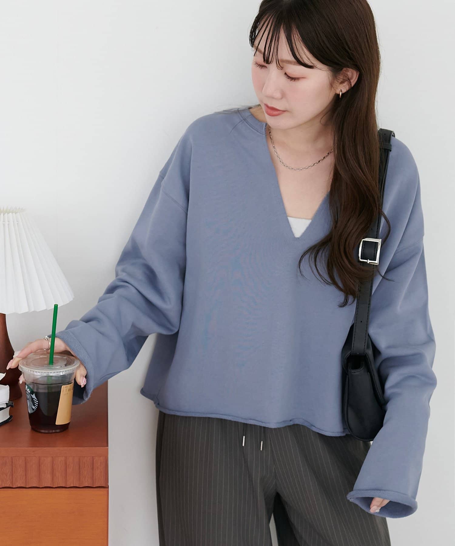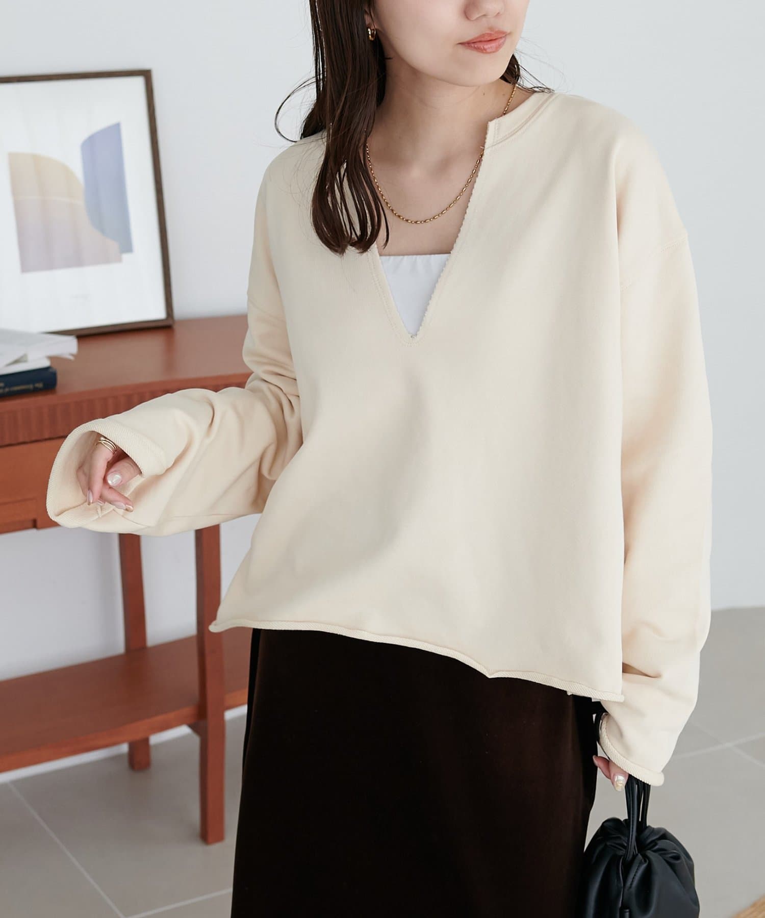160cmスタッフ:Vネックが深めなので、Tシャツやシャツ、タートルトップスなどを中に着て、レイヤードスタイルも楽しめます♪