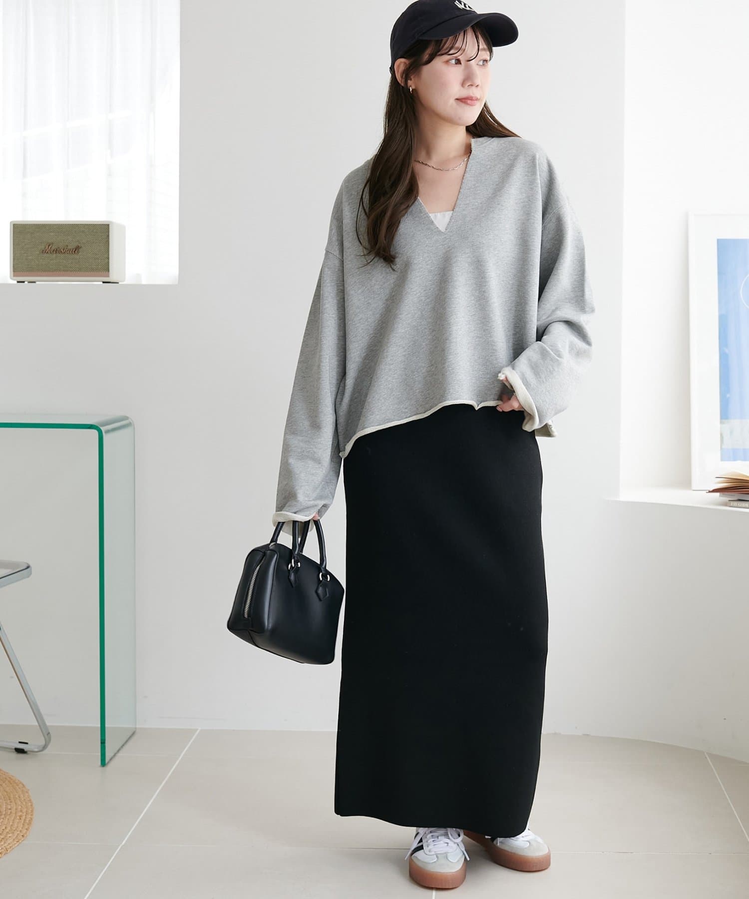 キャップやアクセサリーなど小物使いで表情が変わる、着回し力の高い1着です。
