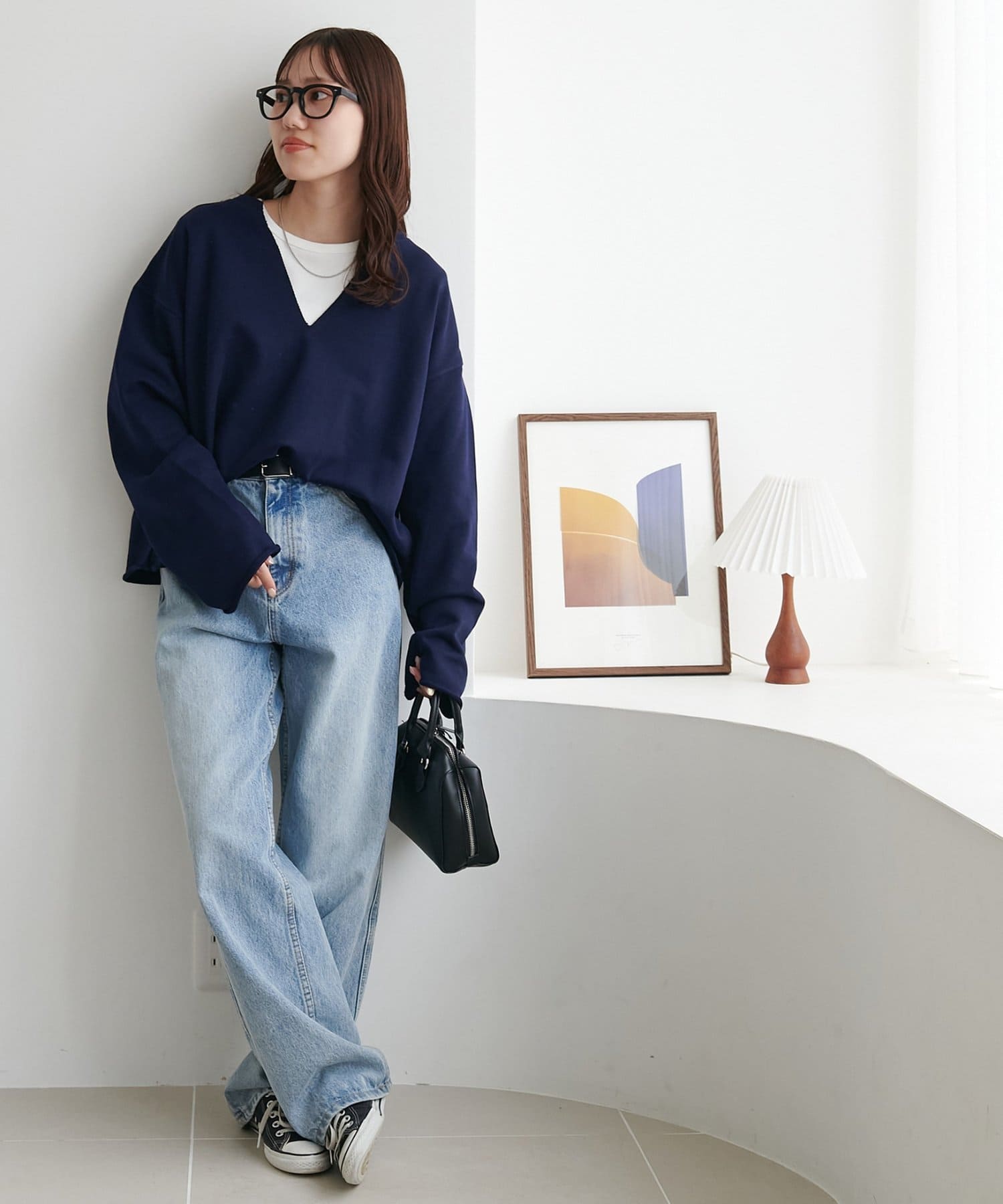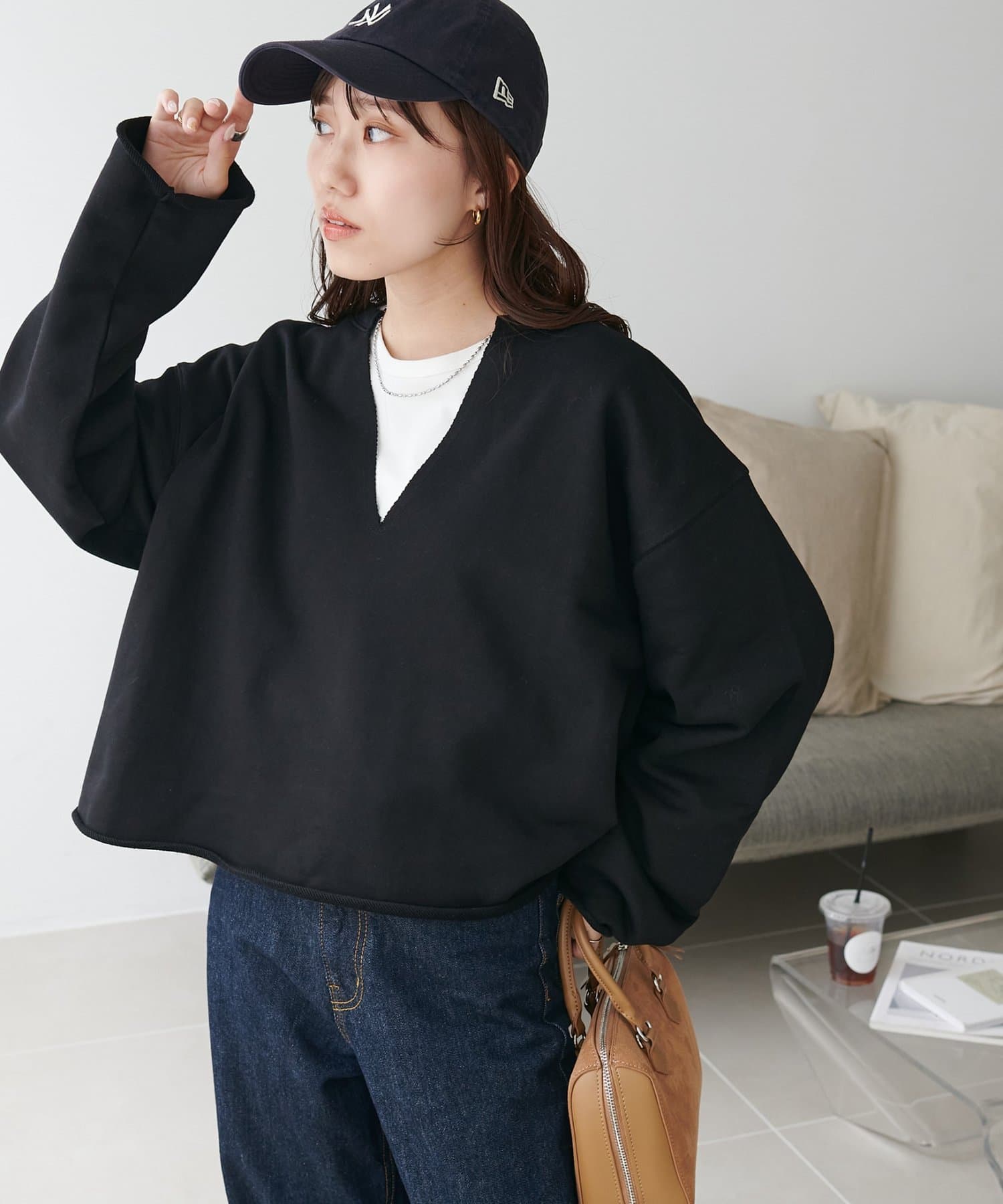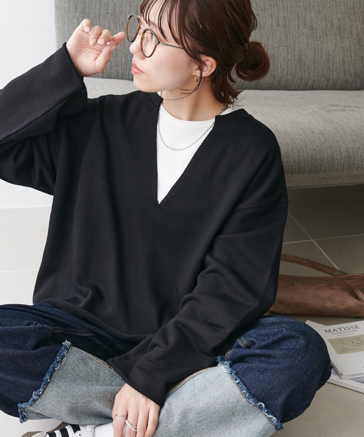 シンプルながらも、深めに開いたVネックで抜け感を演出。