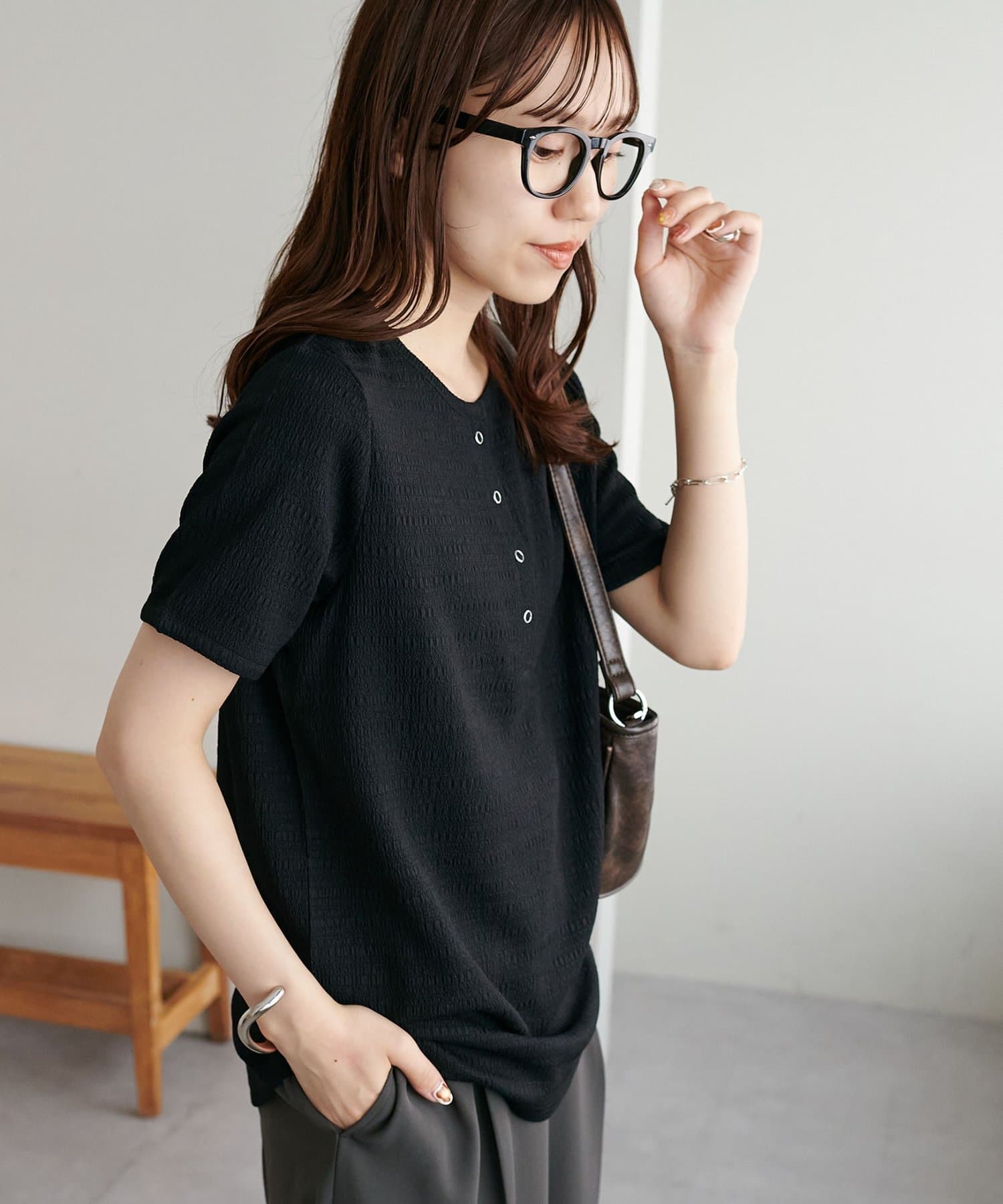 158㎝スタッフ:肌離れのいいサラッとした素材で、暑い時期も快適に着られます。お尻に少しかかる着丈で、気になる腰まわりも自然にカバー。