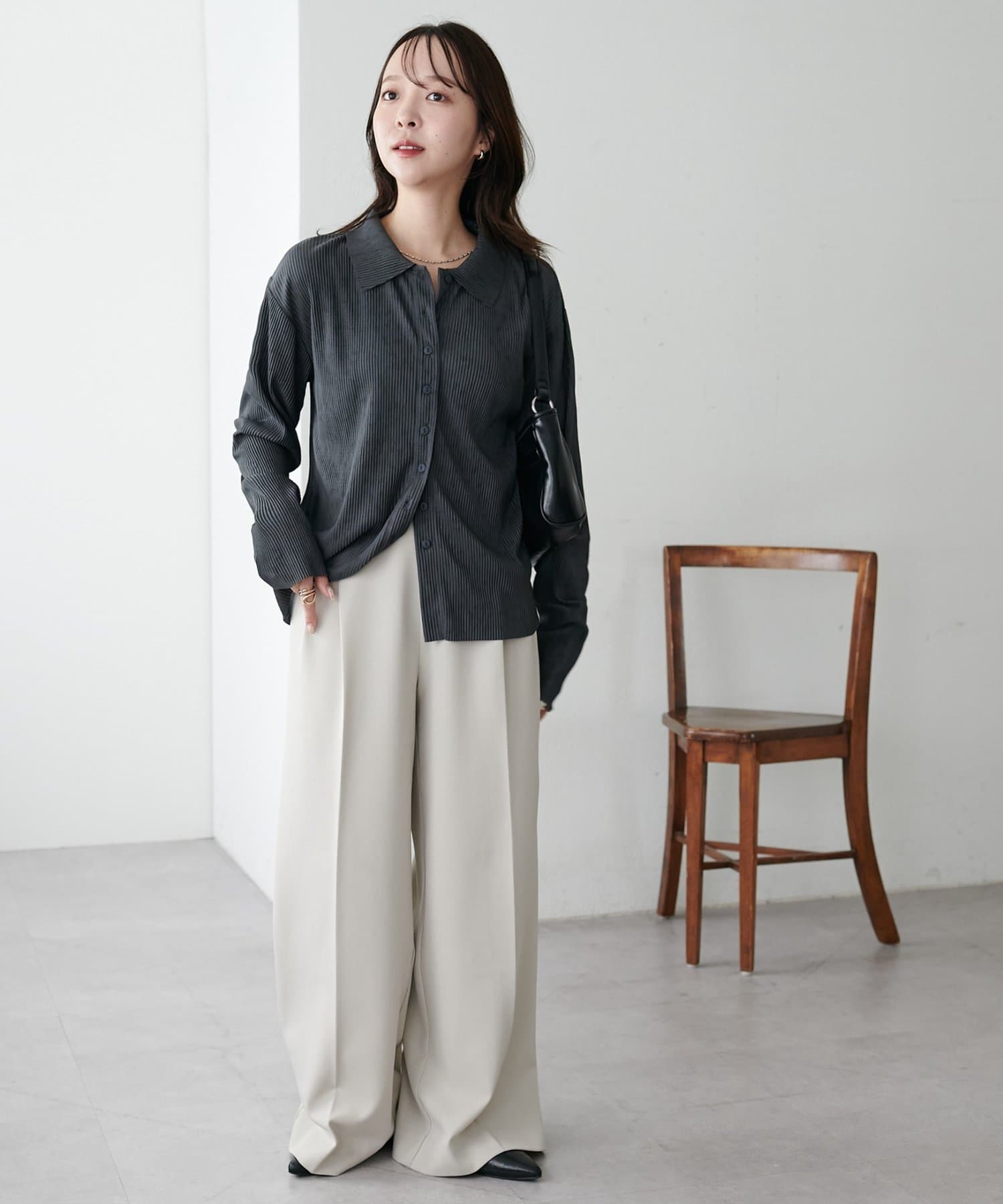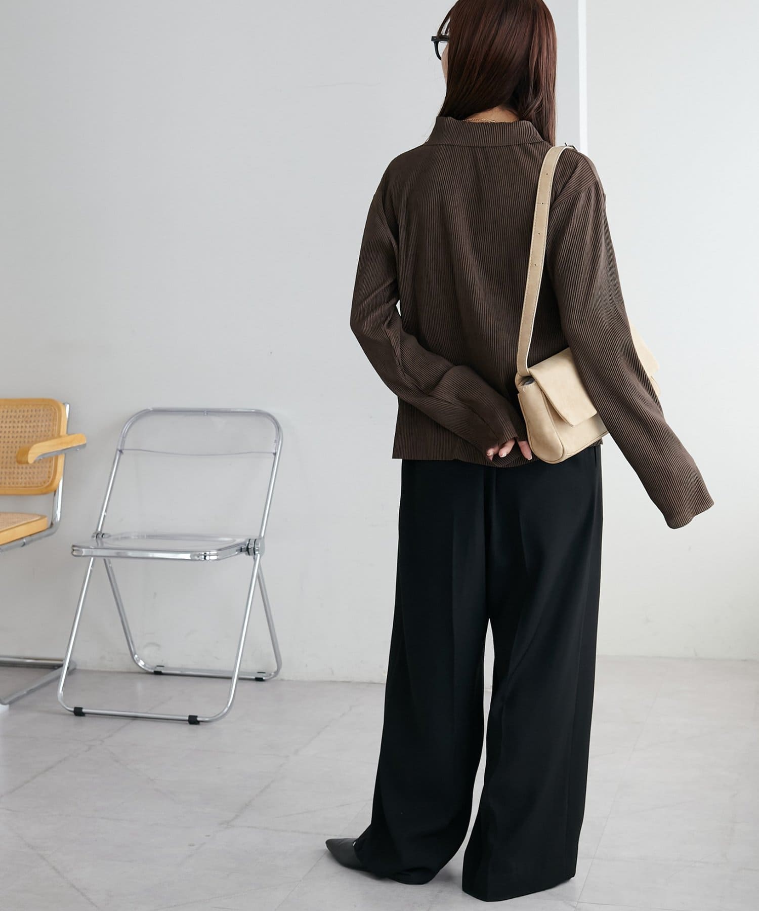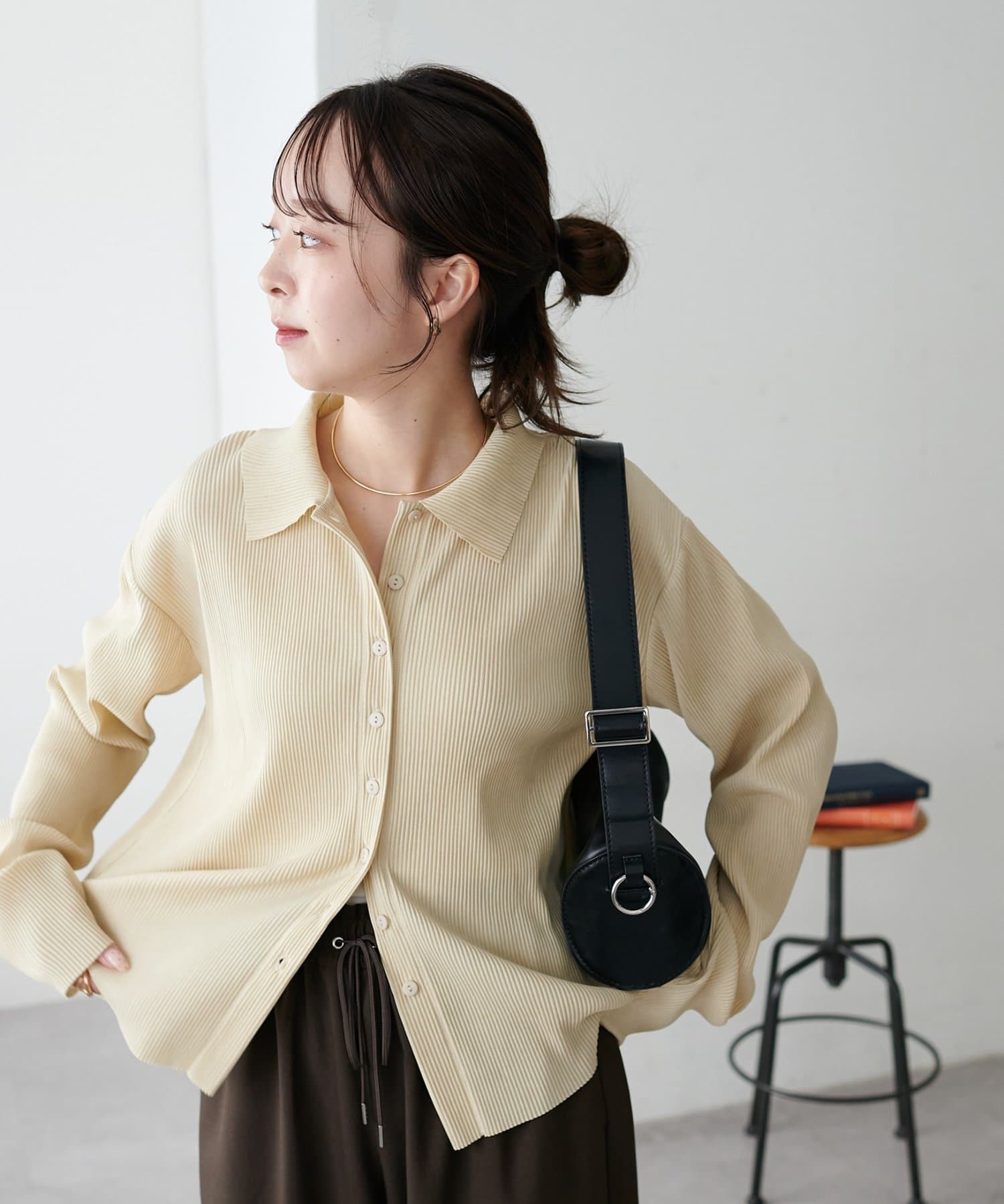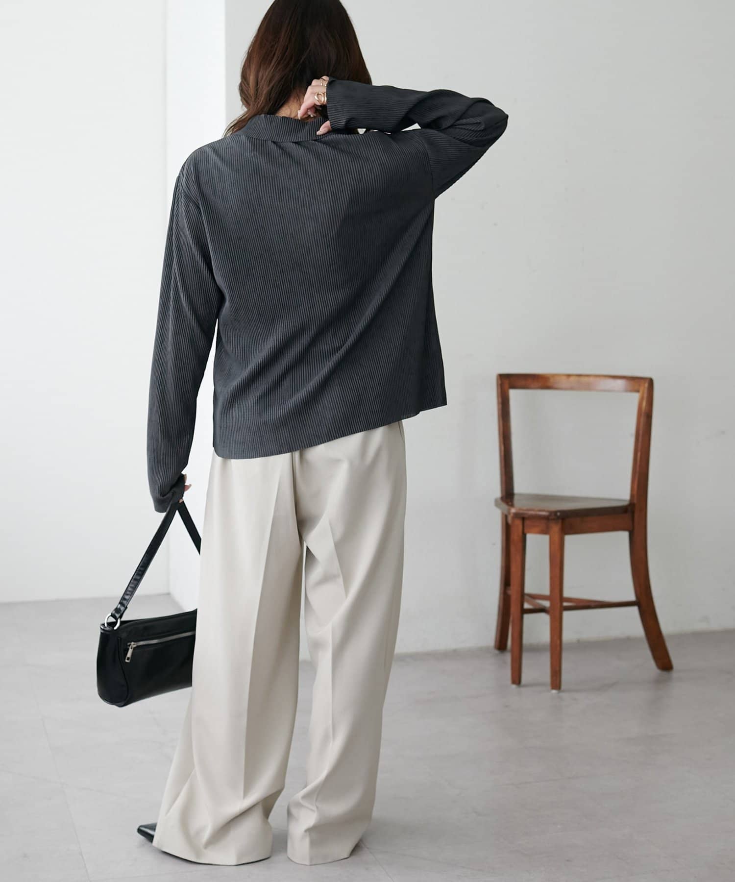 全体に細かいプリーツ加工を施すことで、立体感と表情を加え、シンプルながら奥行きのあるデザイン。