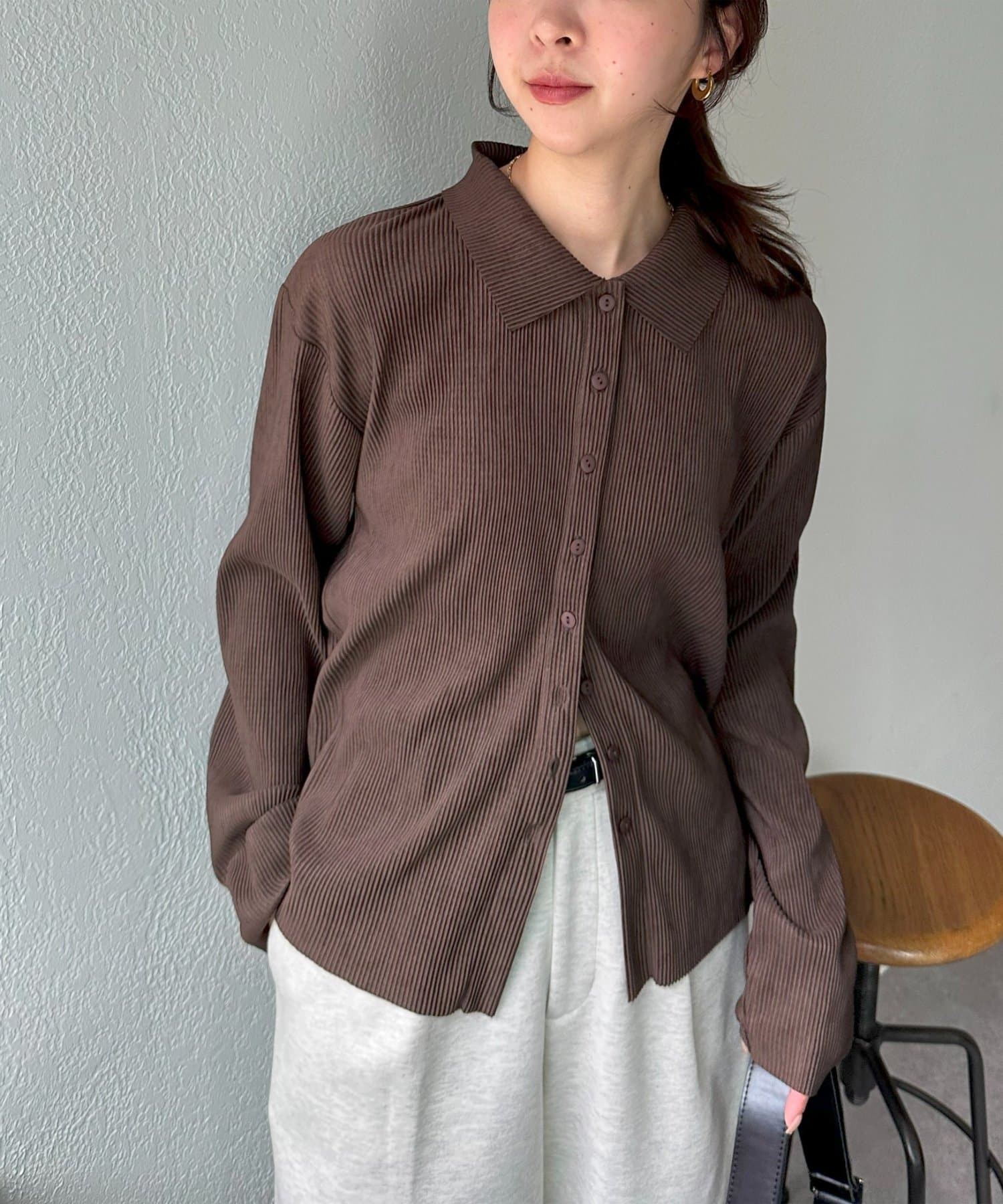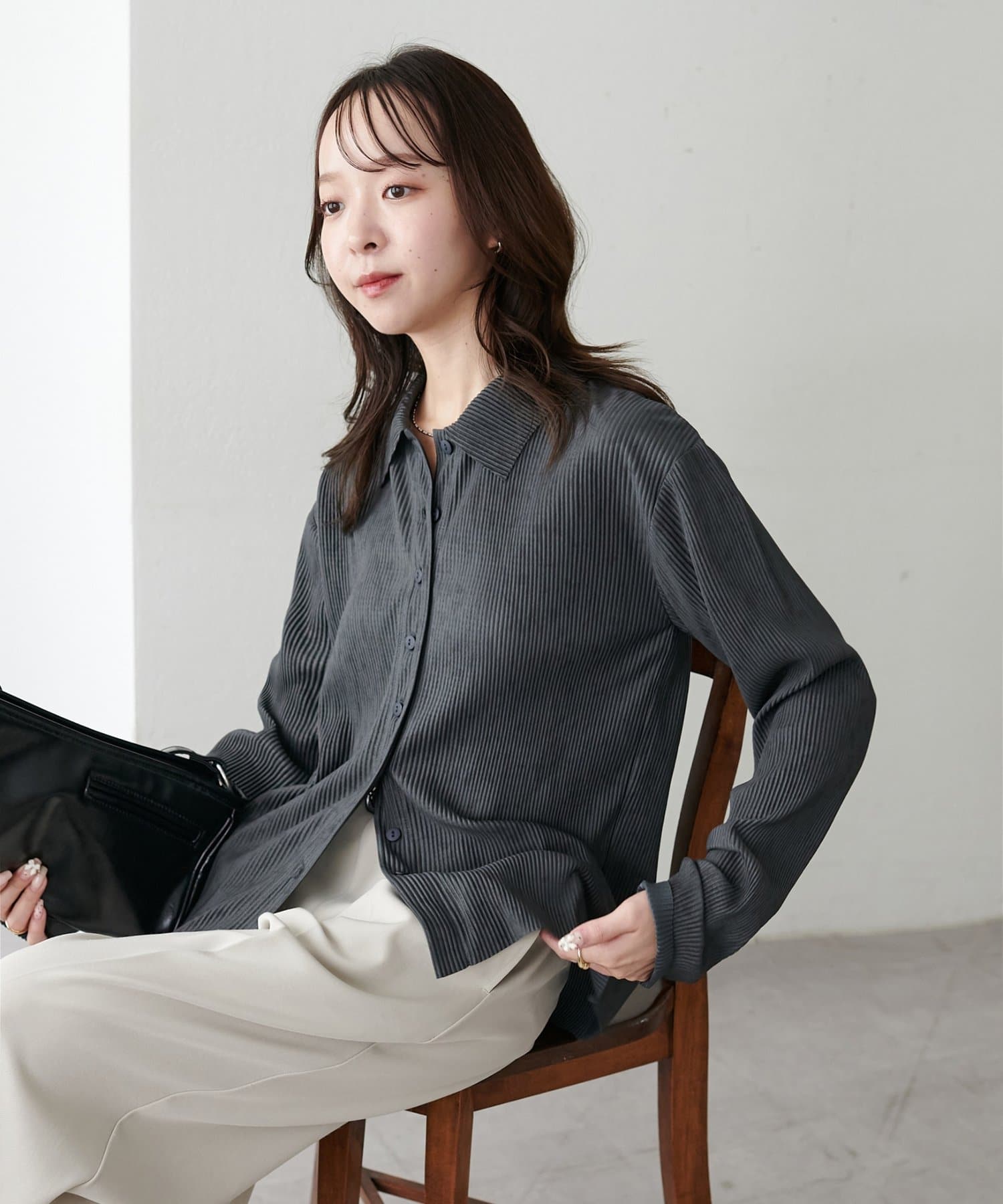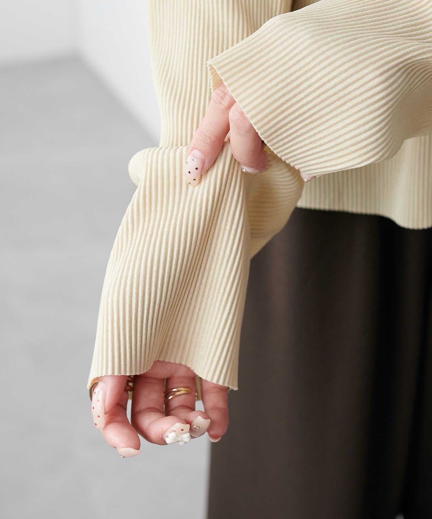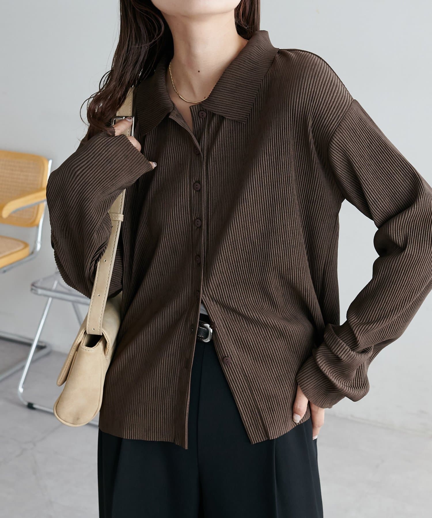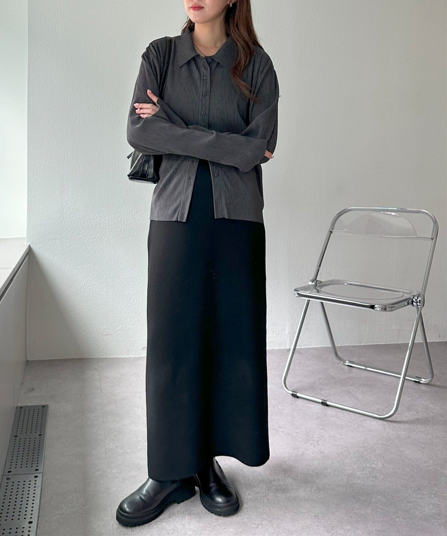 全体に細かいプリーツ加工を施すことで、立体感と表情を加え、シンプルながら奥行きのあるデザイン。