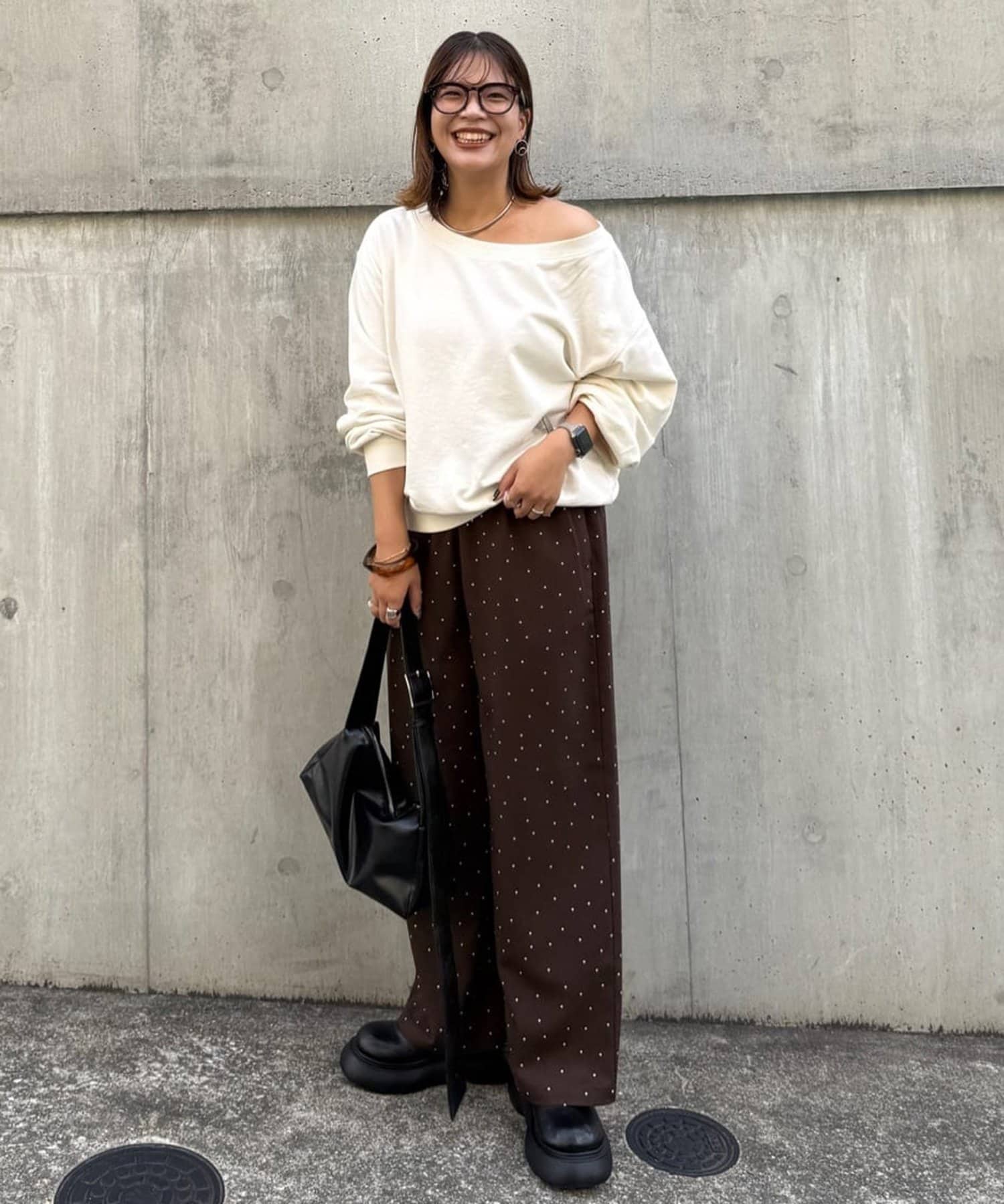 162cmスタッフ:カジュアルになりがちなスウェットも自然な肌見せが叶うので、ヘルシーに女性らしく着こなせます!