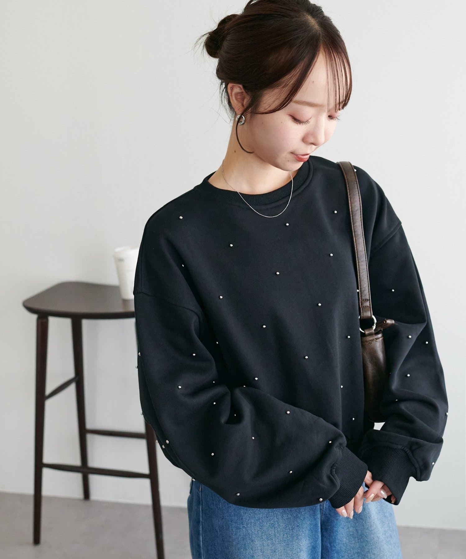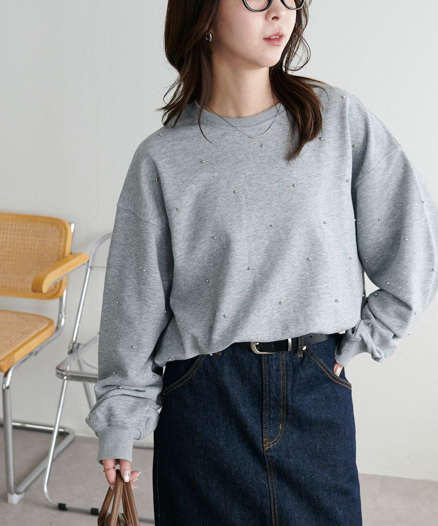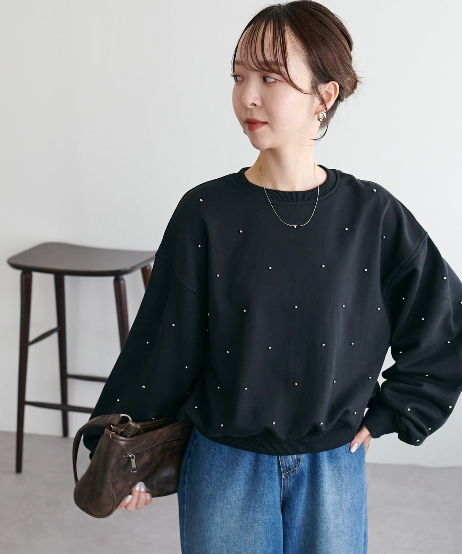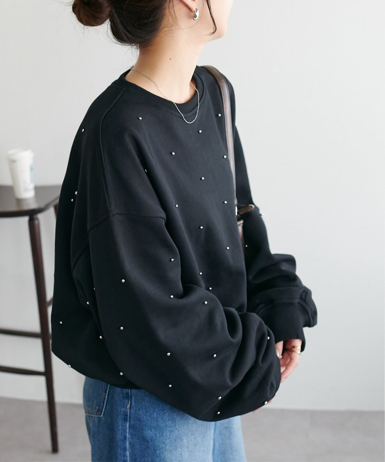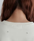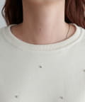 シンプルなスウェットに小さなスタッズを散りばめることで、カジュアルな印象のスウェットながら、さりげない輝きが大人の女性らしさを引き立てます。