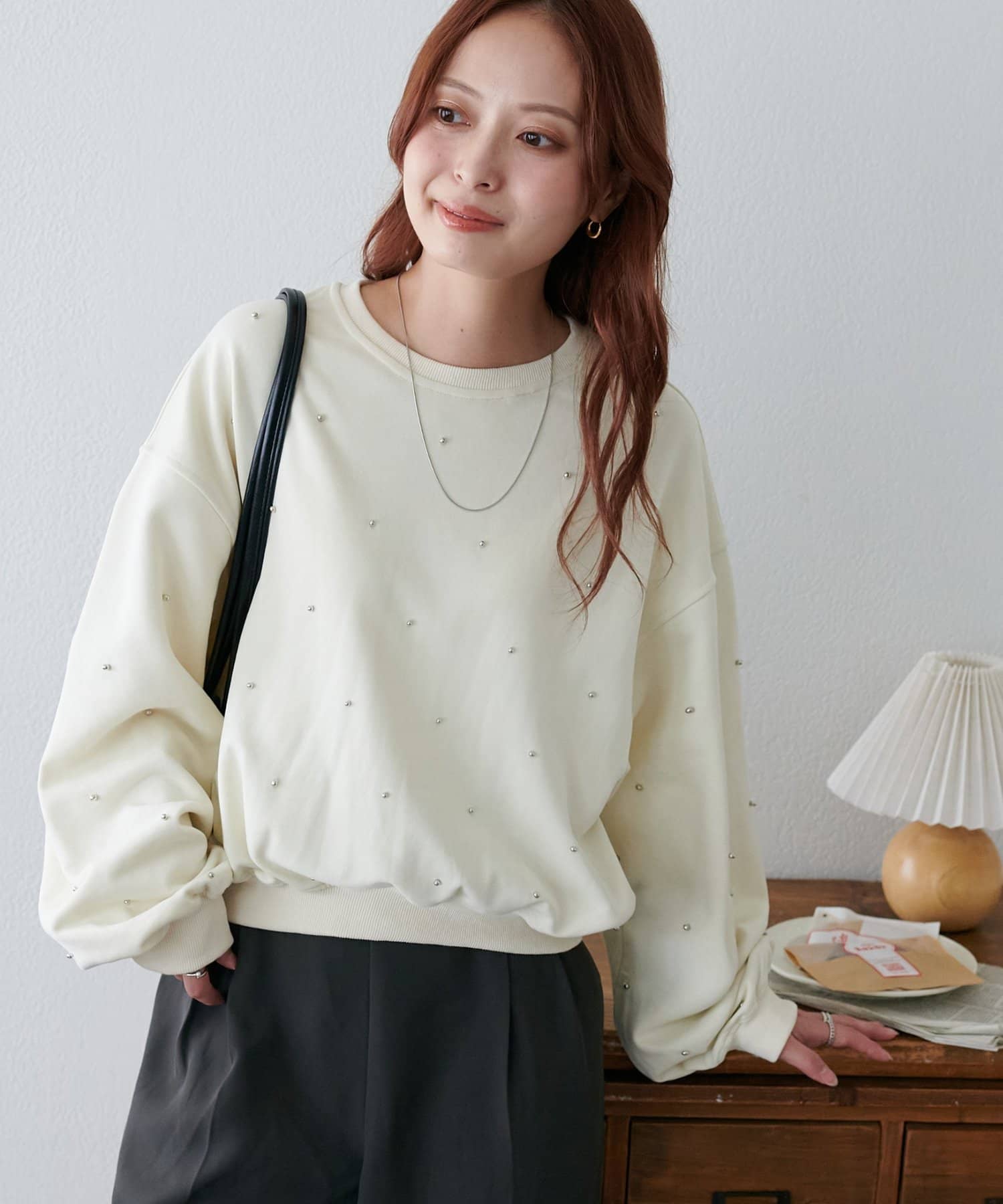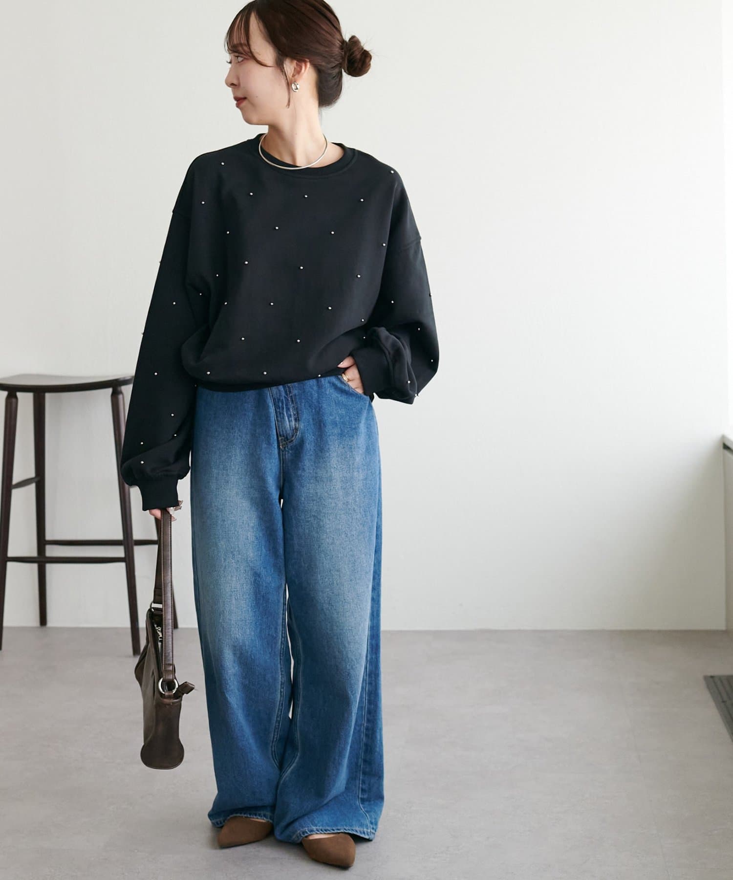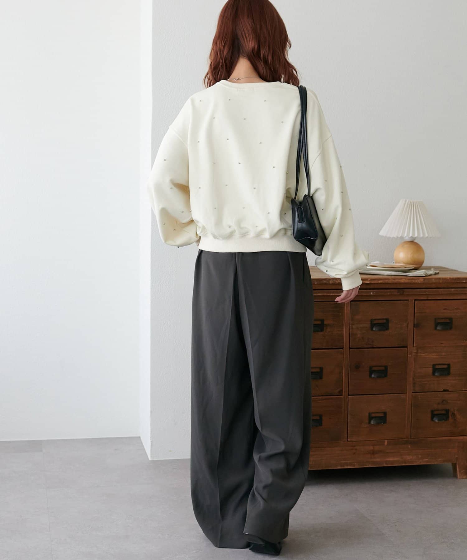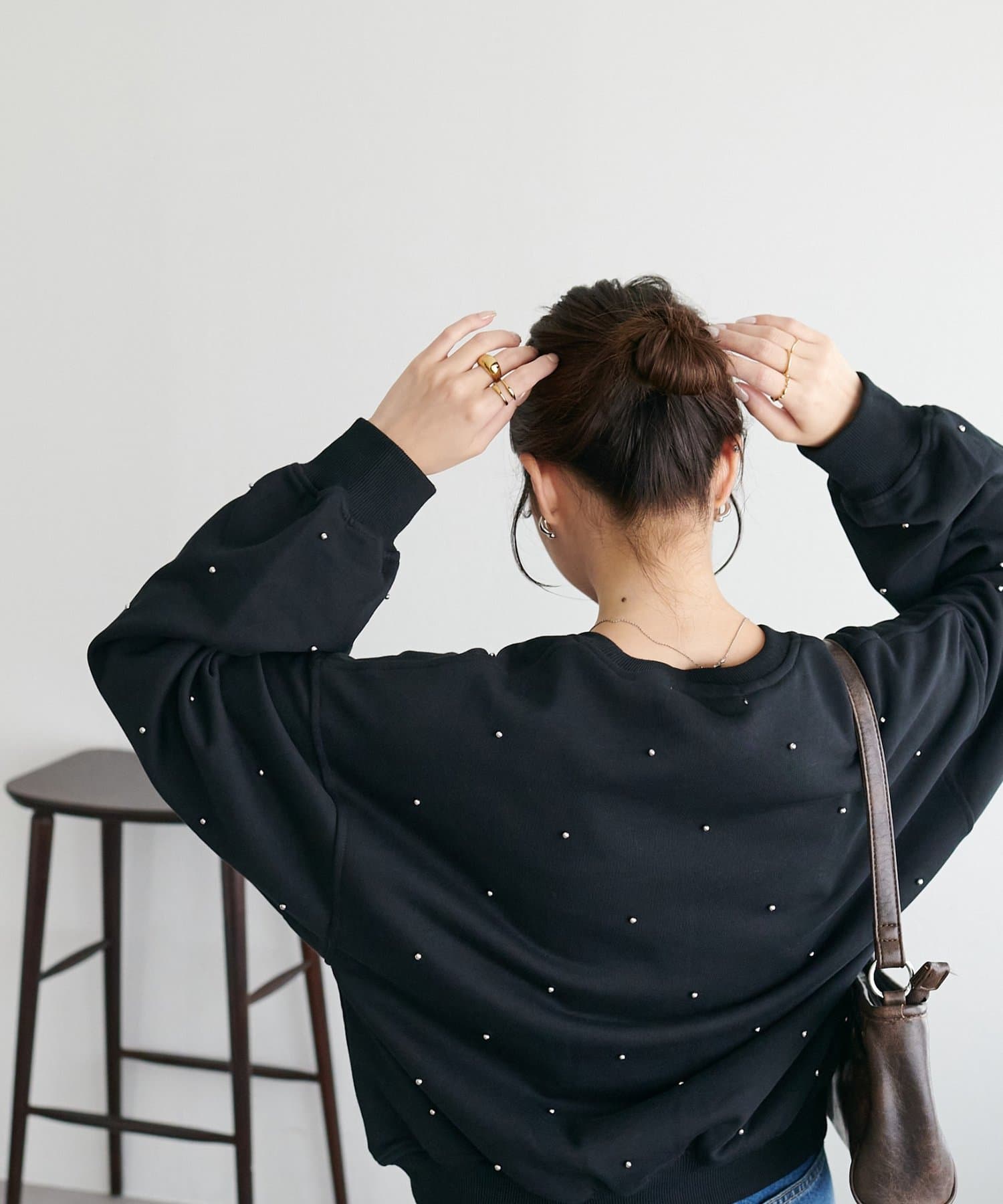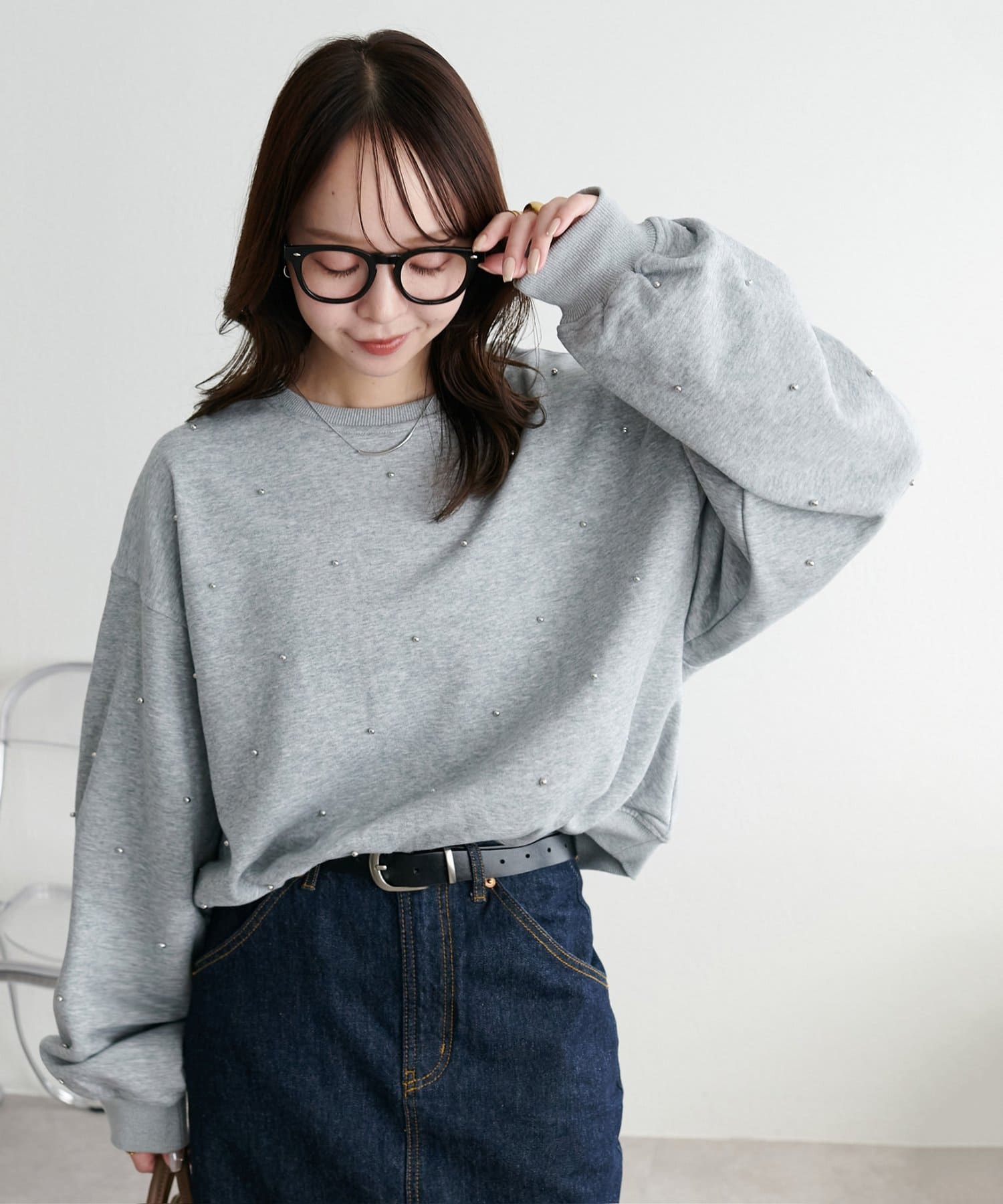 シンプルなスウェットに小さなスタッズを散りばめることで、カジュアルな印象のスウェットながら、さりげない輝きが大人の女性らしさを引き立てます。