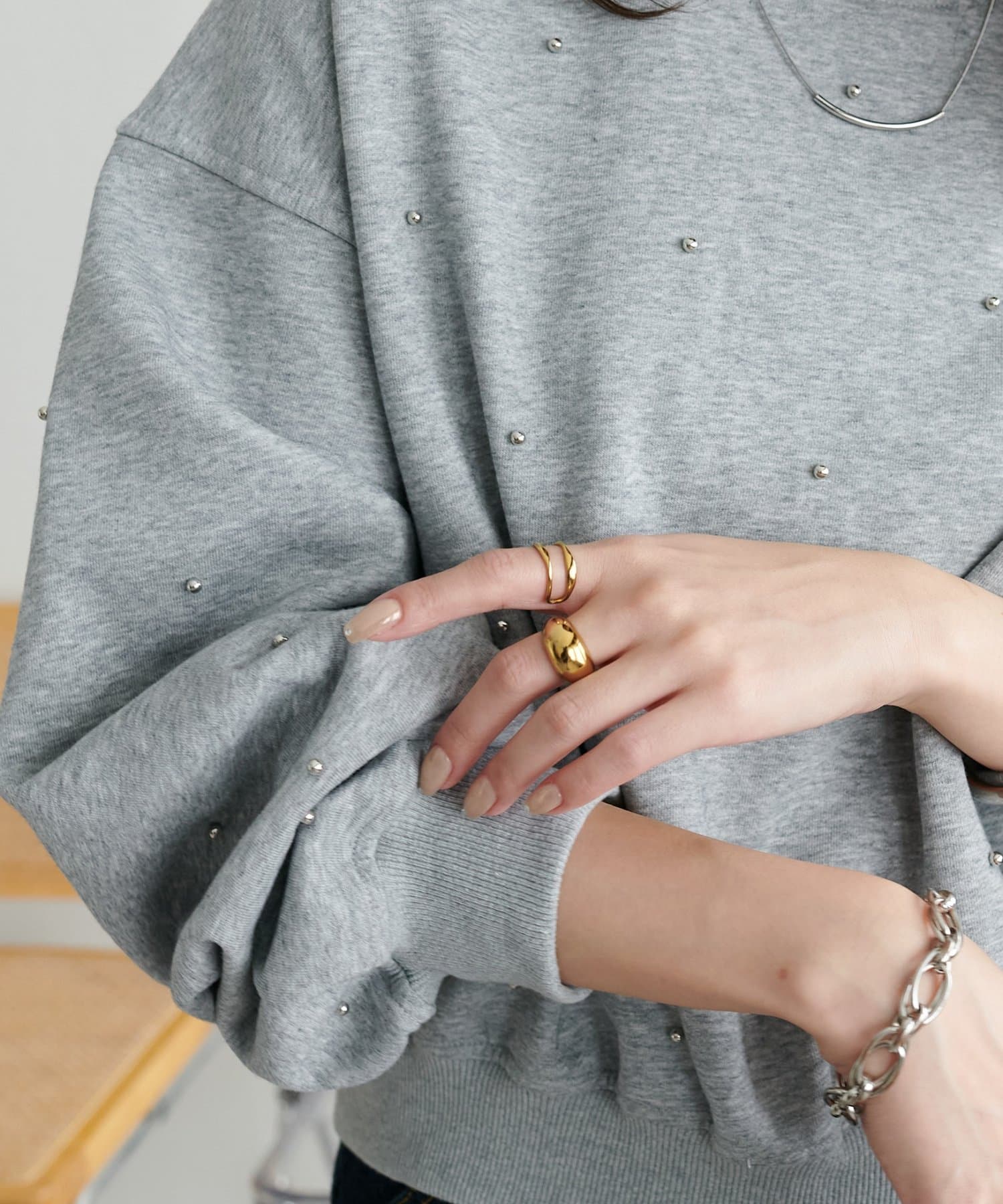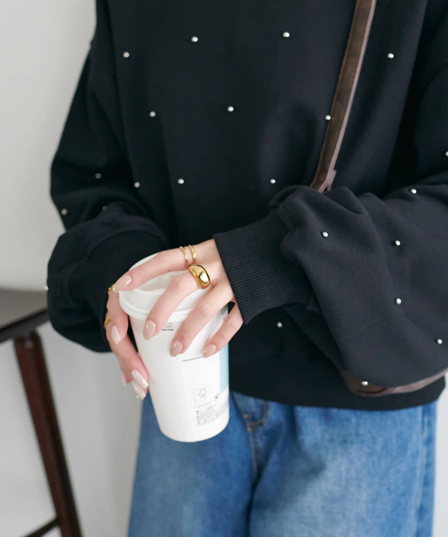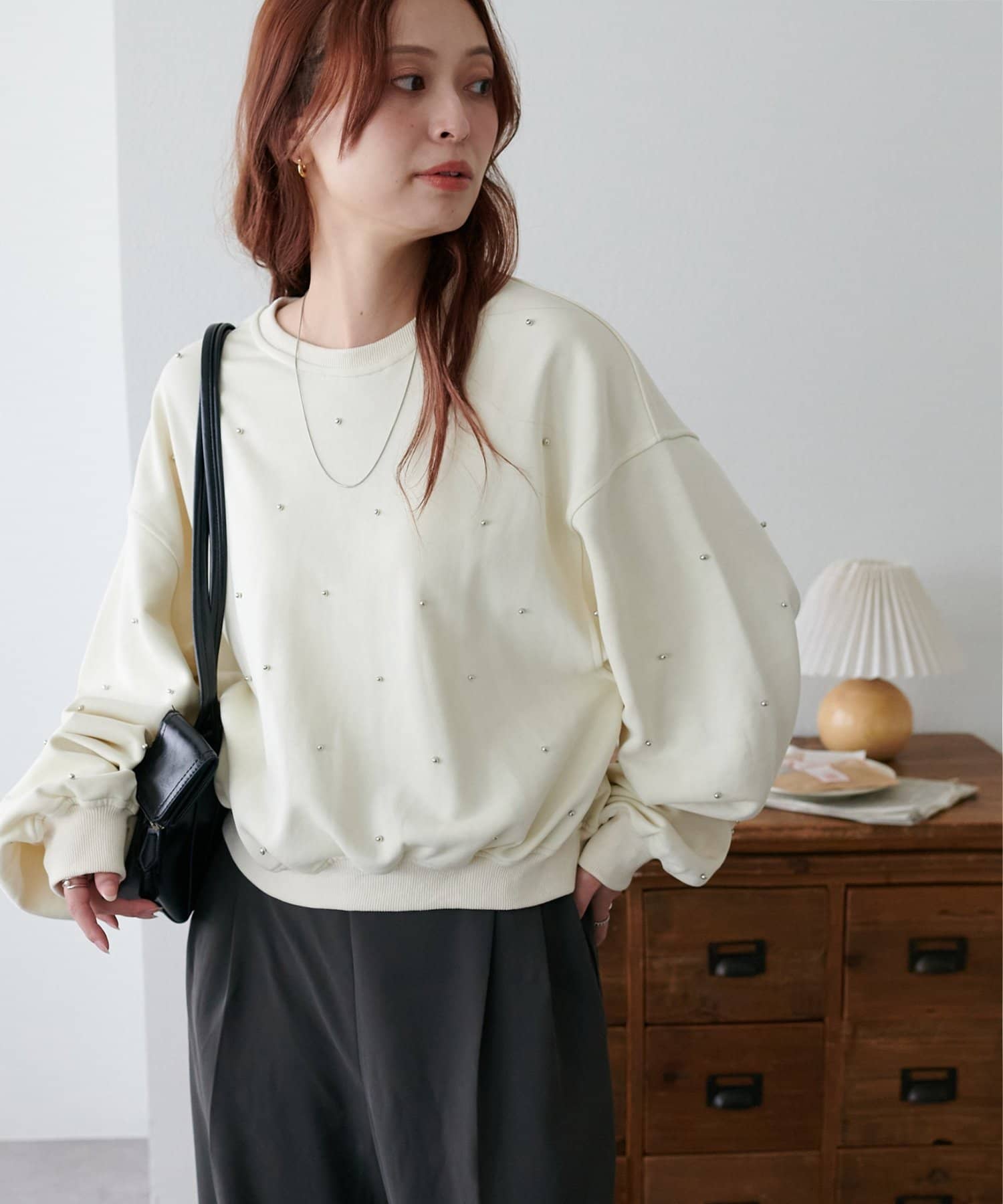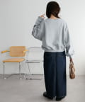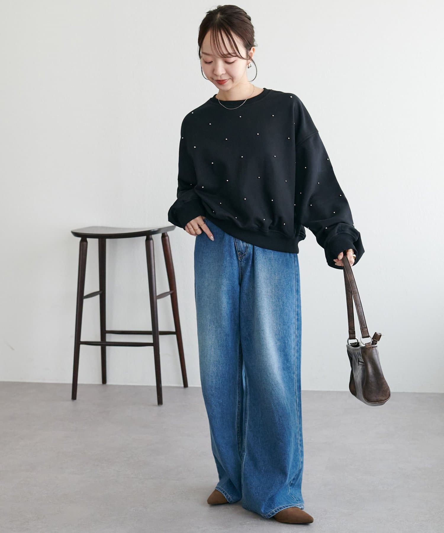 シンプルなスウェットに小さなスタッズを散りばめることで、カジュアルな印象のスウェットながら、さりげない輝きが大人の女性らしさを引き立てます。