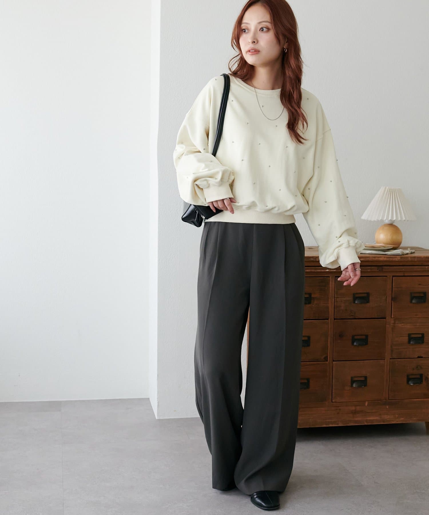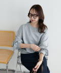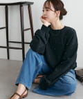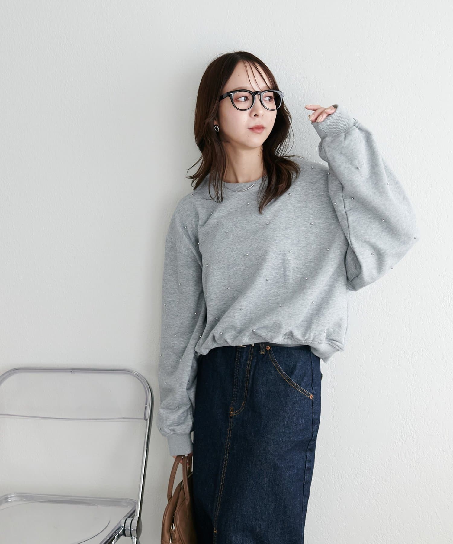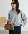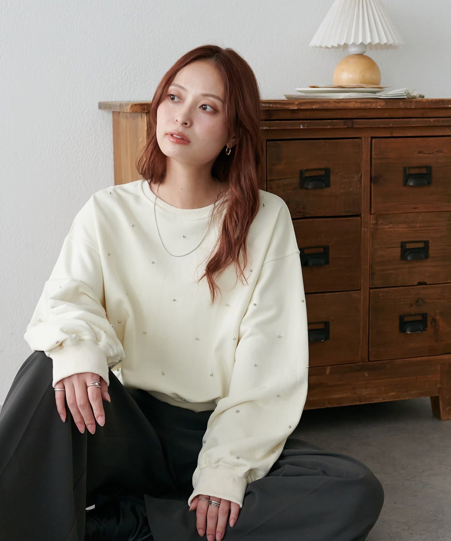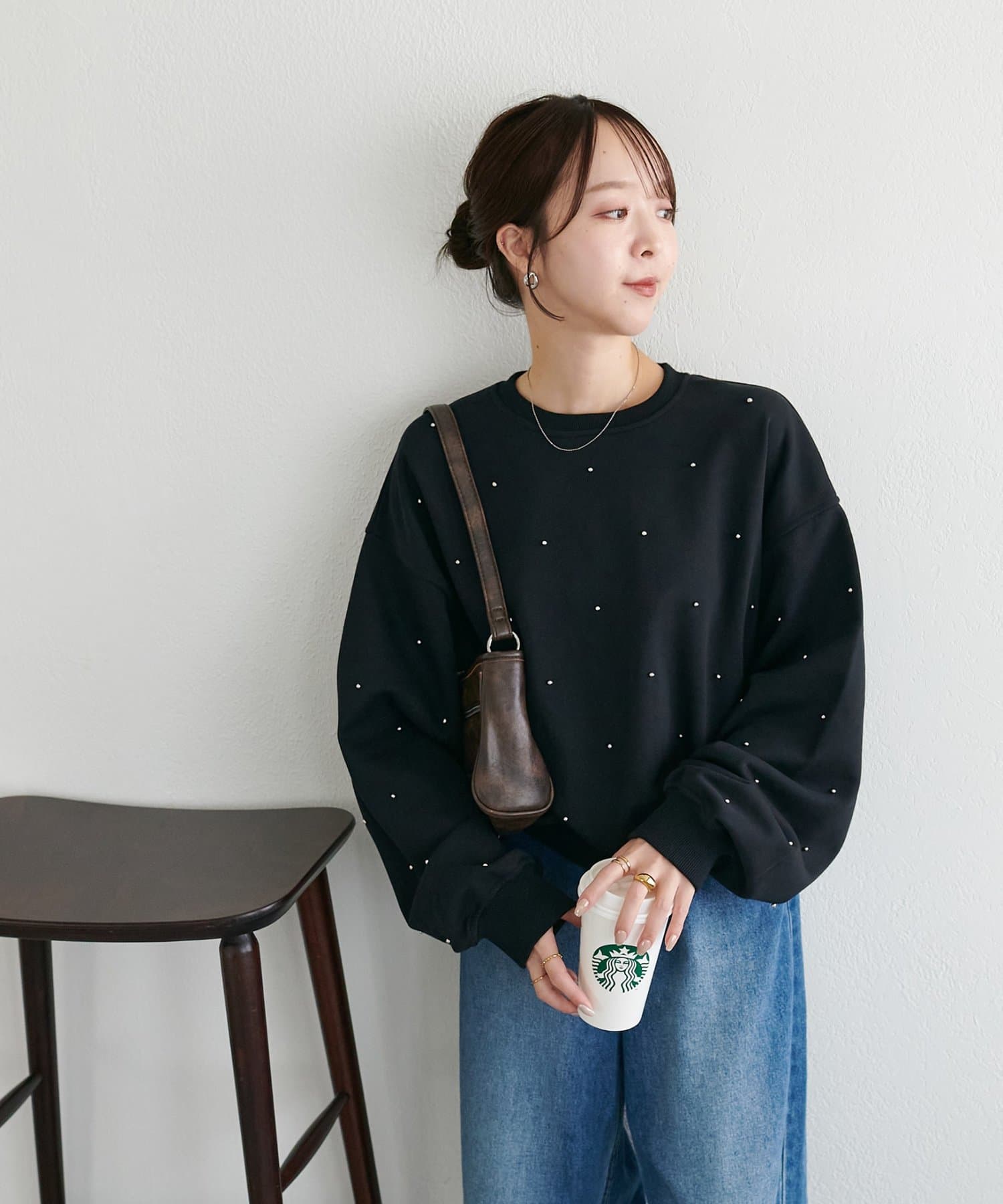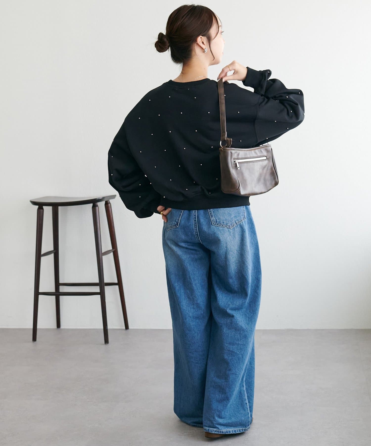 シンプルなスウェットに小さなスタッズを散りばめることで、カジュアルな印象のスウェットながら、さりげない輝きが大人の女性らしさを引き立てます。