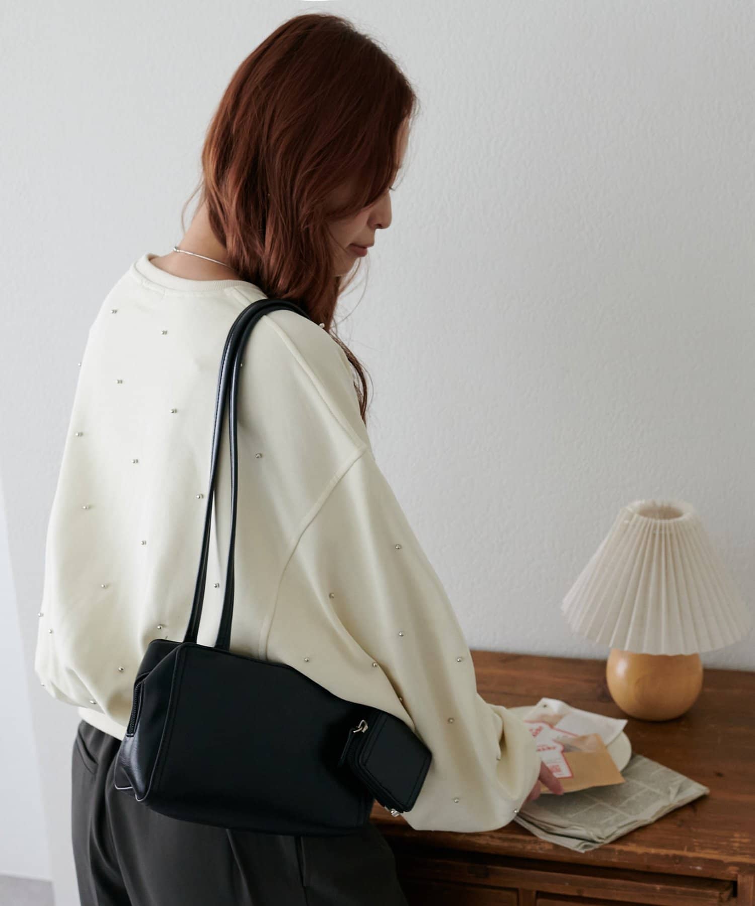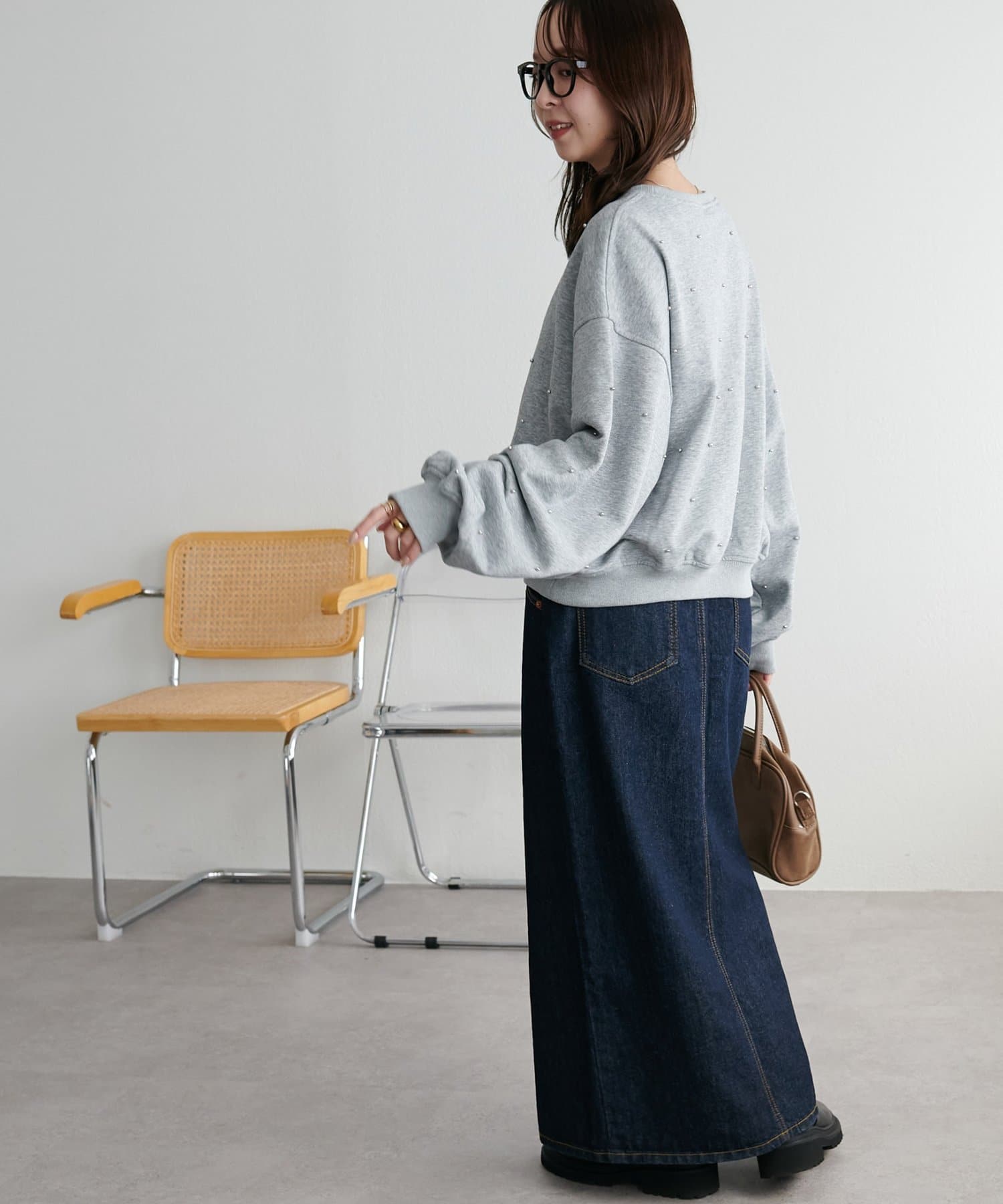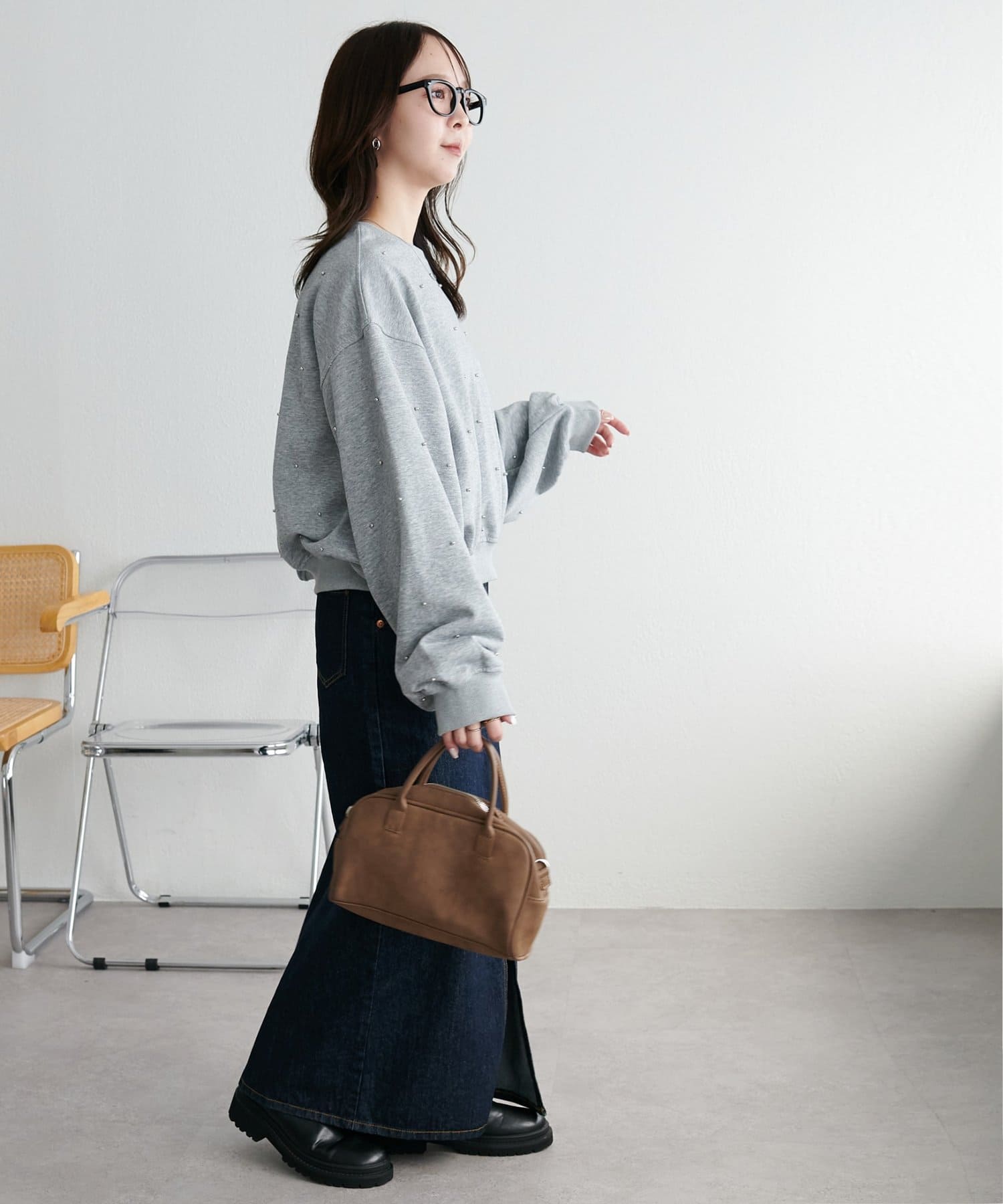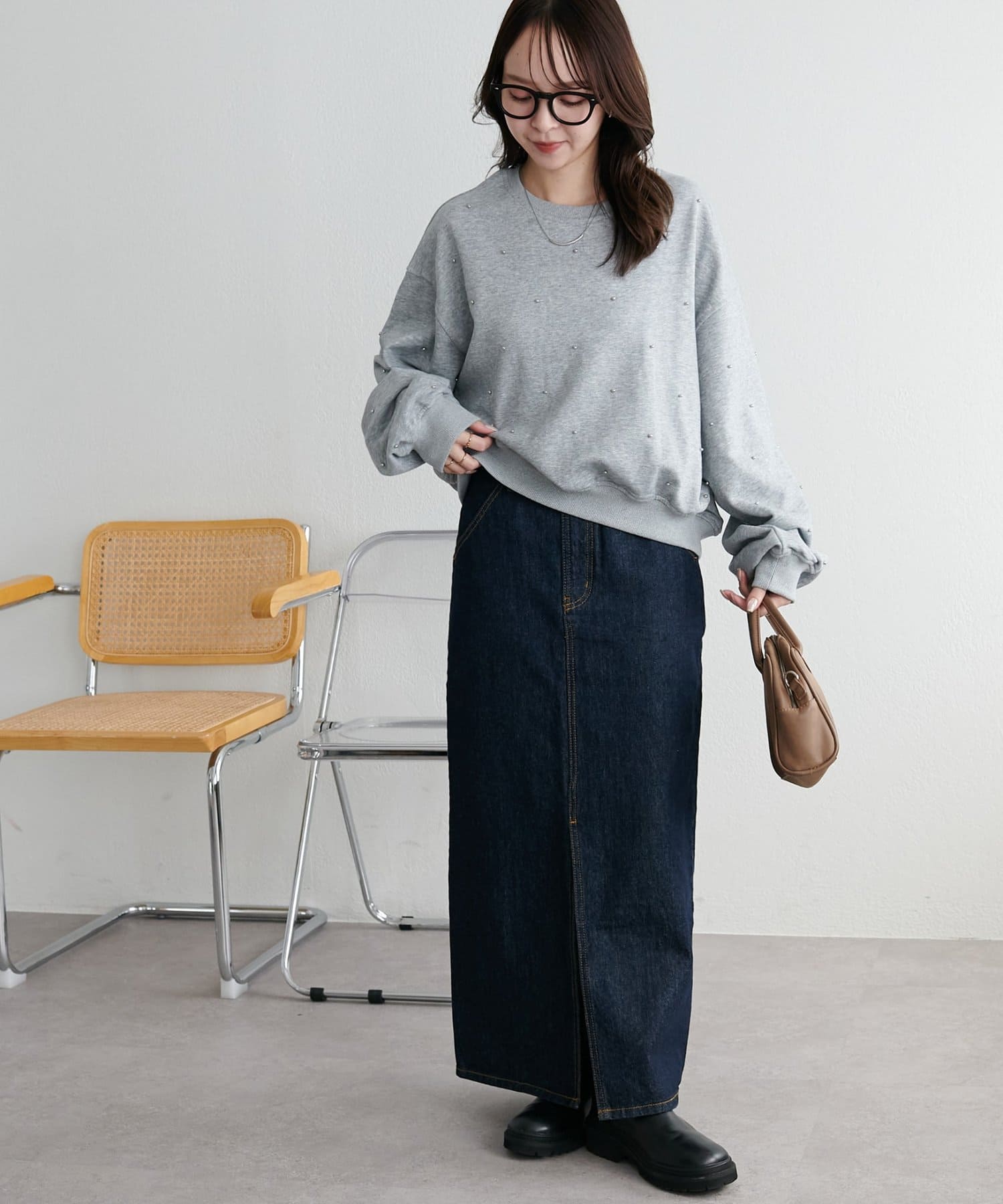 シンプルなスウェットに小さなスタッズを散りばめることで、カジュアルな印象のスウェットながら、さりげない輝きが大人の女性らしさを引き立てます。