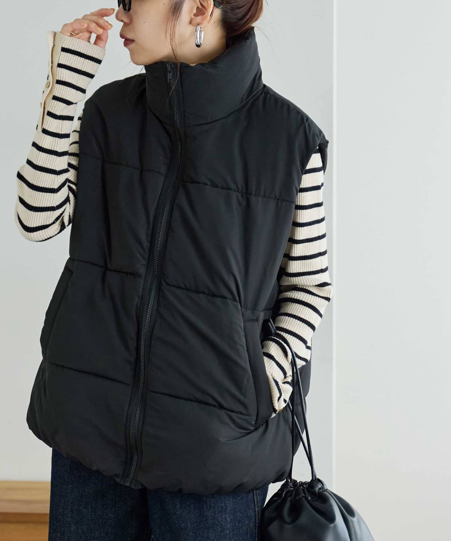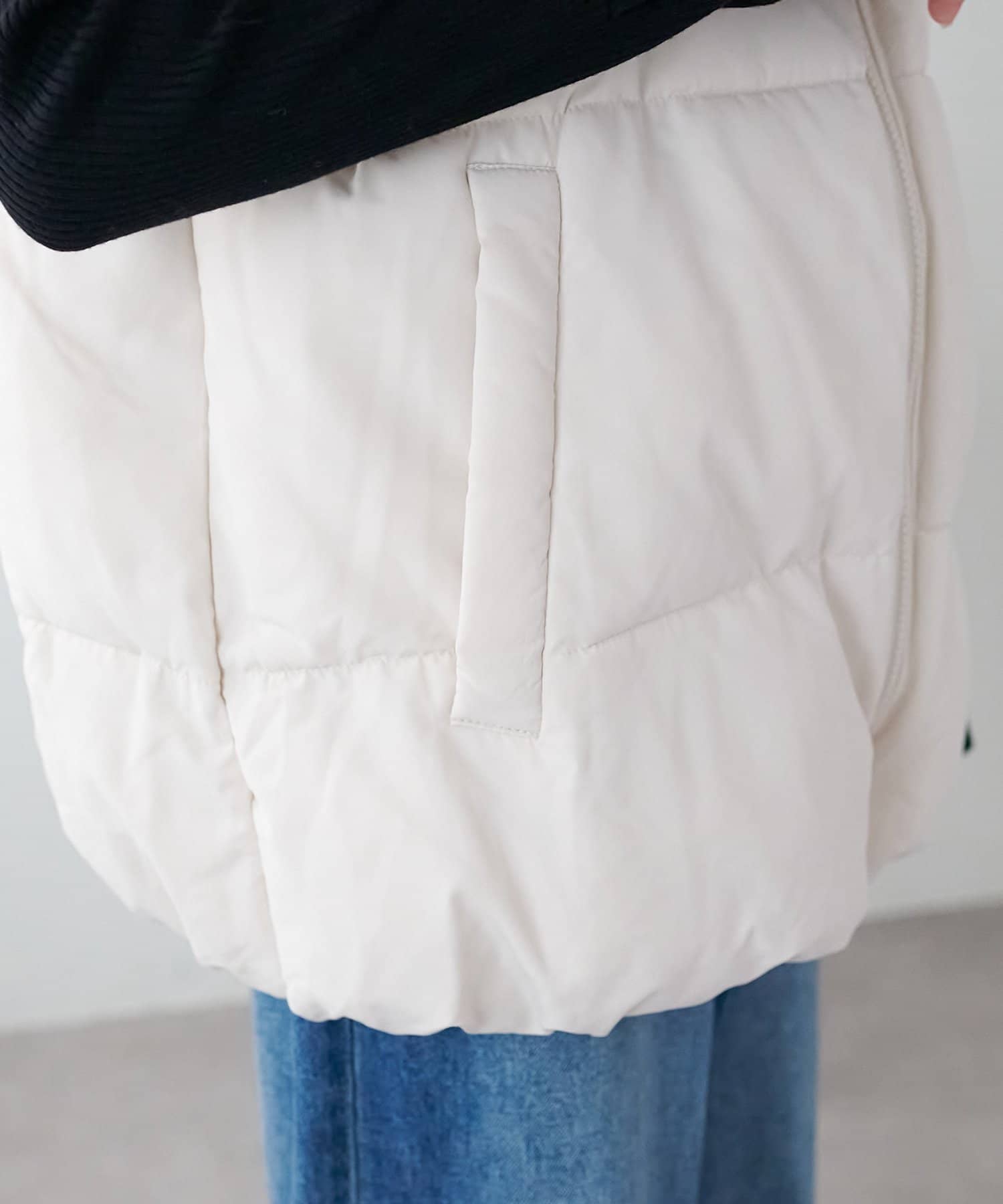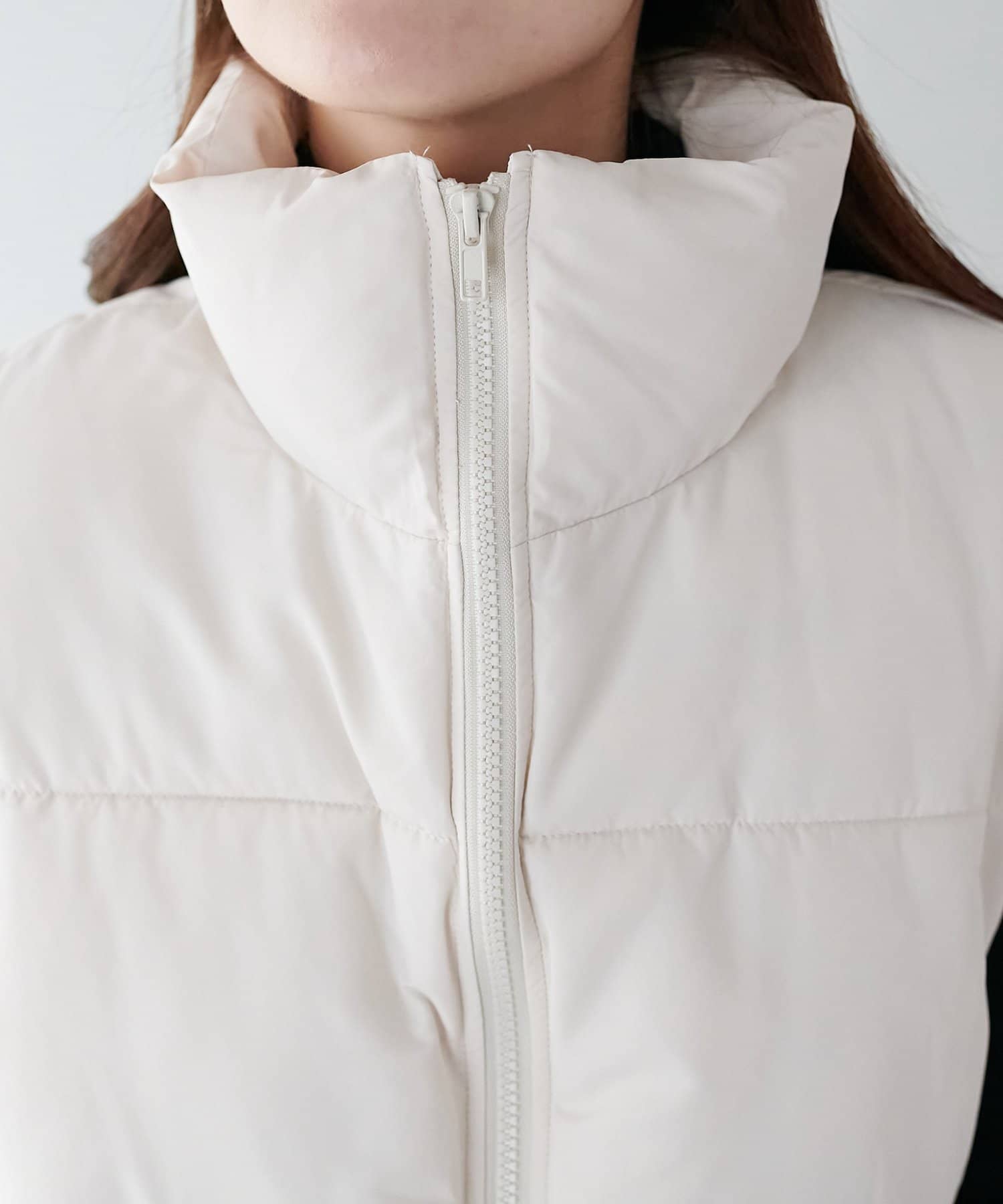 着回しやすさ抜群のスタンドカラーフェイクダウンベスト