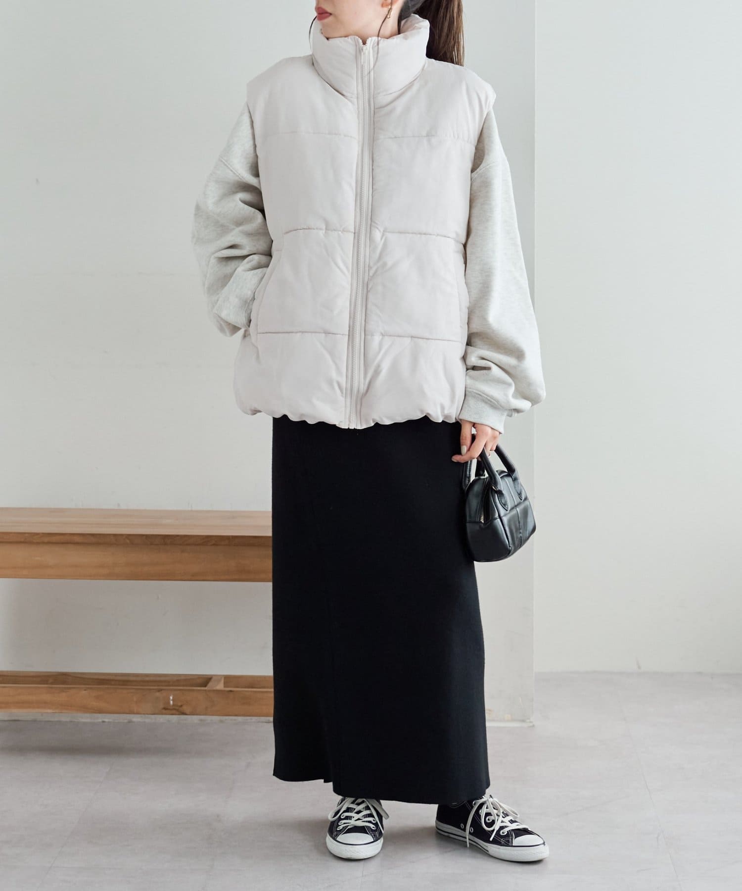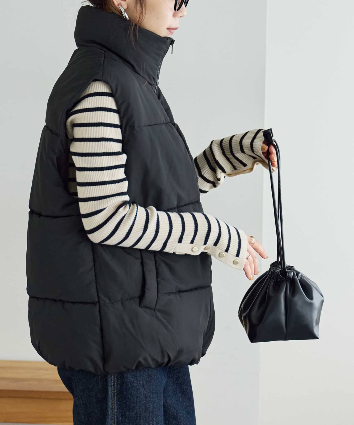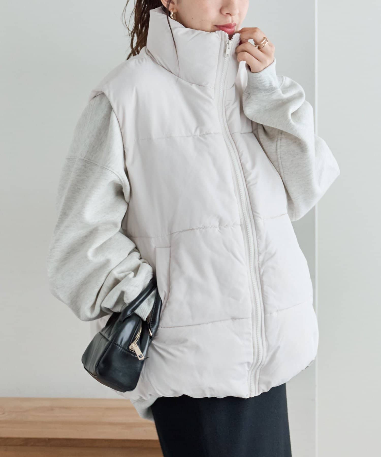 着回しやすさ抜群のスタンドカラーフェイクダウンベスト