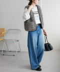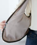 縁に施されたフェイクレザーのパイピングが全体をすっきりと引き締め、ナチュラルながらも大人っぽく着られるデザインに。