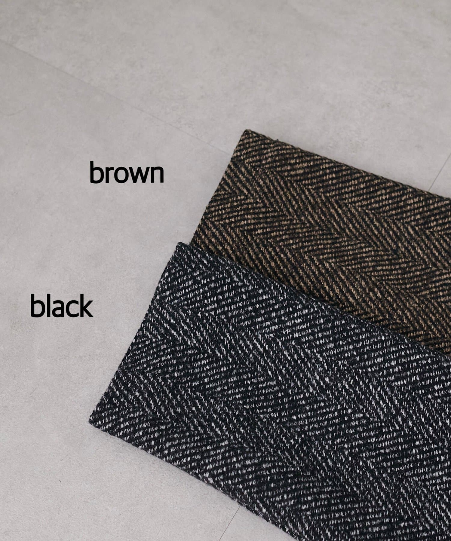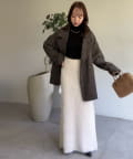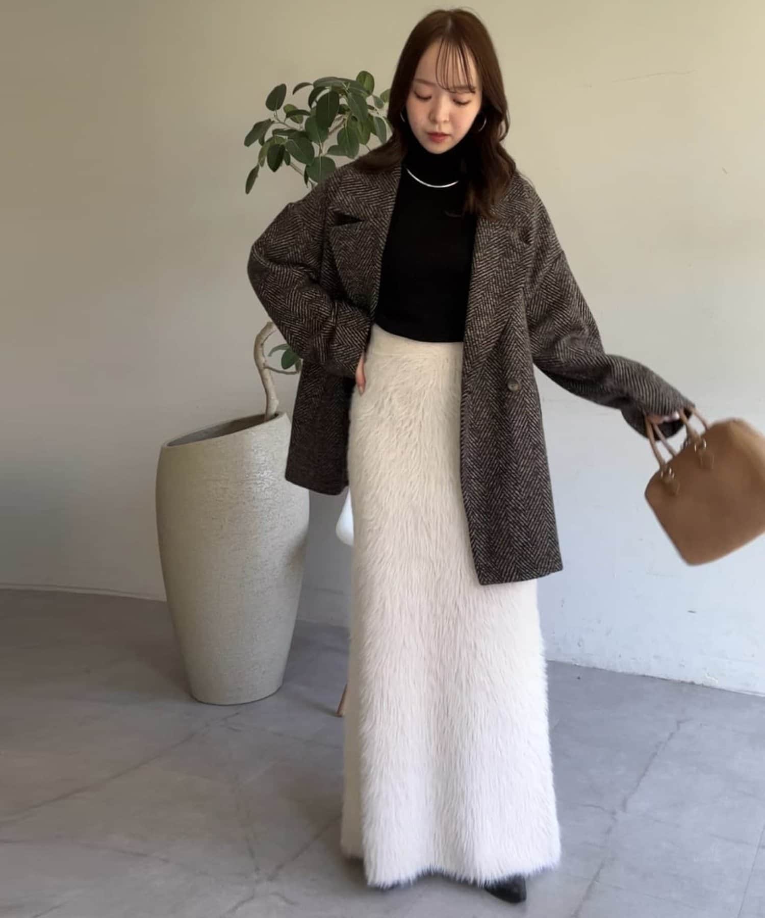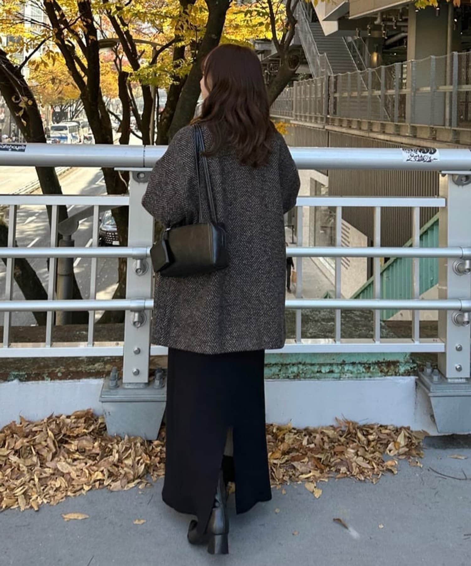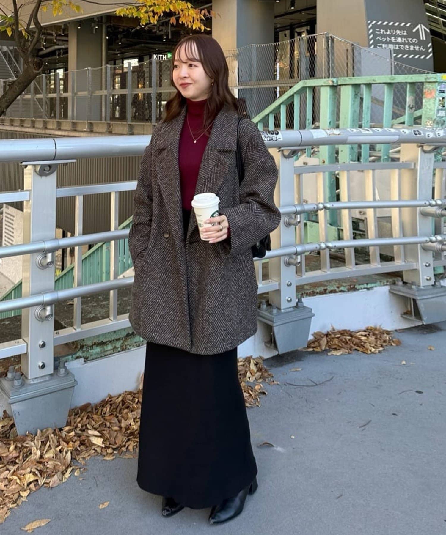 ・ヘリンボーン柄が主役になるため、インナーはシンプルなリブニットや無地トップスがおすすめ