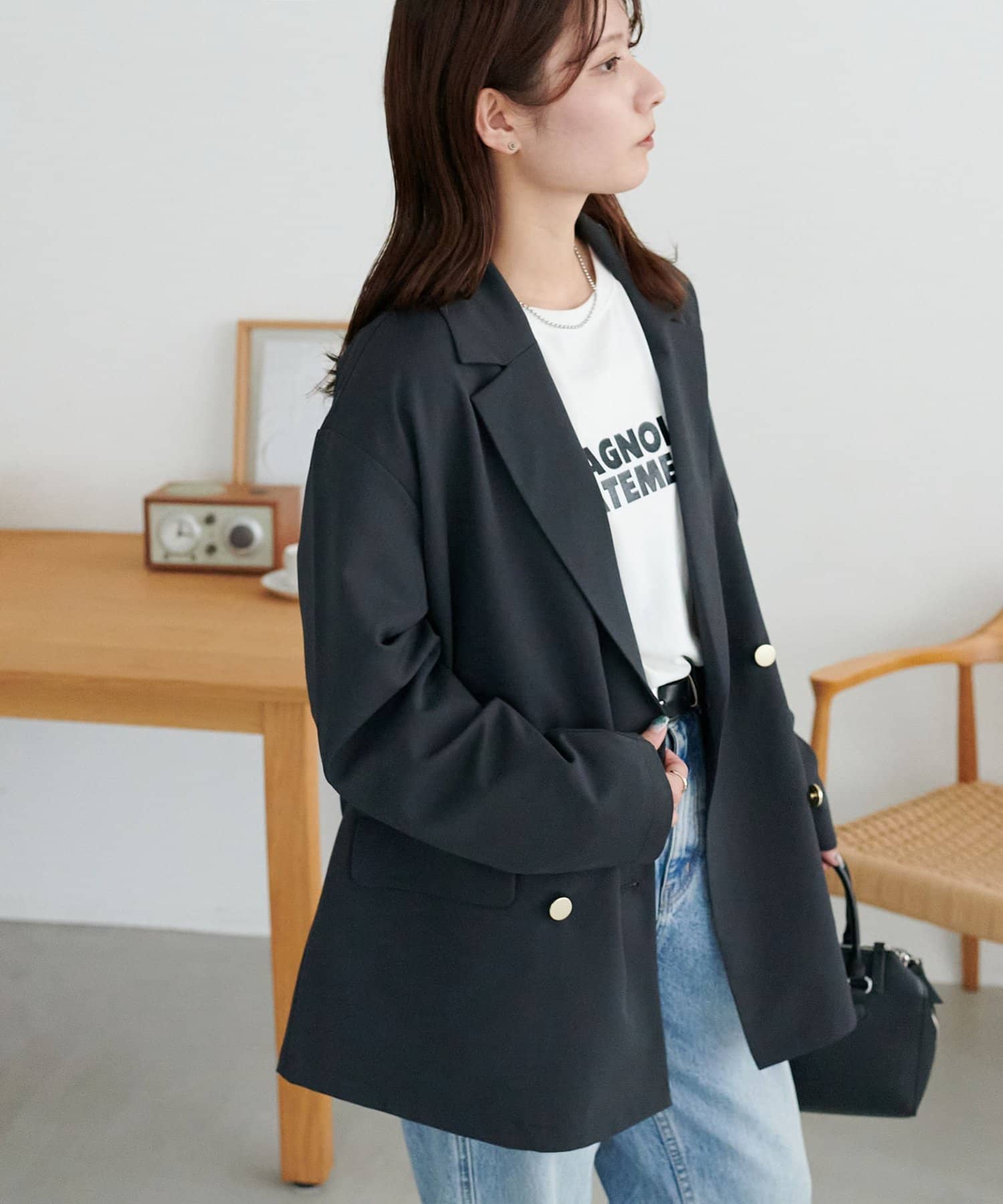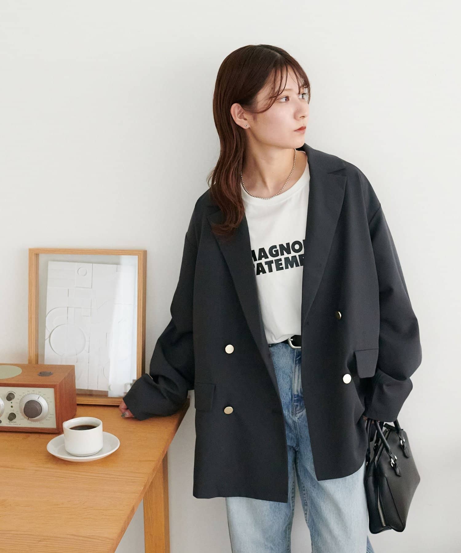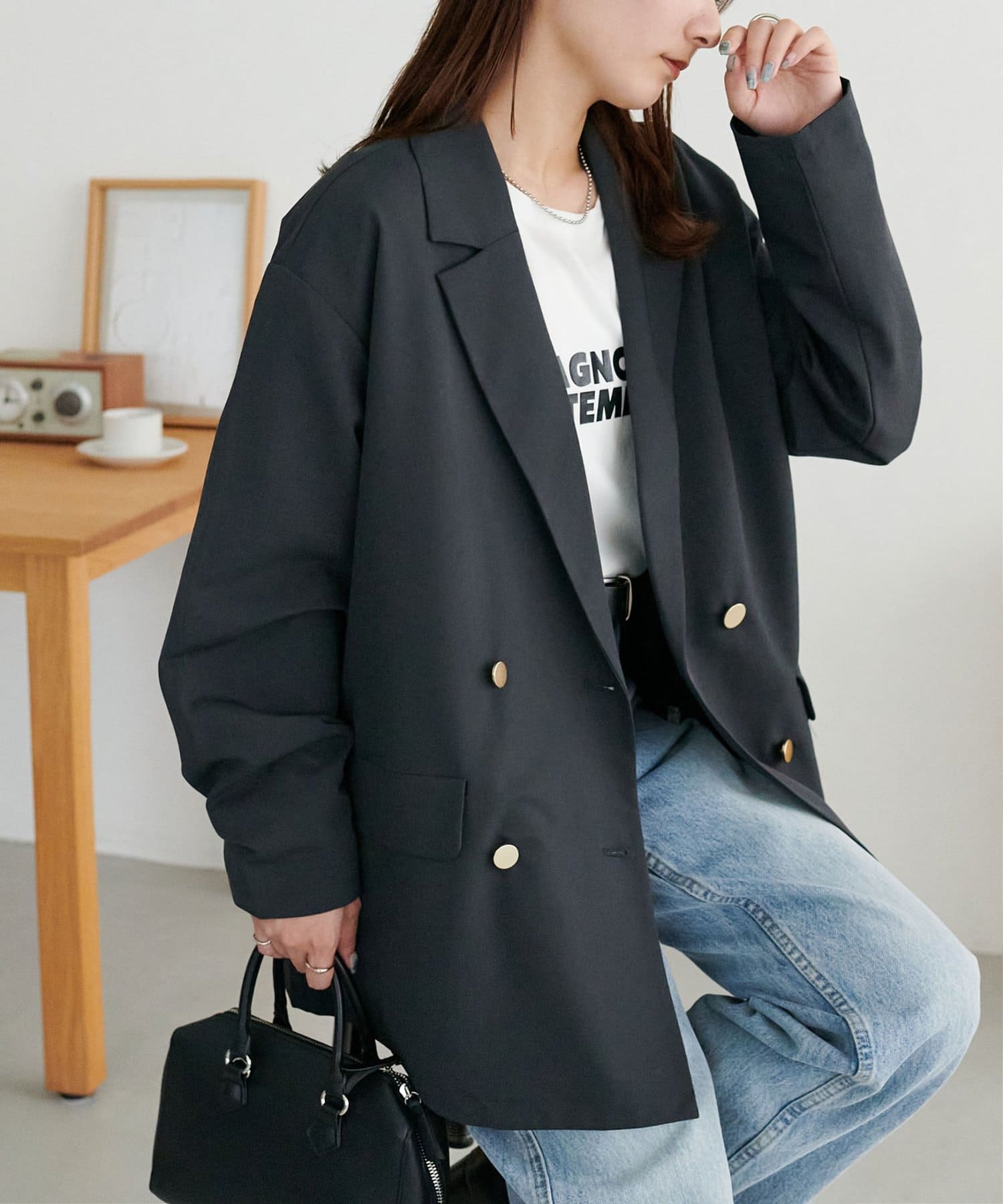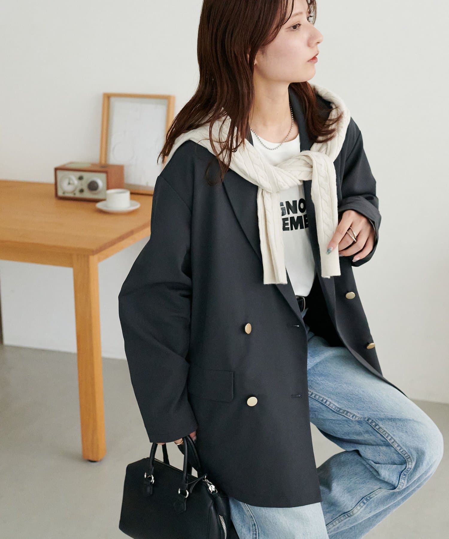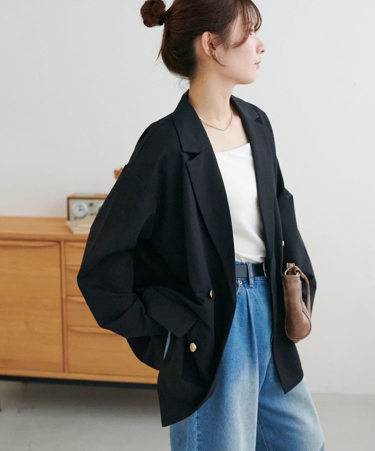 ゆったりとしたシルエットと、金ボタンがアクセントになったテーラードジャケット。